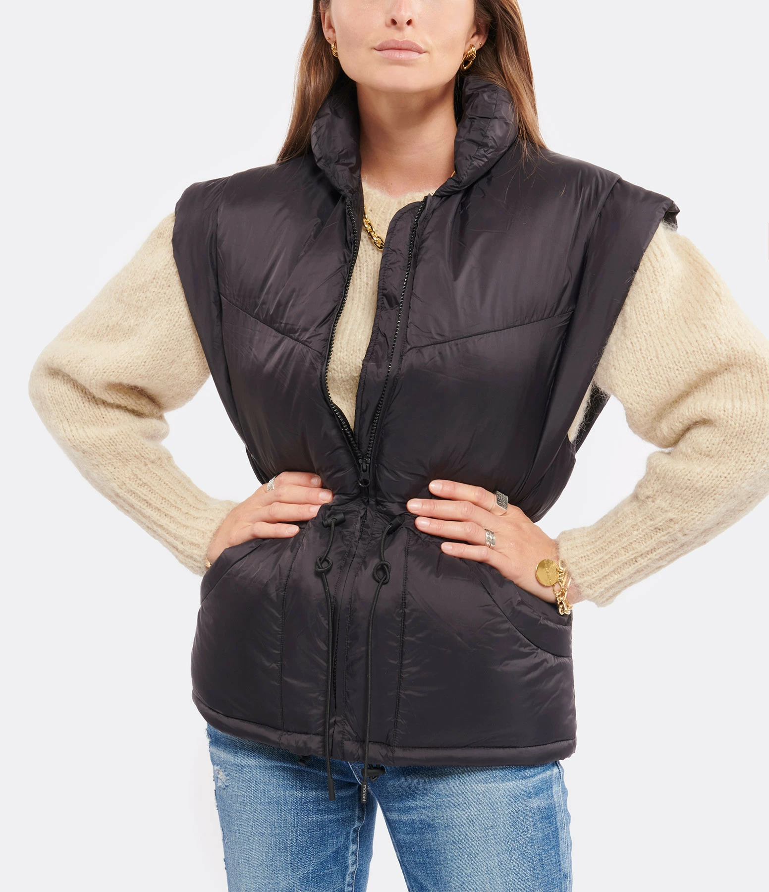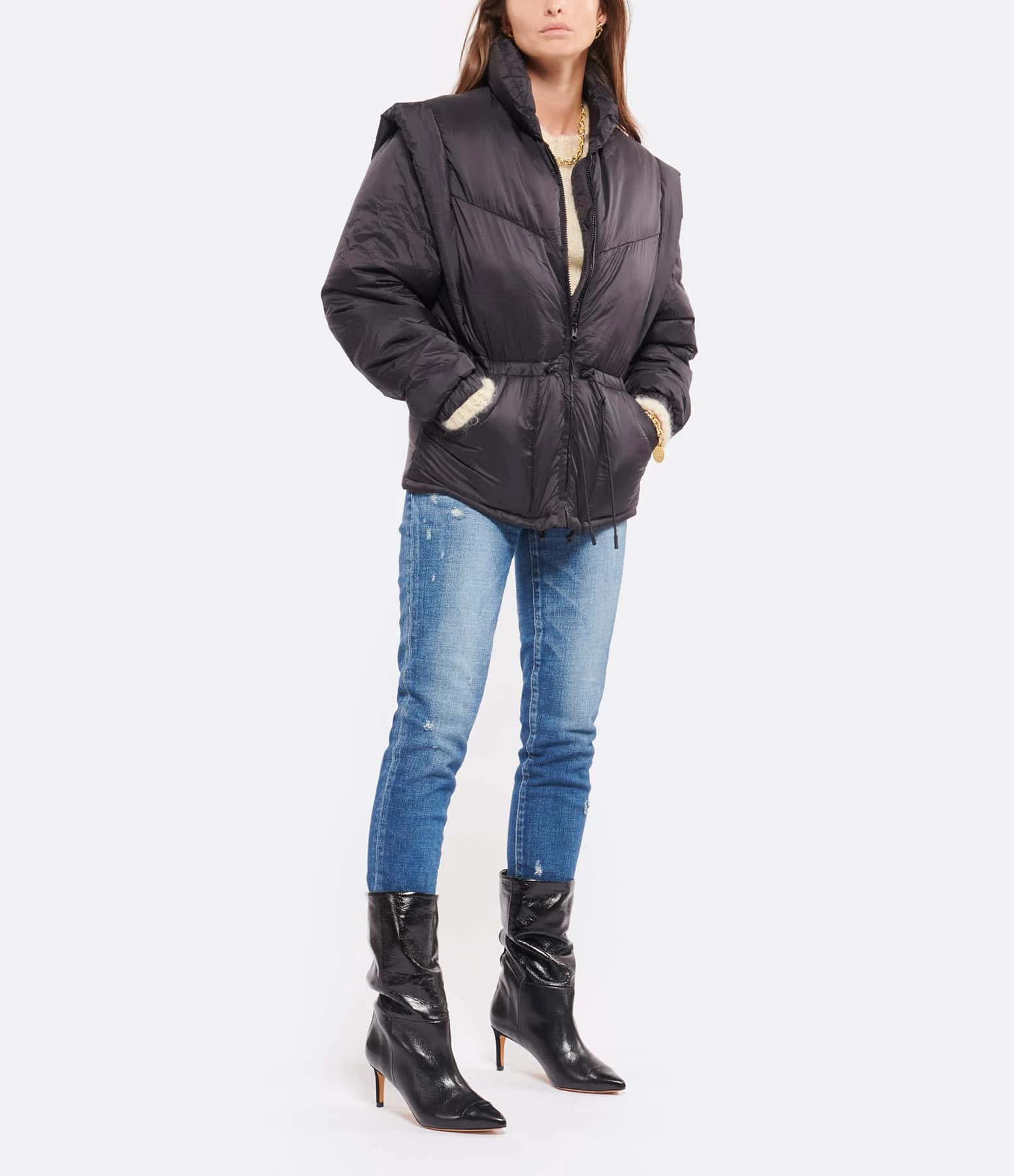 Doudoune coupe-vent légère noire. Manches longues amovibles avec boutons à pression. Col montant sans capuche. Fermeture zippée. Liens de serrage à la taille. Deux poches plaquées latérales.
