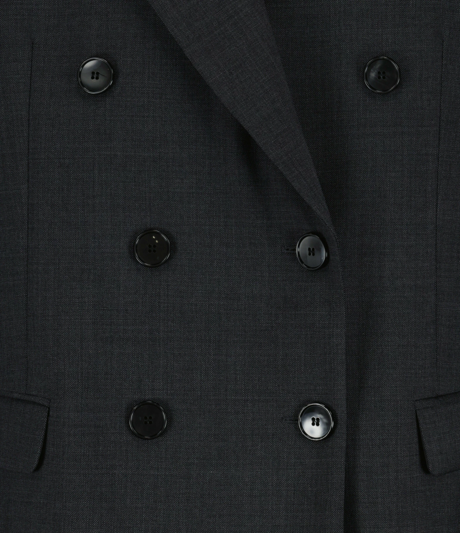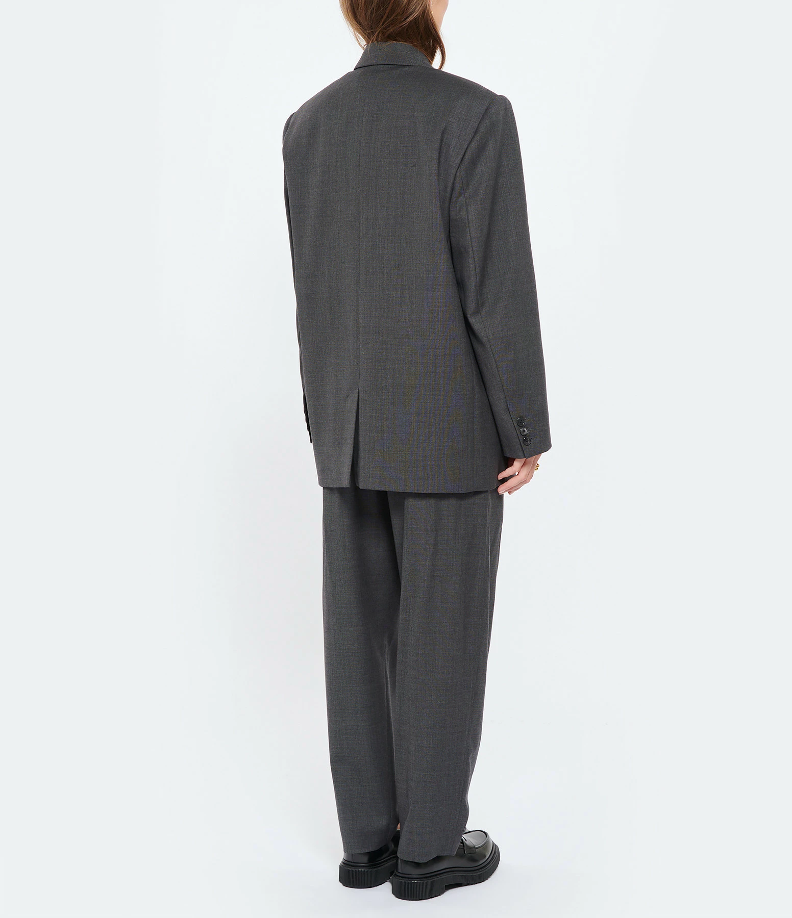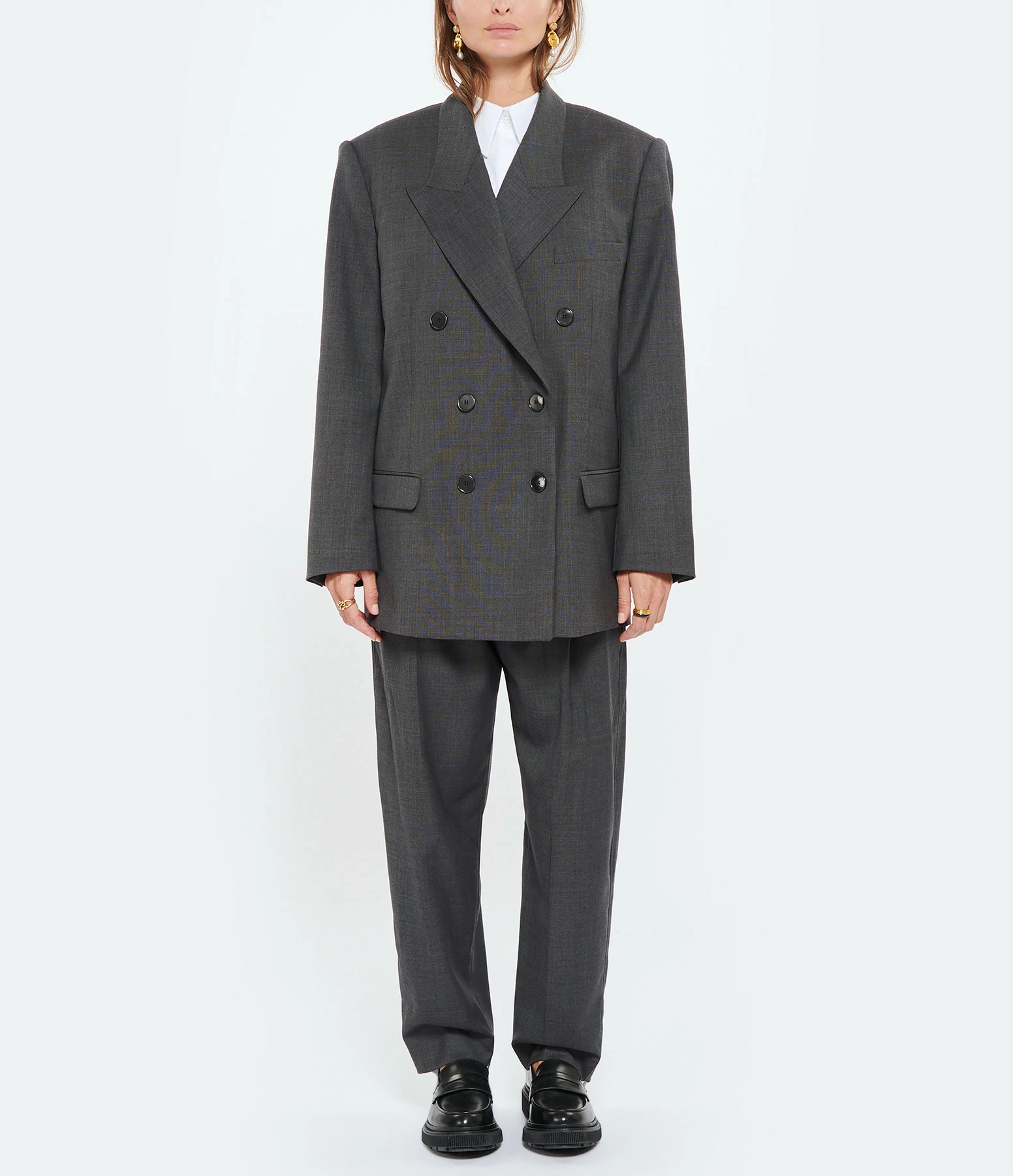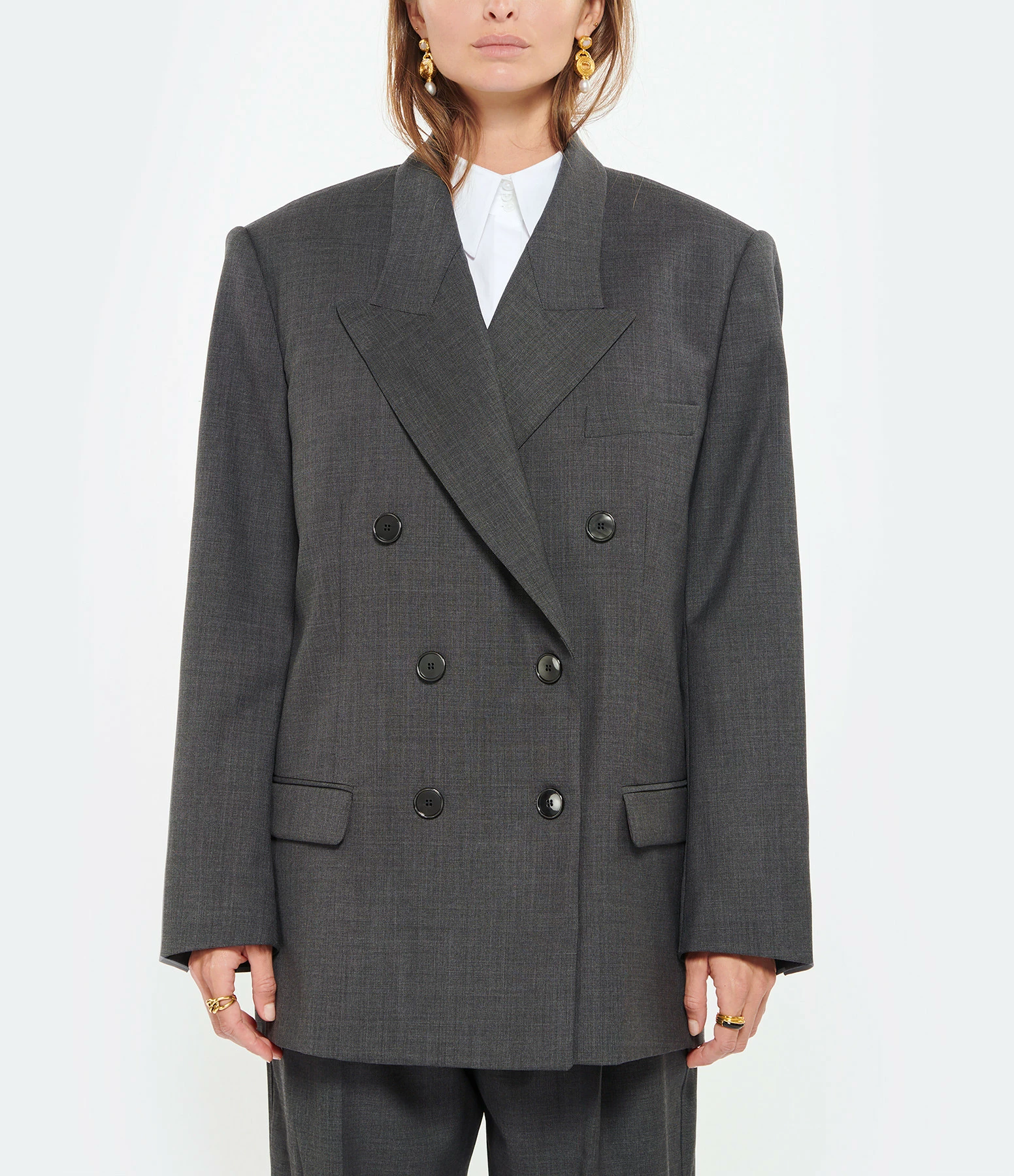 Veste blazer en laine mélangée grise. Col tailleur crantée. Épaulettes. Manches longues tailleur avec fentes et poignets boutonnés. Une poche passepoilée poitrine et deux poches à rabat sur le devant. Une poche passepoilée intérieure. Fermeture boutonnée double. Fente milieu dos. Coupe ample. Base droite.