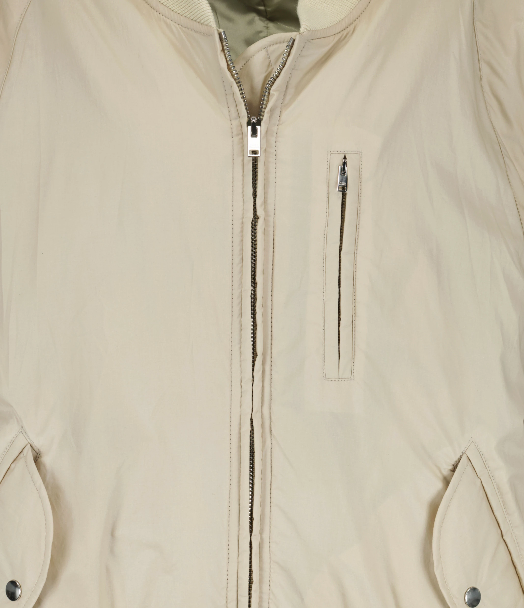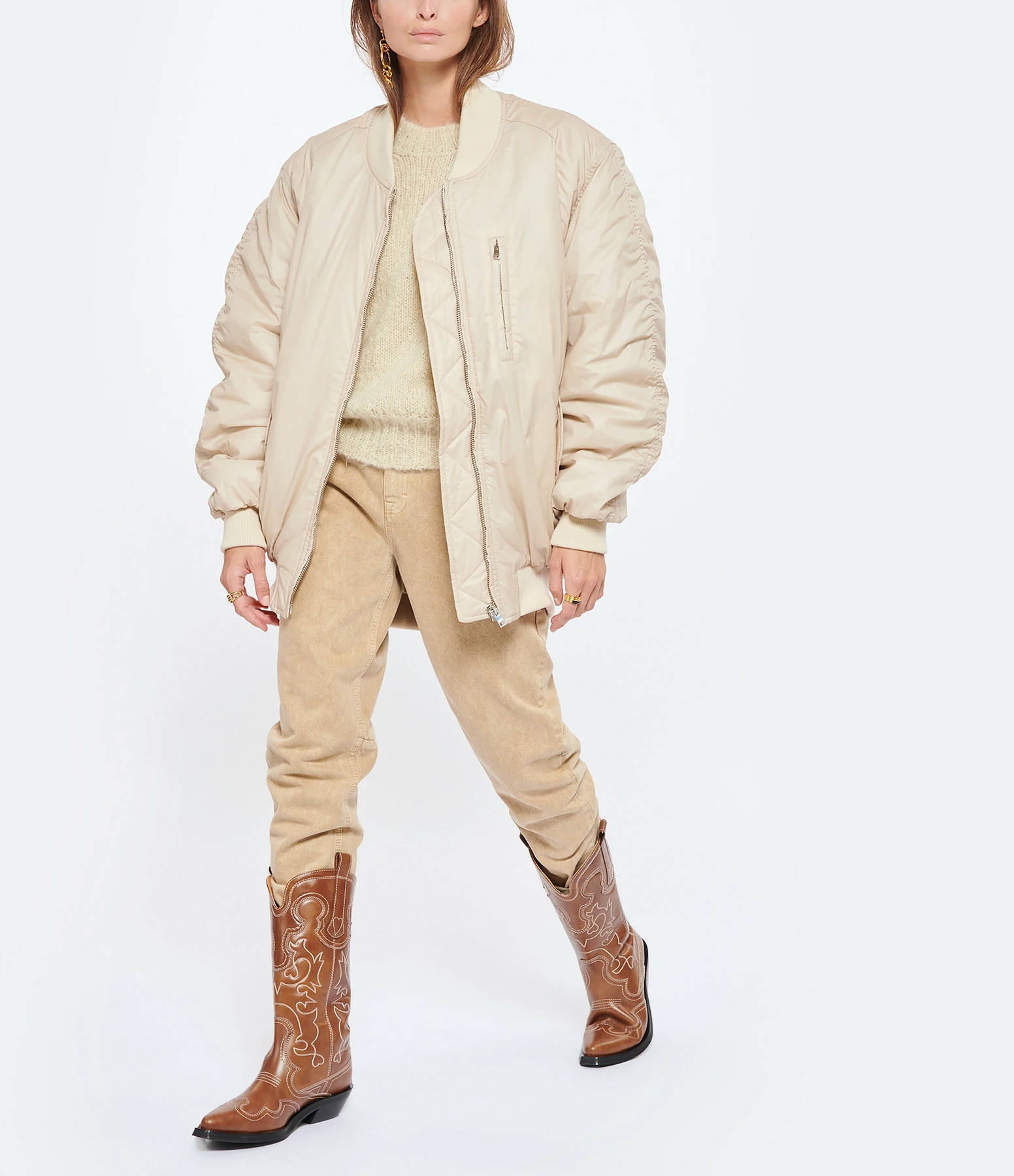 Veste coute bomber rembourrée en coton écru. Col teddy en maille côtelée. Manches longues avec poignets en maille côtelée. Détails de fonces le long des manches et des coutures latérales et milieu dos. Fermeture zippée sur le devant. Une poche zippée et deux poches à rabat pressionné sur le devant. Une poche raglan pressionné intérieure. Coupe bomber. Base droite côtelée. Doublée.