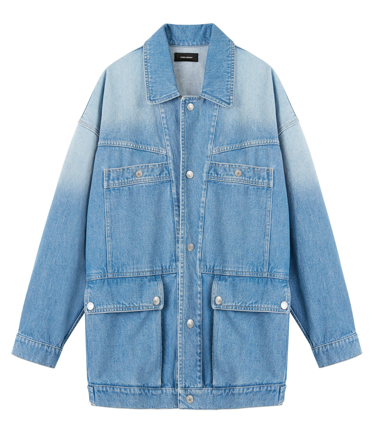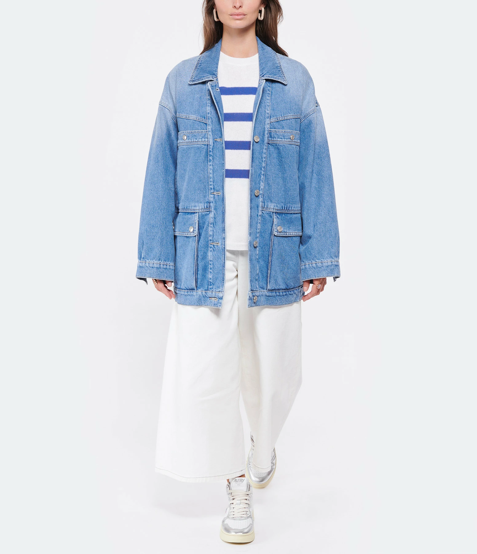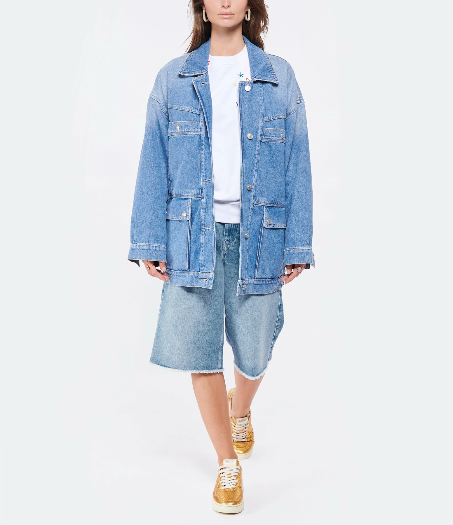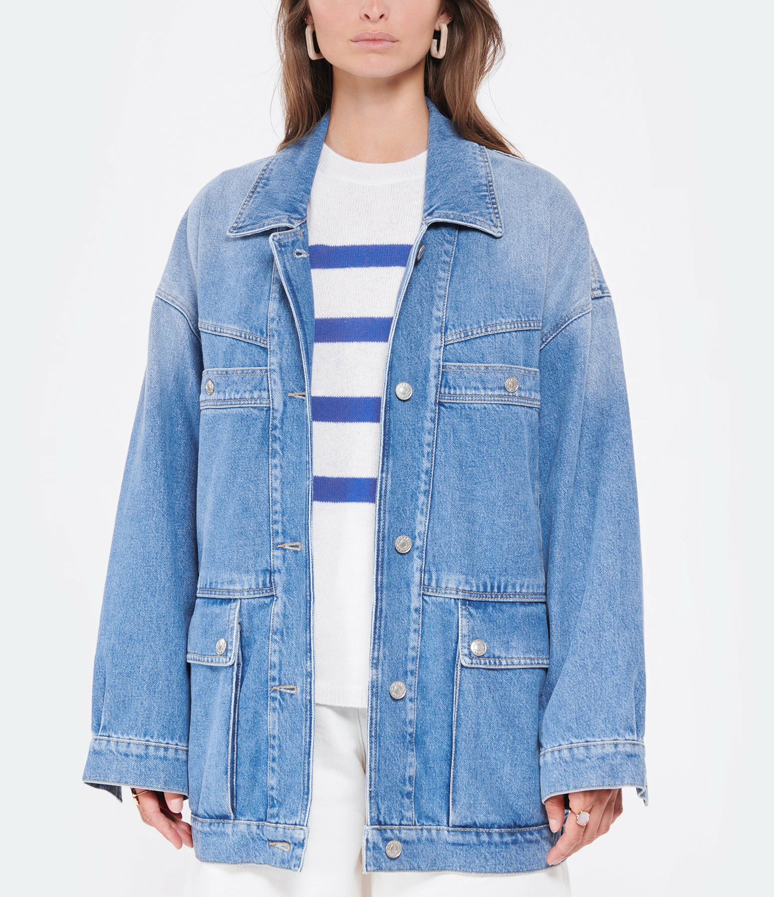 Veste oversize en denim bleu. Manches longues. Fermeture boutonnée. Deux poches plaquées avec bouton et deux poches plaquées à rabats à l’avant. Coupe ample et longue. Base droite.