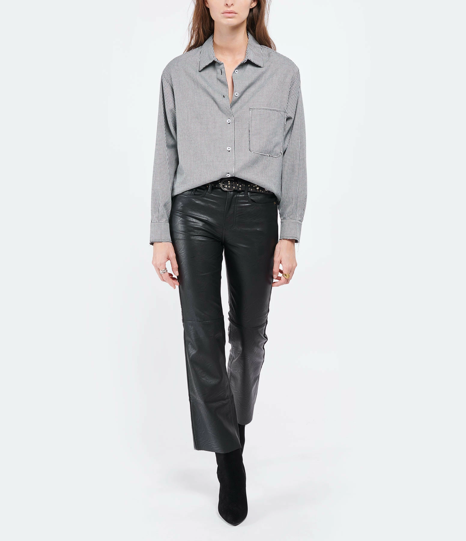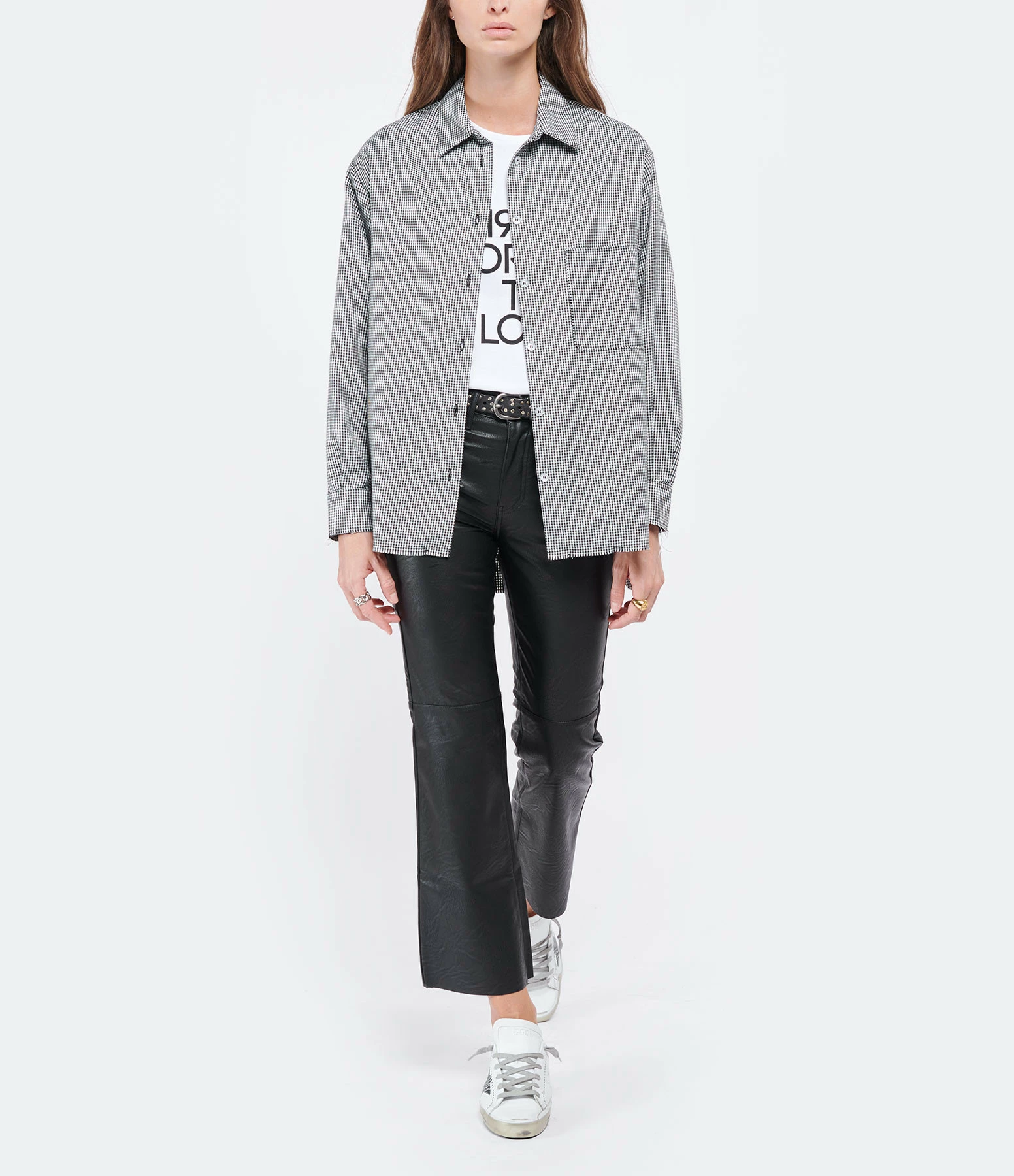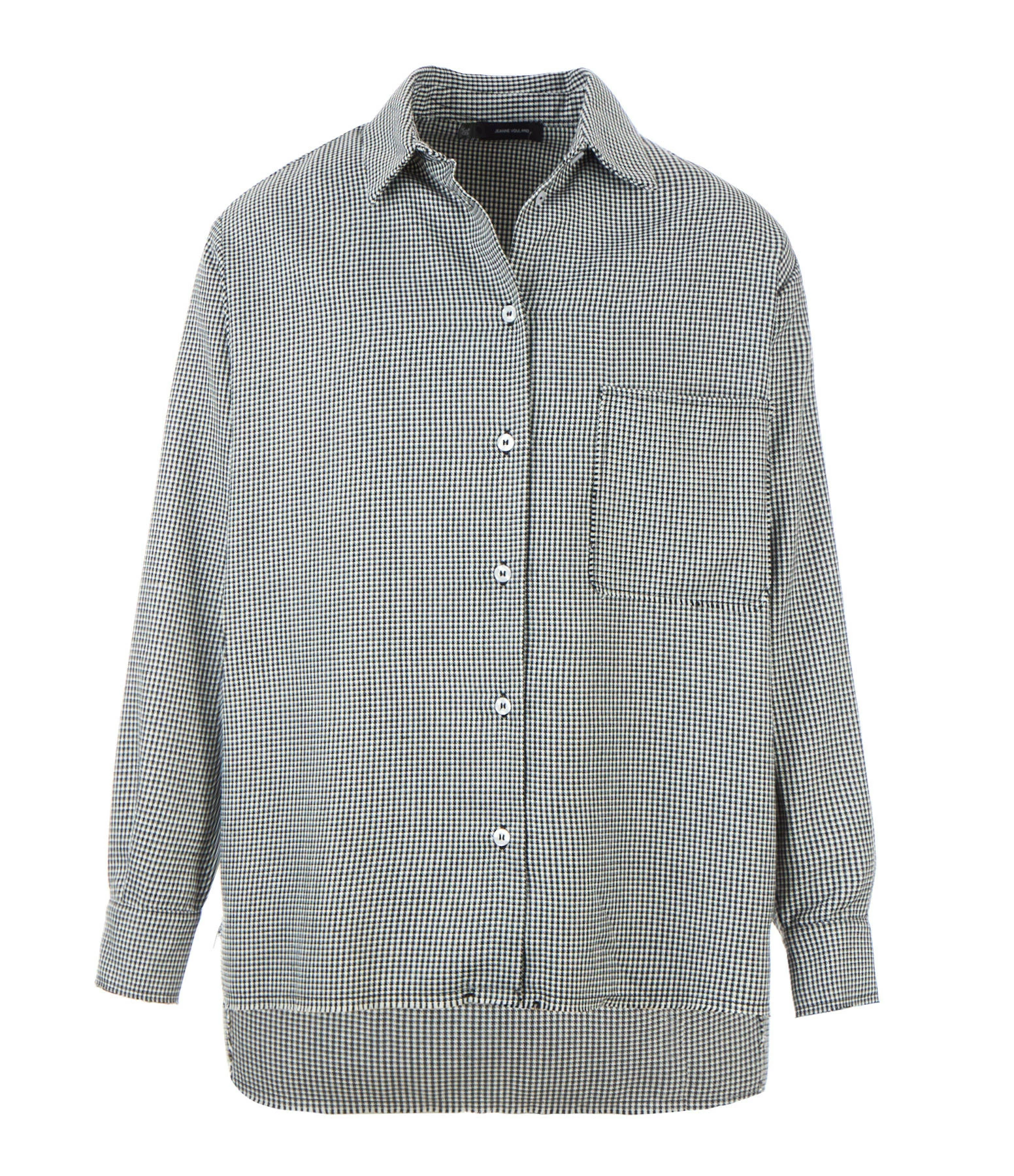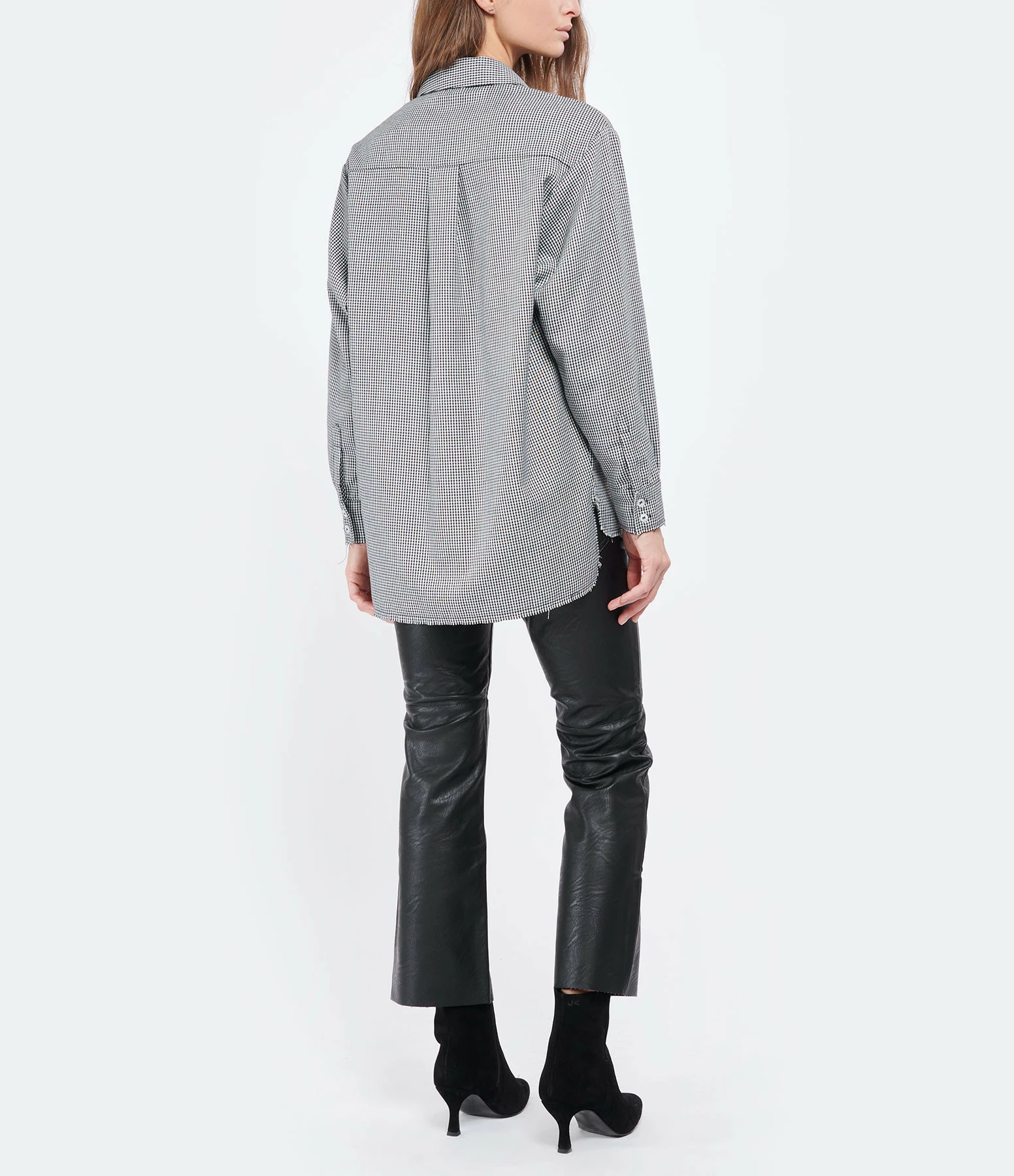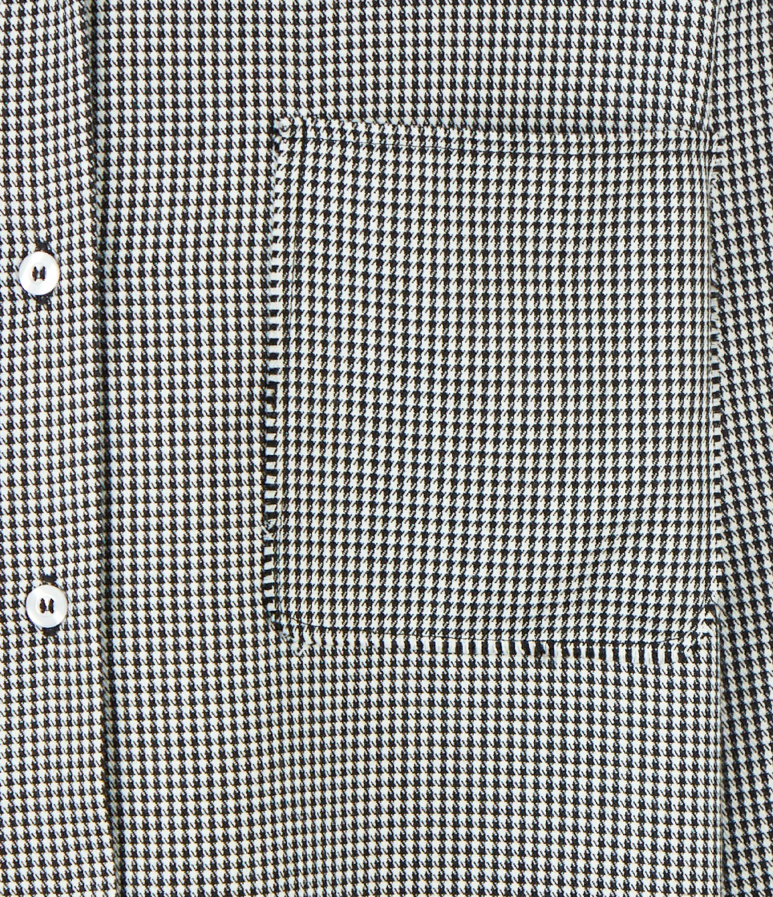 Chemise à motif pied de poule noir et blanc. Col chemise. Manches longues. Une poche plaquée poitrine. Fermeture boutonnée. Bords coupés à cru, frangés. Coupe loose. Base droite, plus longue à l’arrière.