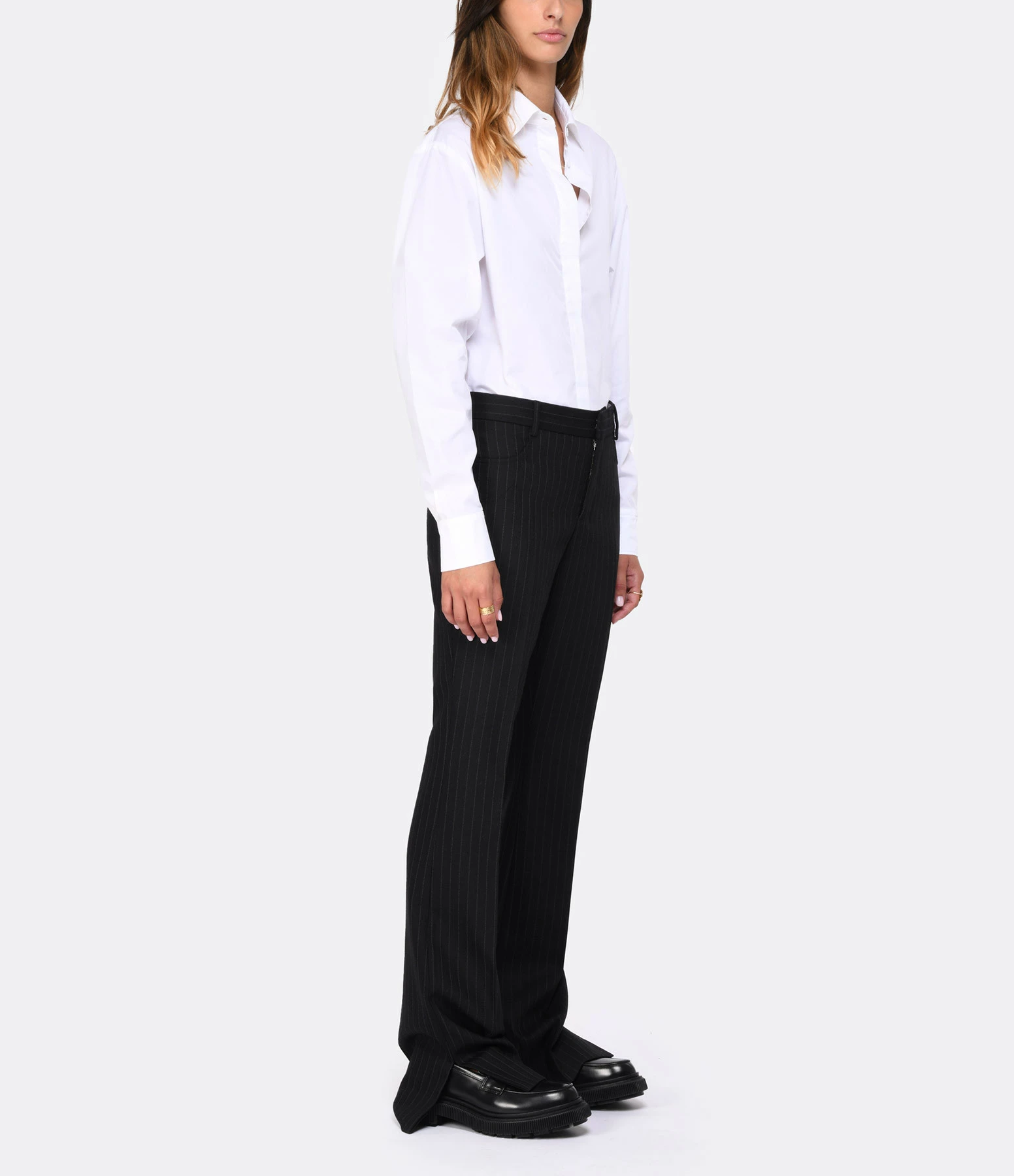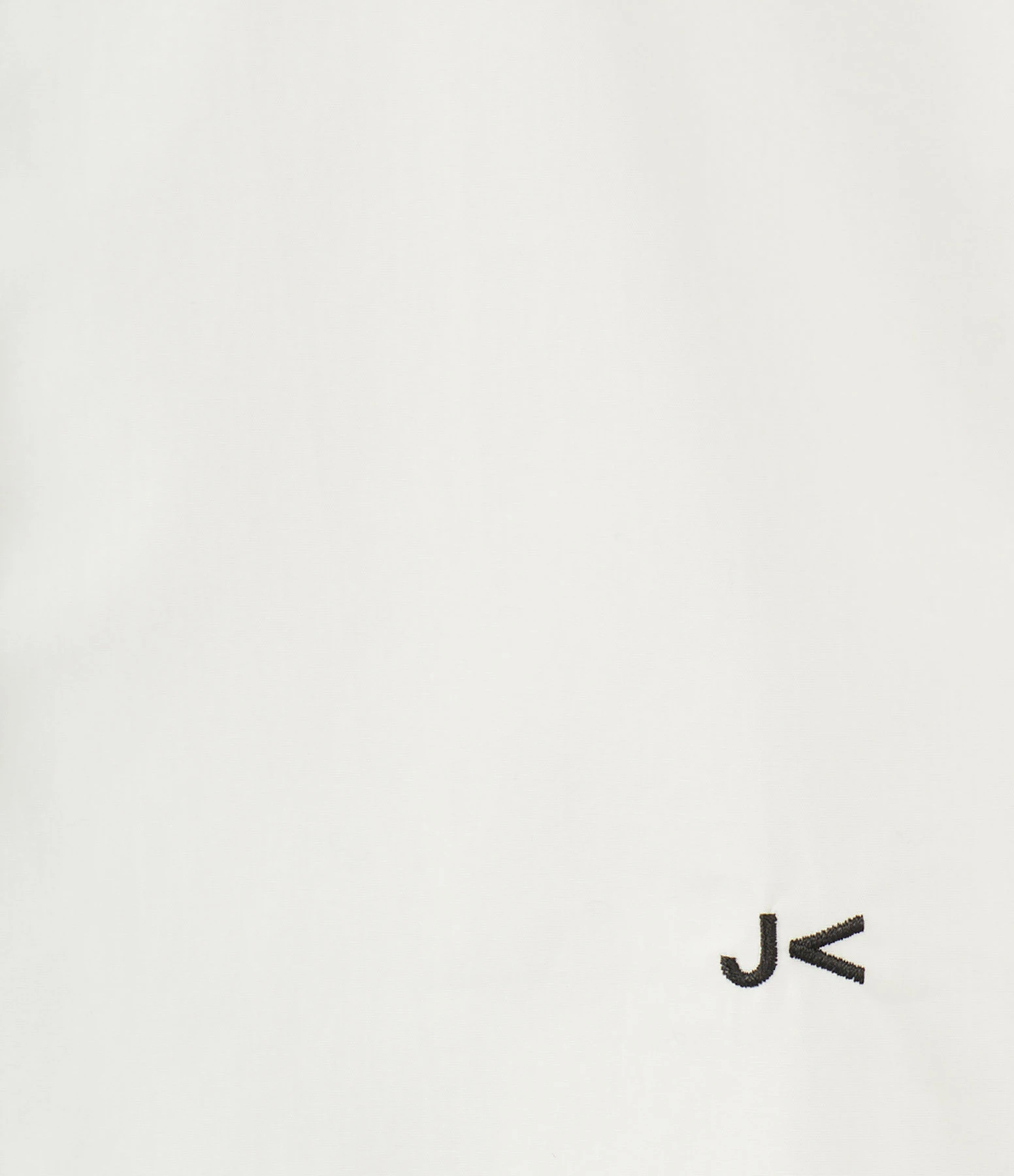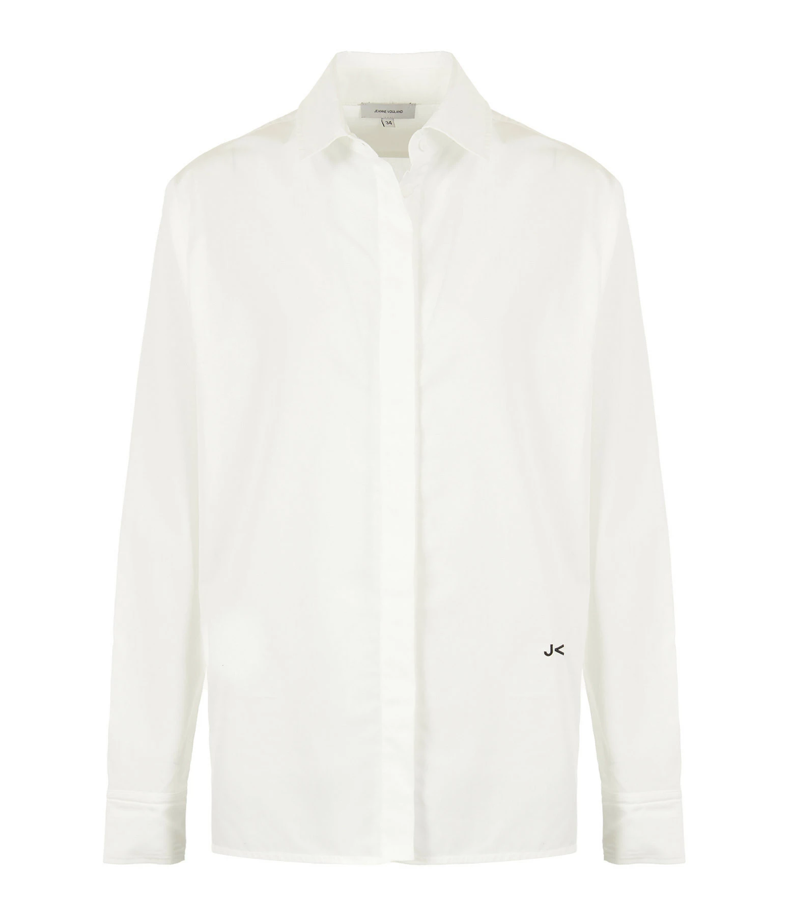 Chemise en coton blanc. Logo brodé en noir sur le devant, en bas à gauche. Col chemise. Manches longues avec fentes et poignets boutonnés. Fermeture à patte de boutonnage cachée sur le devant. Petits boutons blancs nacrés. Fentes latérales. Coupe droite. Base droite. Non doublée.