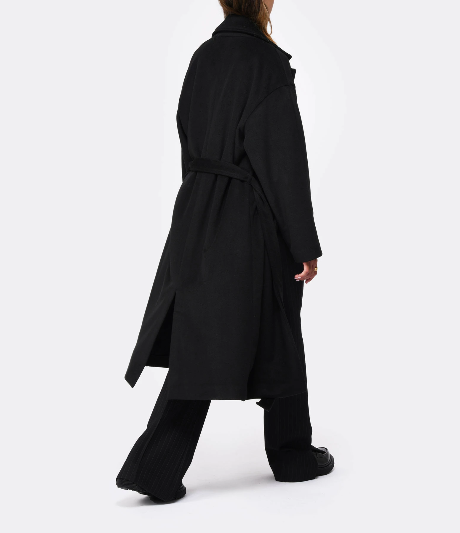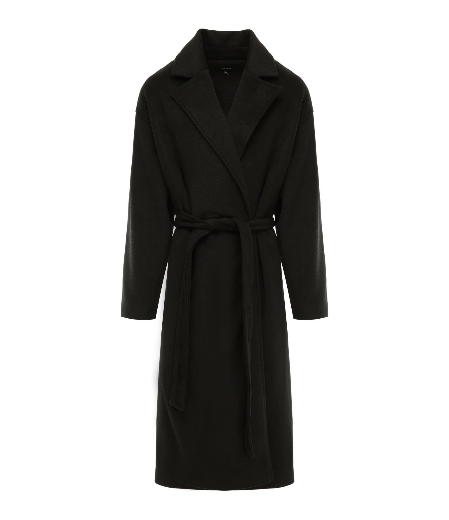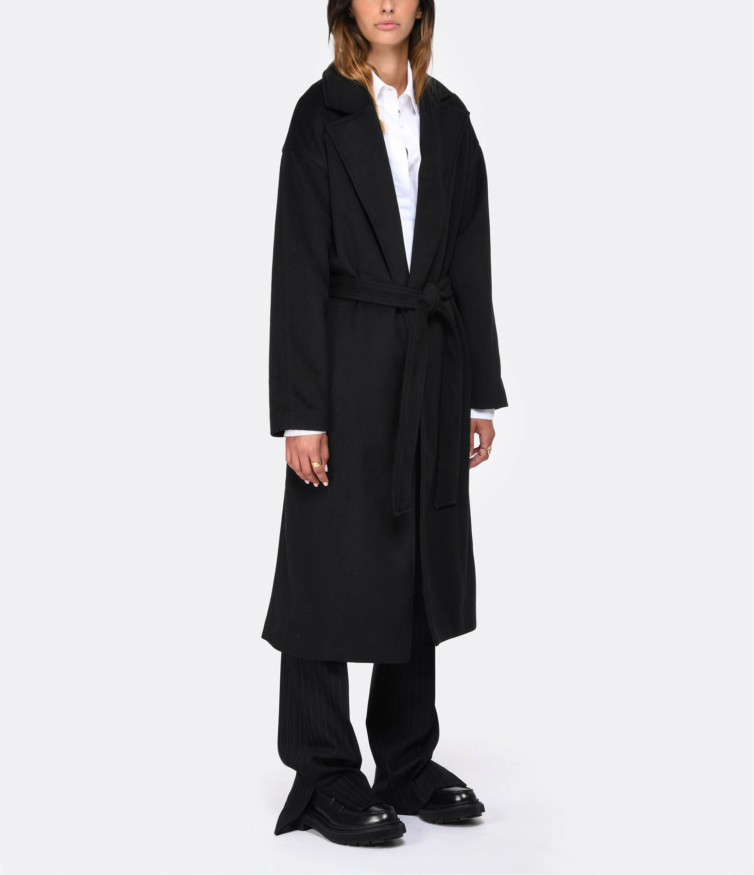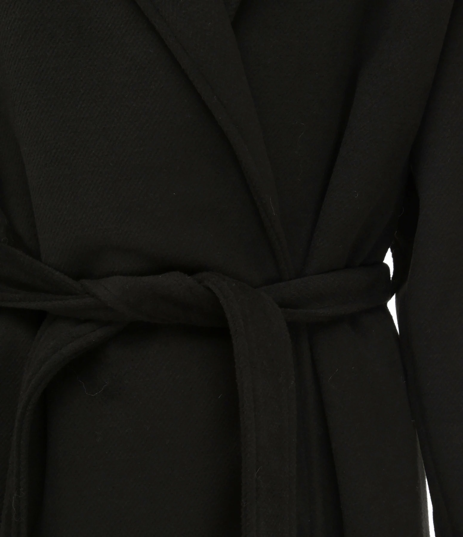 Manteau long noir. Col tailleur cranté. Manches longues. Passants au niveau de la taille pour ceinture amovible assortie à nouer. Deux poches italiennes