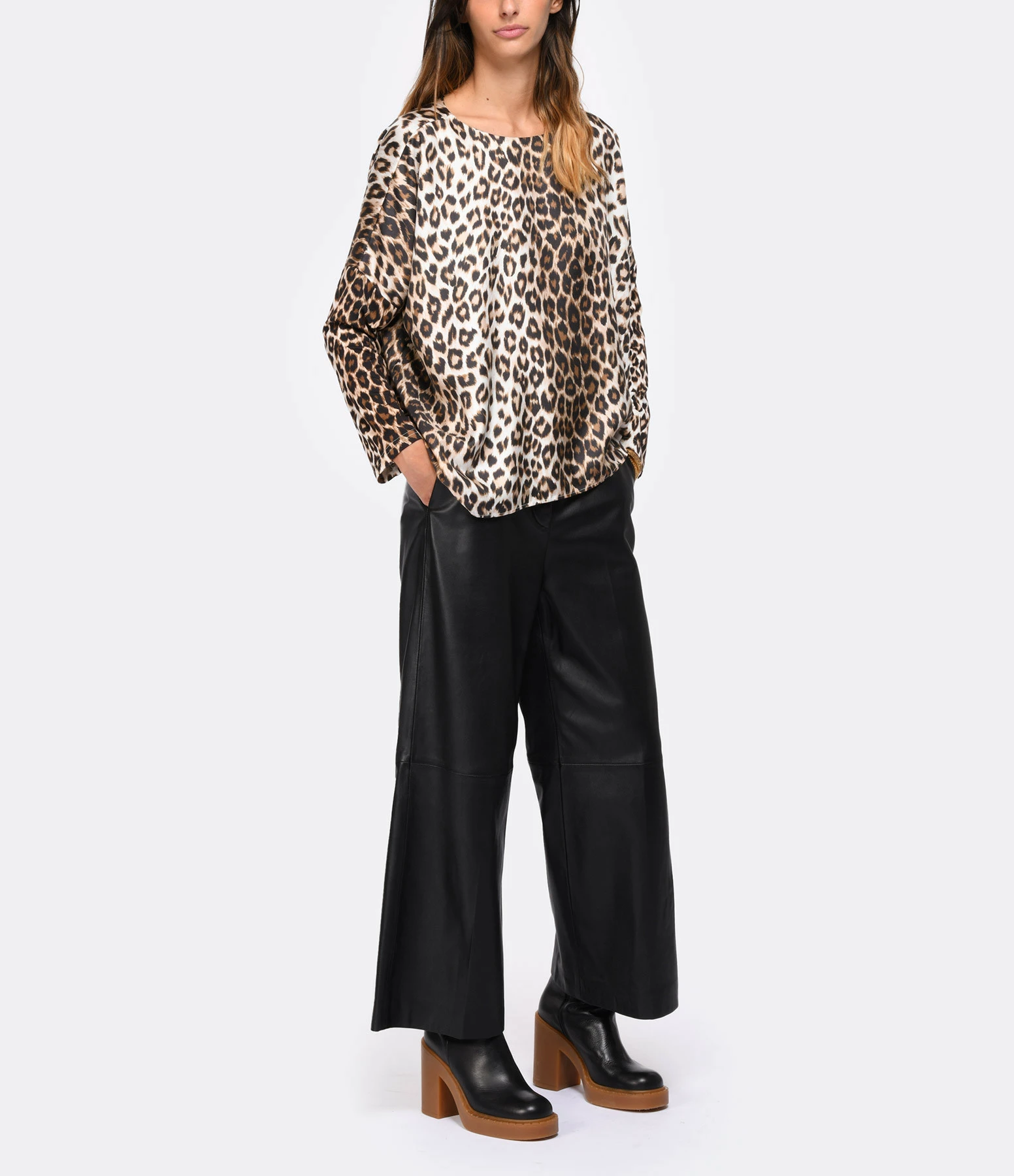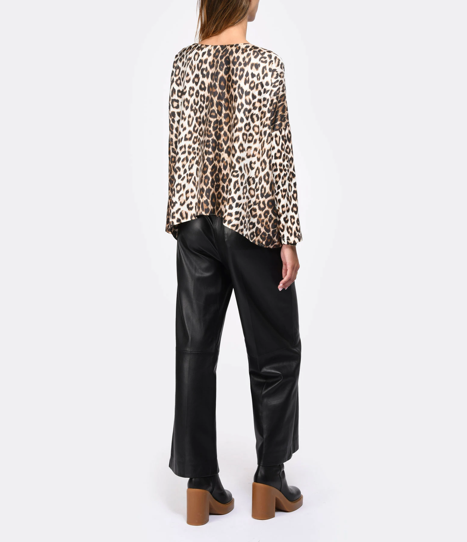 Blouse bi-matière à imprimés léopard. Buste en soie et manches longues effet coton. Col rond. Coupe ample. Base droite.