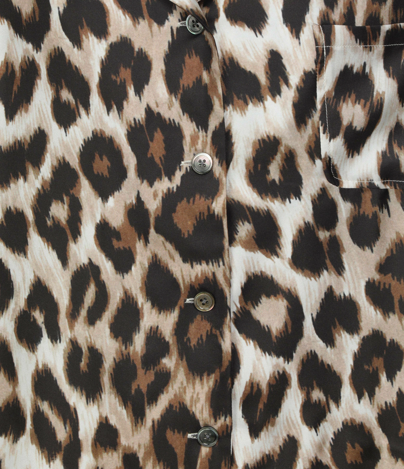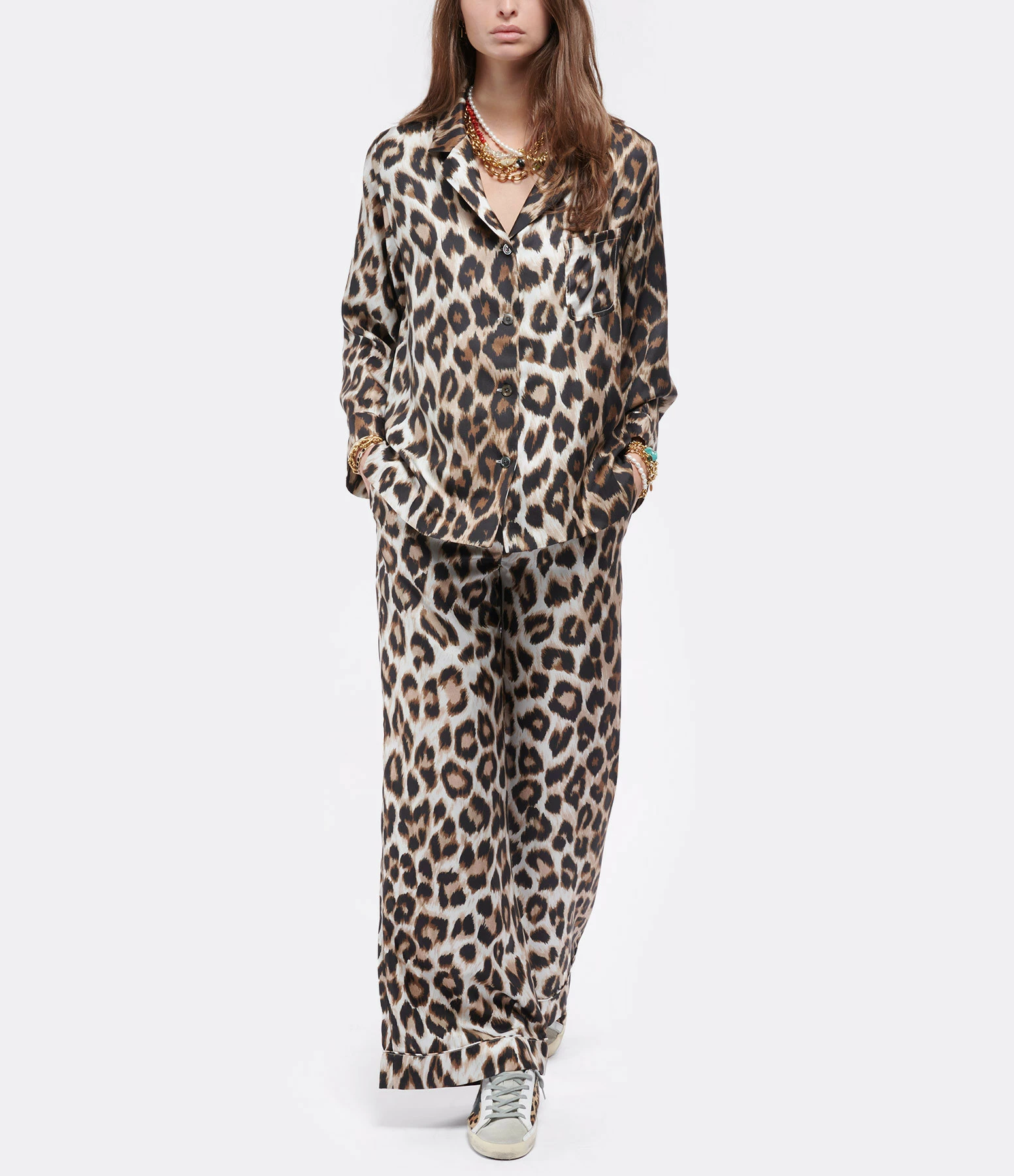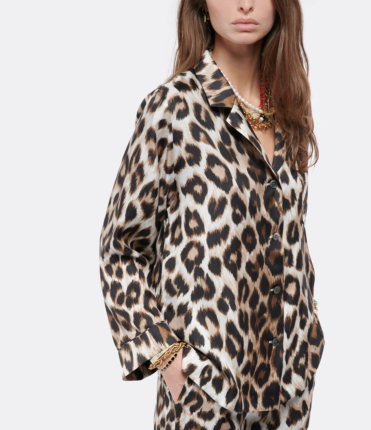 Chemise fluide en soie à imprimé panthère. Col chemisier. Manches longues. Une poche poitrine plaquée. Fermeture par boutons. Coupe ample. Base droite.
