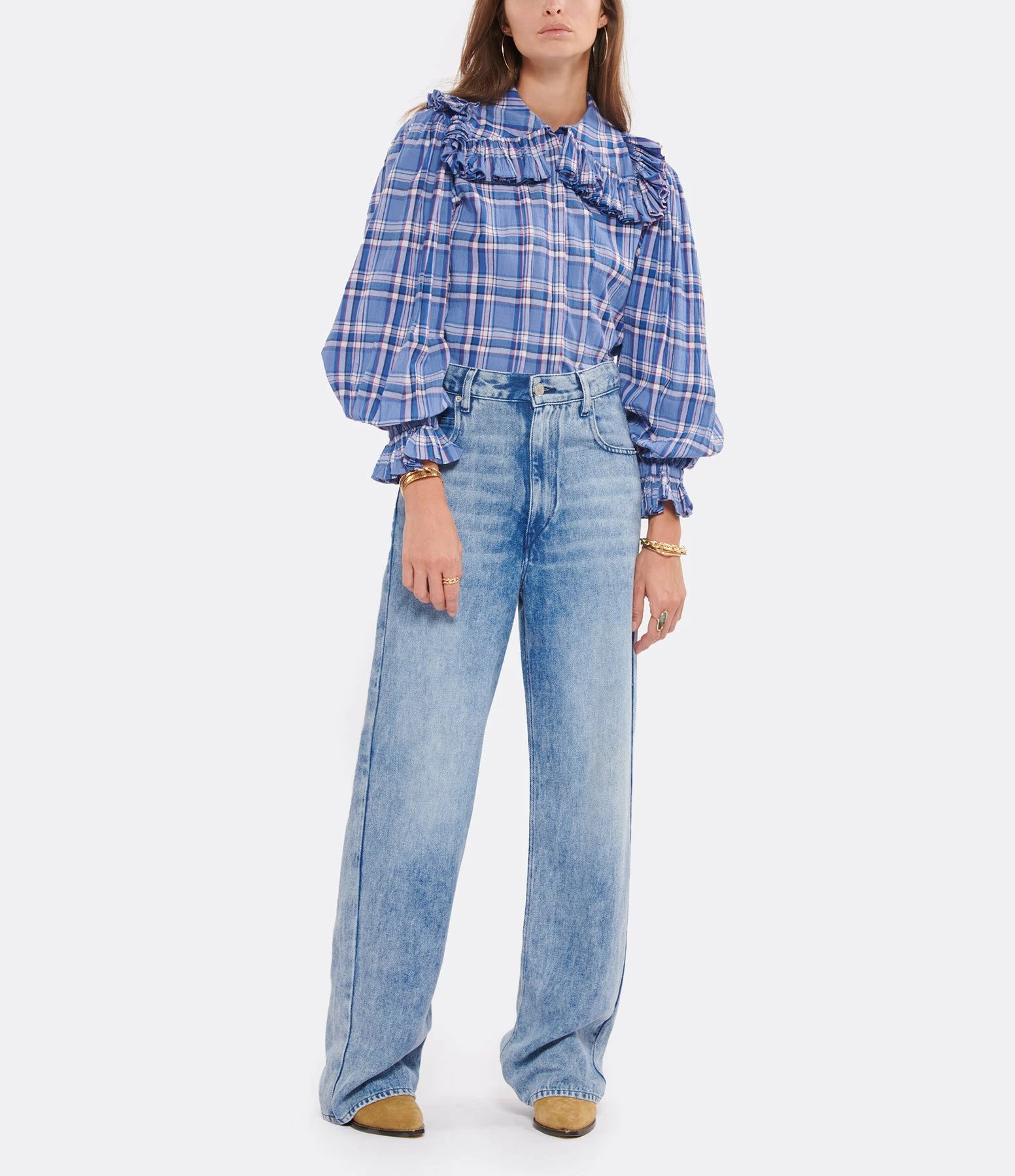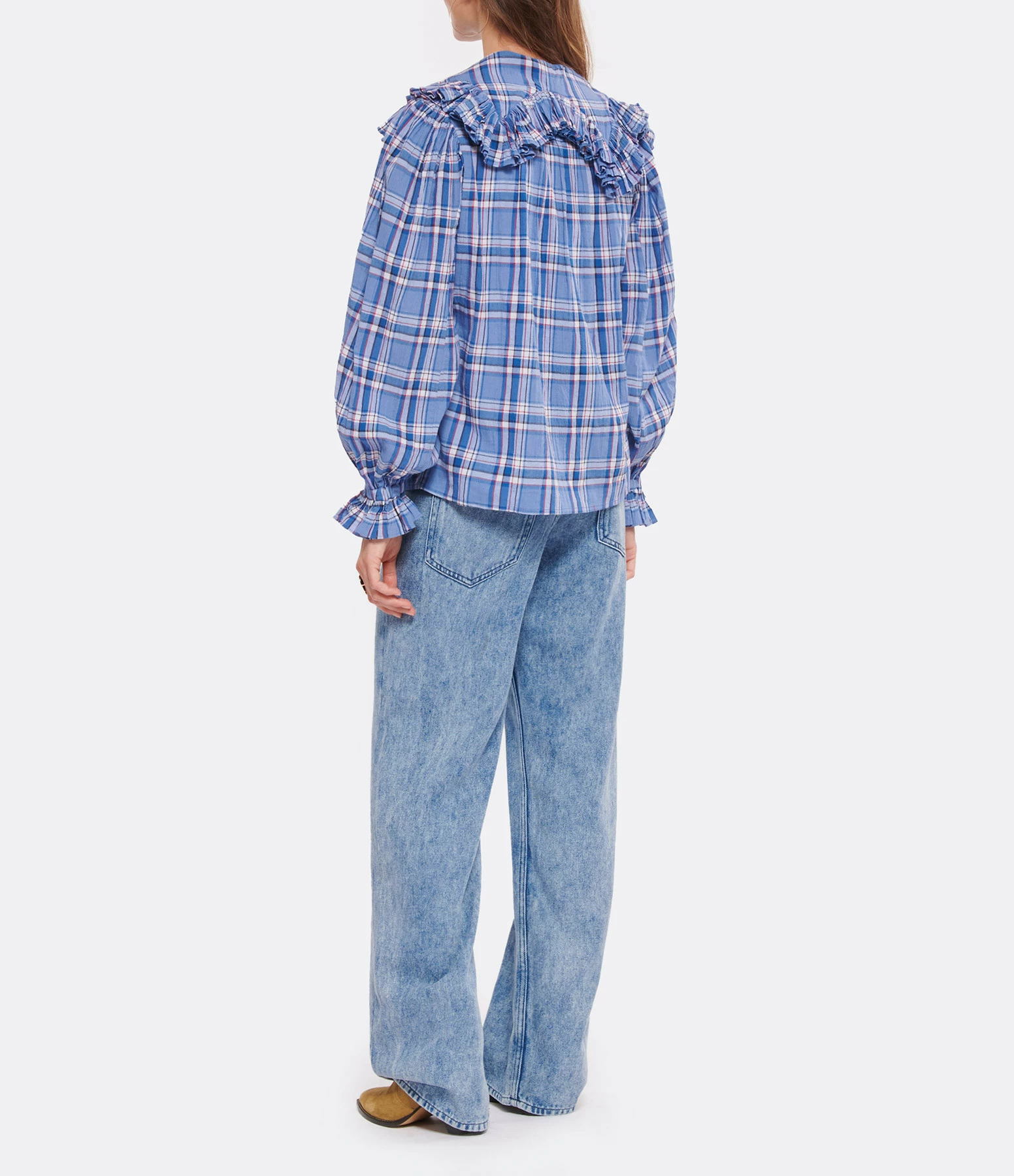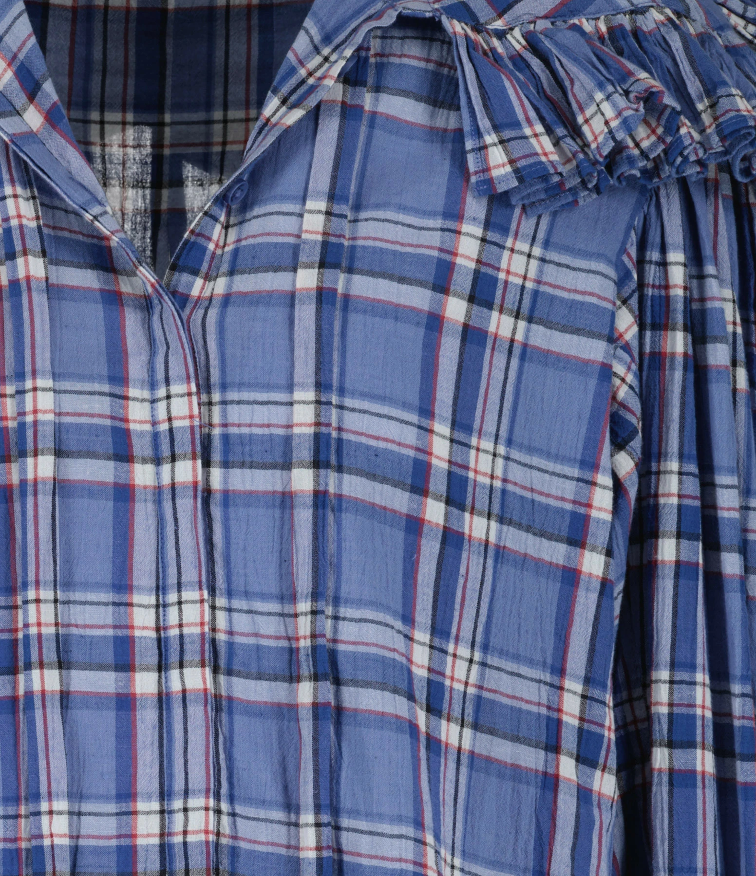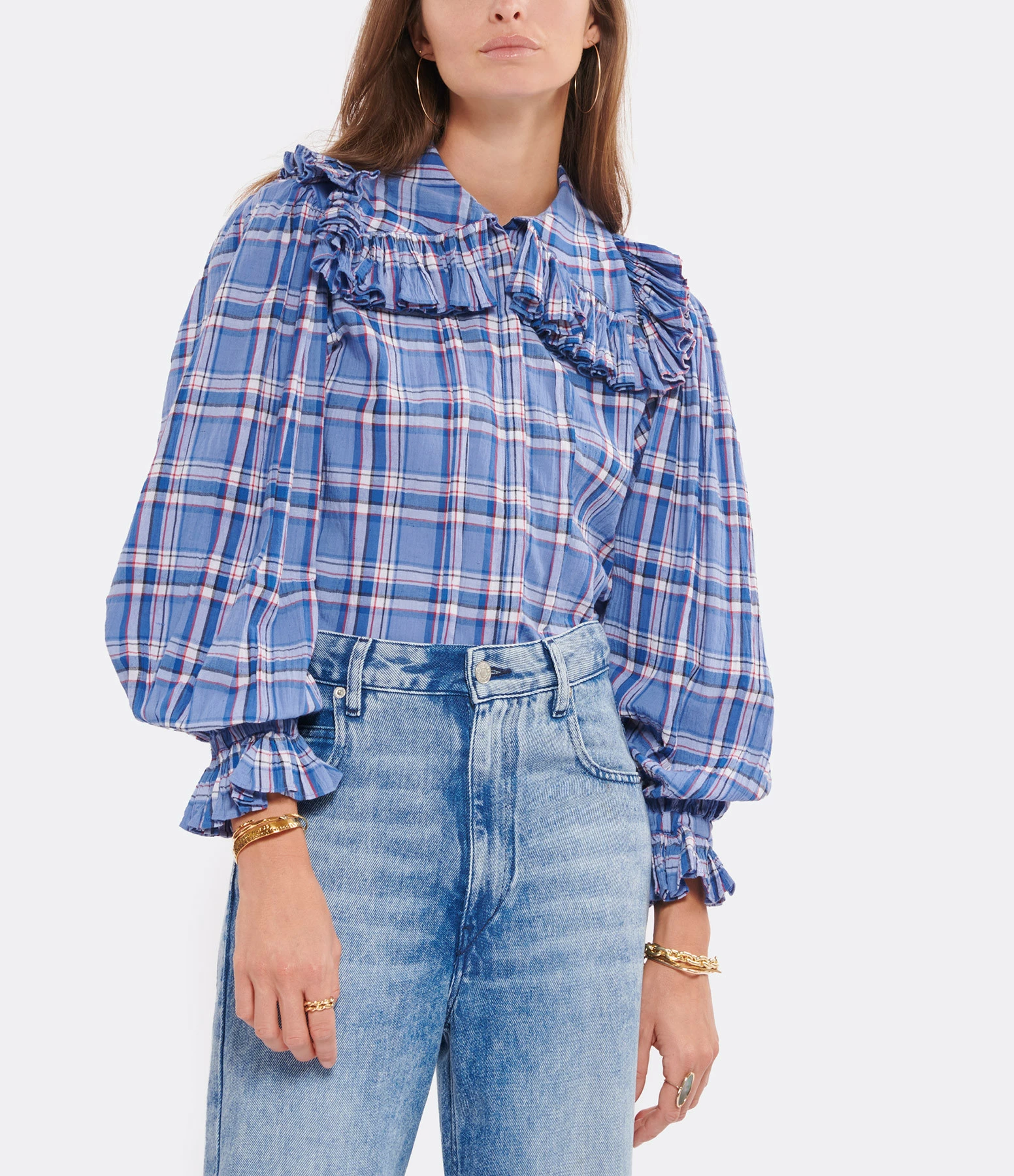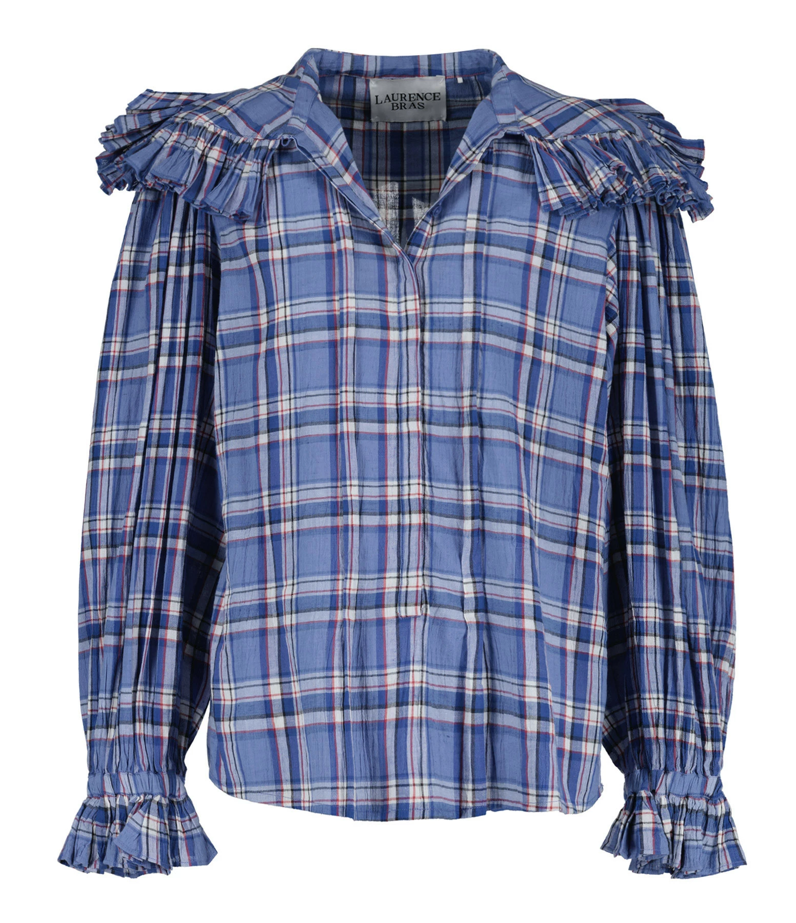 Blouse en coton imprimé carreaux bleu et rouge. Col plat à bouts pointus ornés de volants. Manches longues bouffantes à poignets volantés. Fermeture boutonnée à patte cachée sur le devant. Boutons bleus. Coupe droite. Base droite. Non doublée.