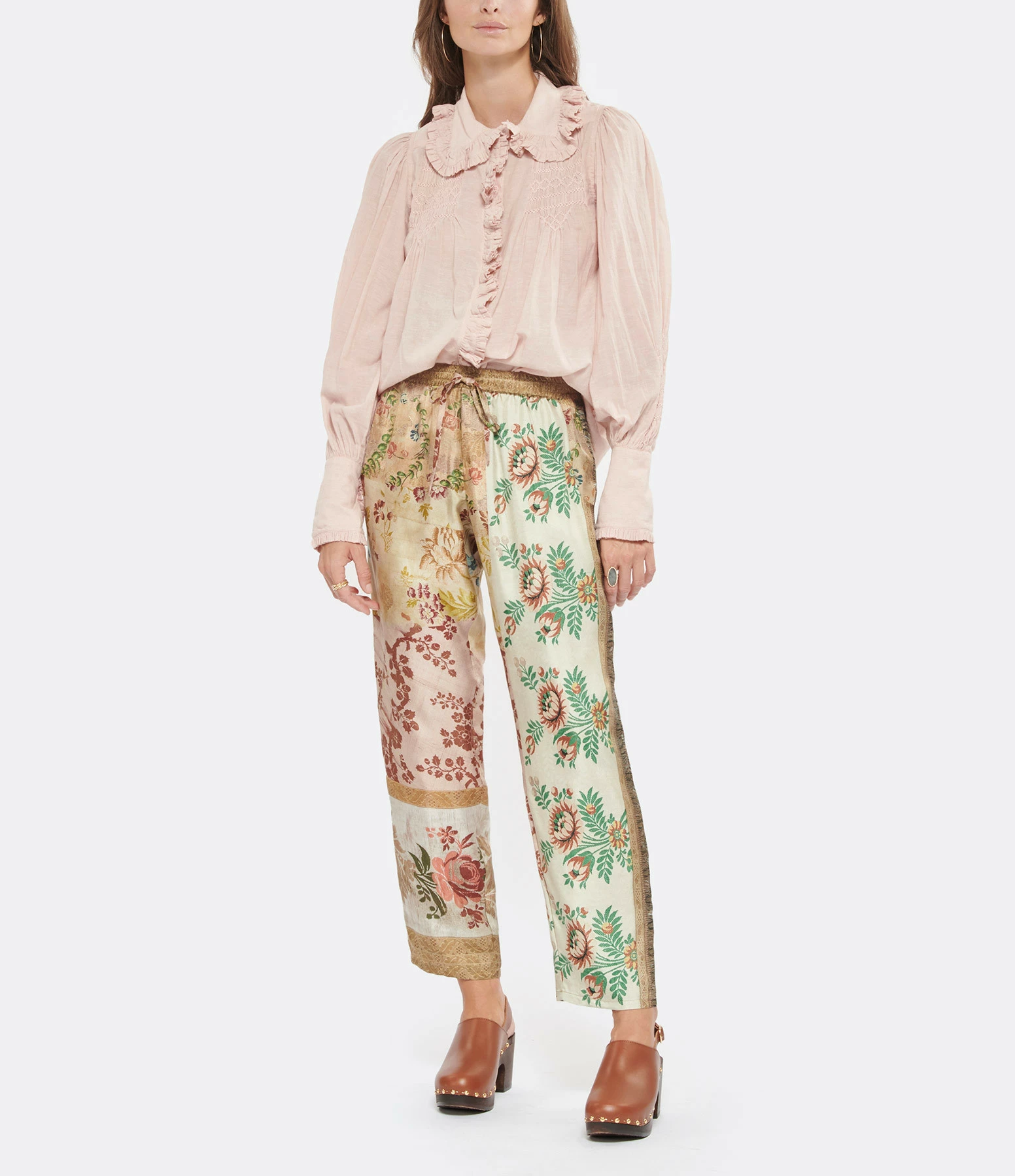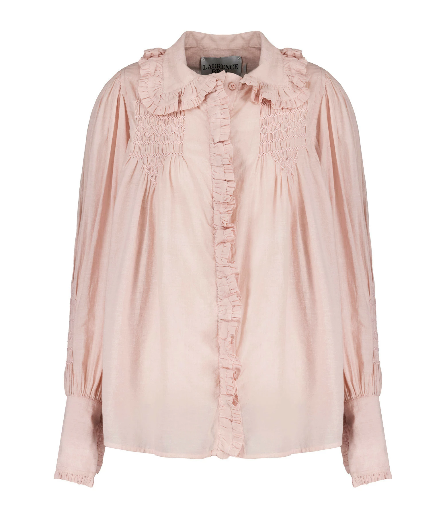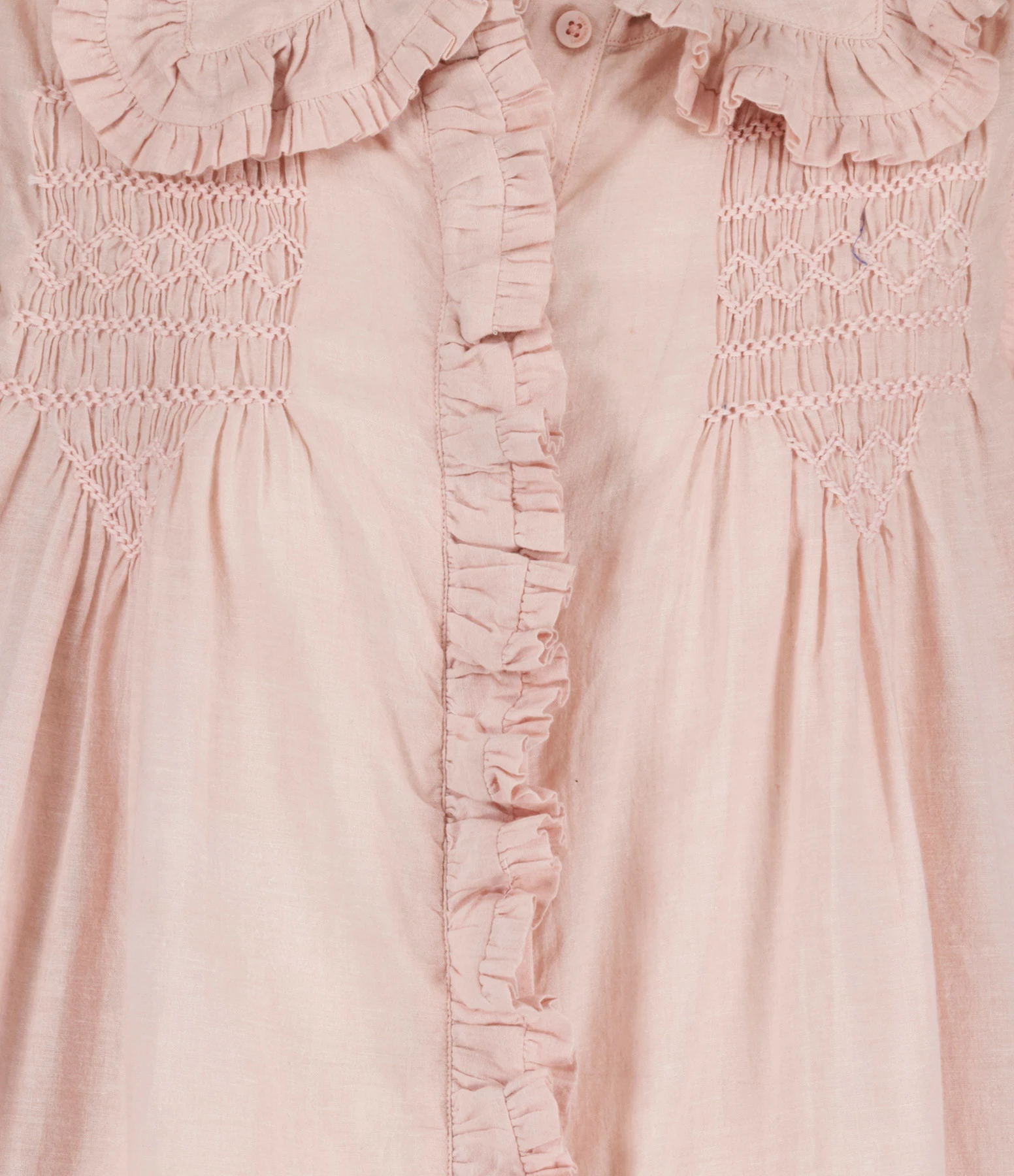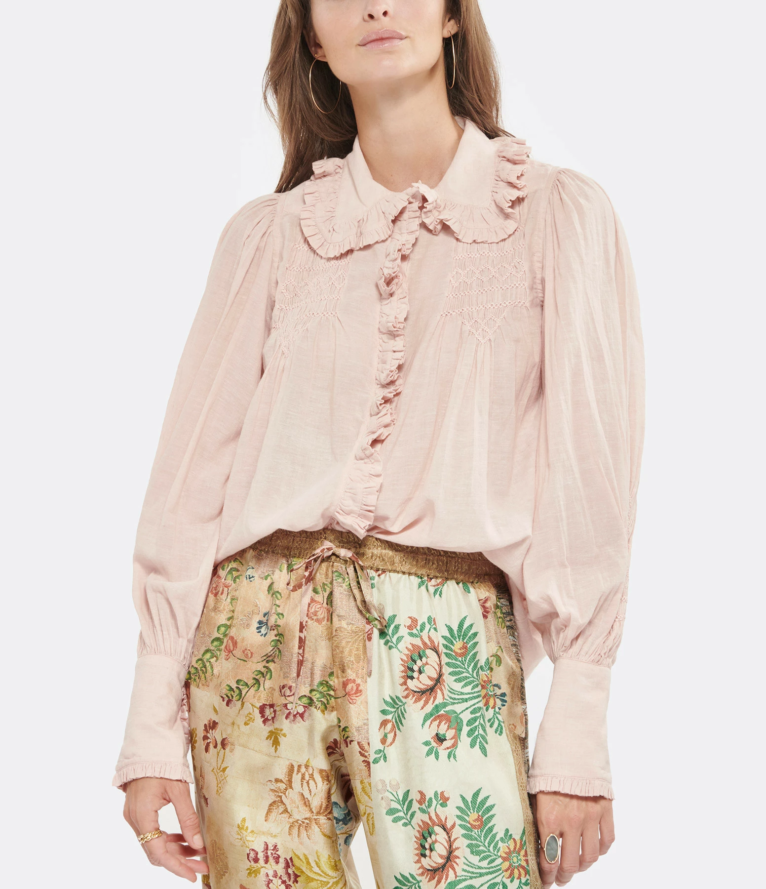 Chemise en coton rose avec détails de broderies ton sur ton et plissés bouillonnés. Col plat à volants. Manches longues bouffantes avec poignets boutonnés et volantés. Fermeture boutonnée sur le devant cachée sous la patte de boutonnage volantée. Boutons roses gravés du logo. Coupe droite. Base droite.