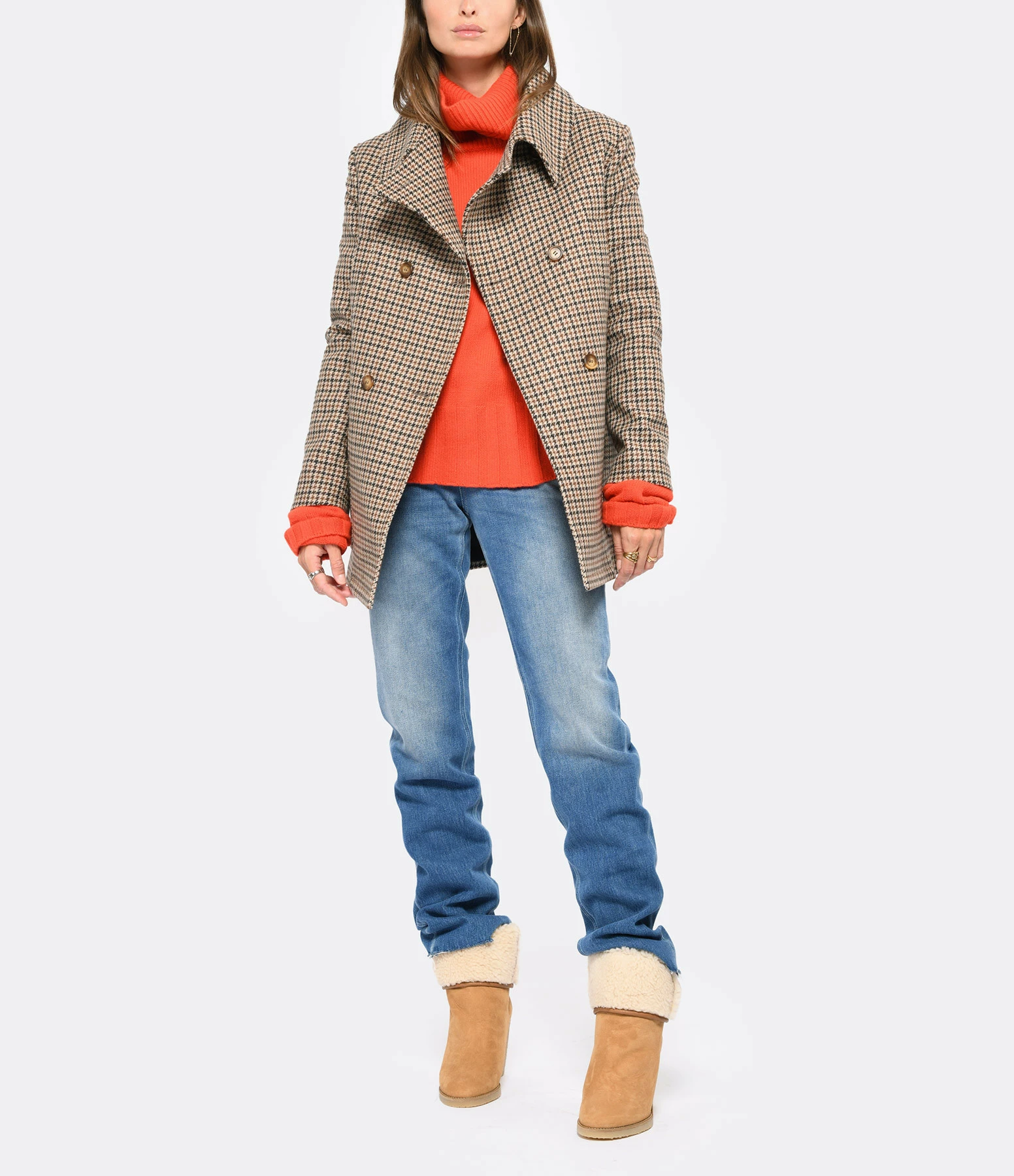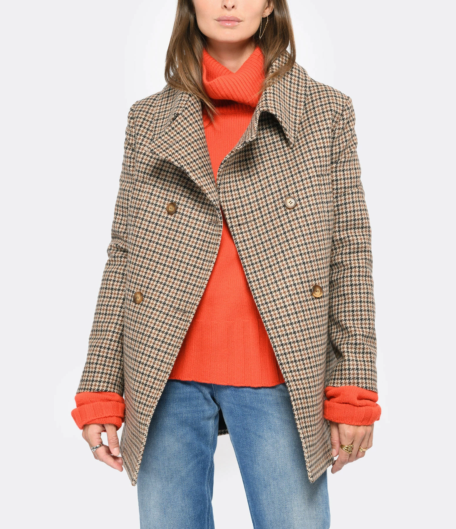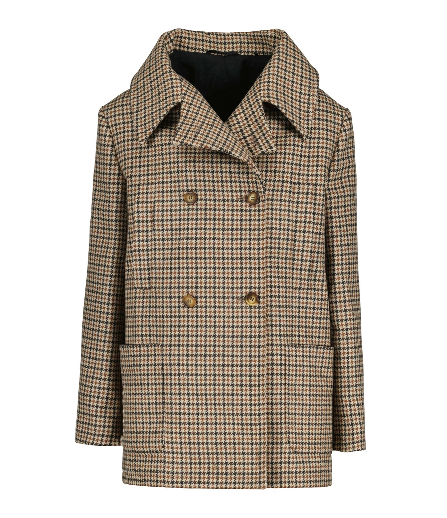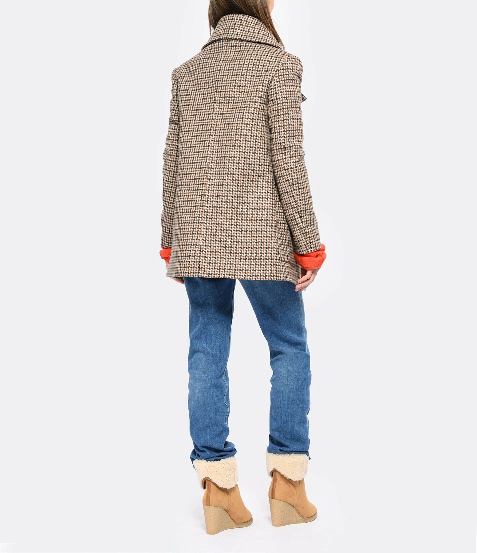 Manteau court en laine mélangée à motif pied-de-poule dans des tons beiges. Col à revers droit. Manches longues tailleur. Fermeture boutonnée double. Boutons marrons effet corne. Une poche passepoilée poitrine et deux poches plaquées sur le devant. Une poche passepoilée boutonnée intérieure. Coupe droite. Base droite. Doublé.