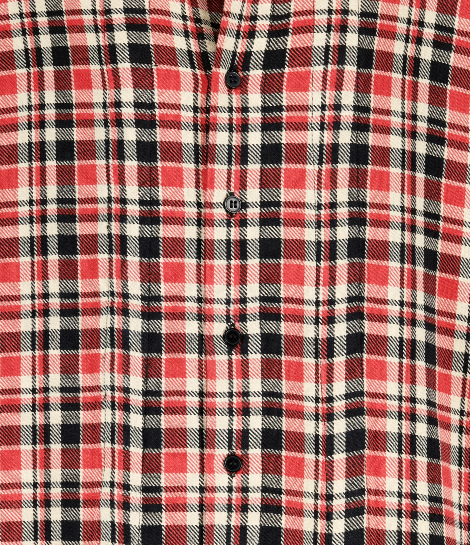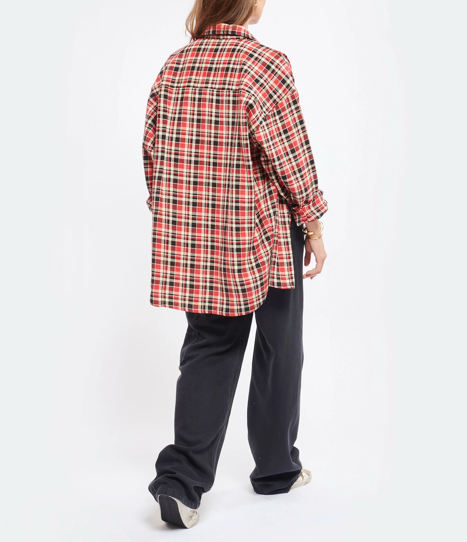 Surchemise en coton imprimé à carreaux dans des tons rouges. Col chemise. Manches longues avec fentes et poignets boutonnés. Fermeture boutonnée sur le devant. Boutons noirs. Coupe large. Boutons pressions intérieurs. Base droite.