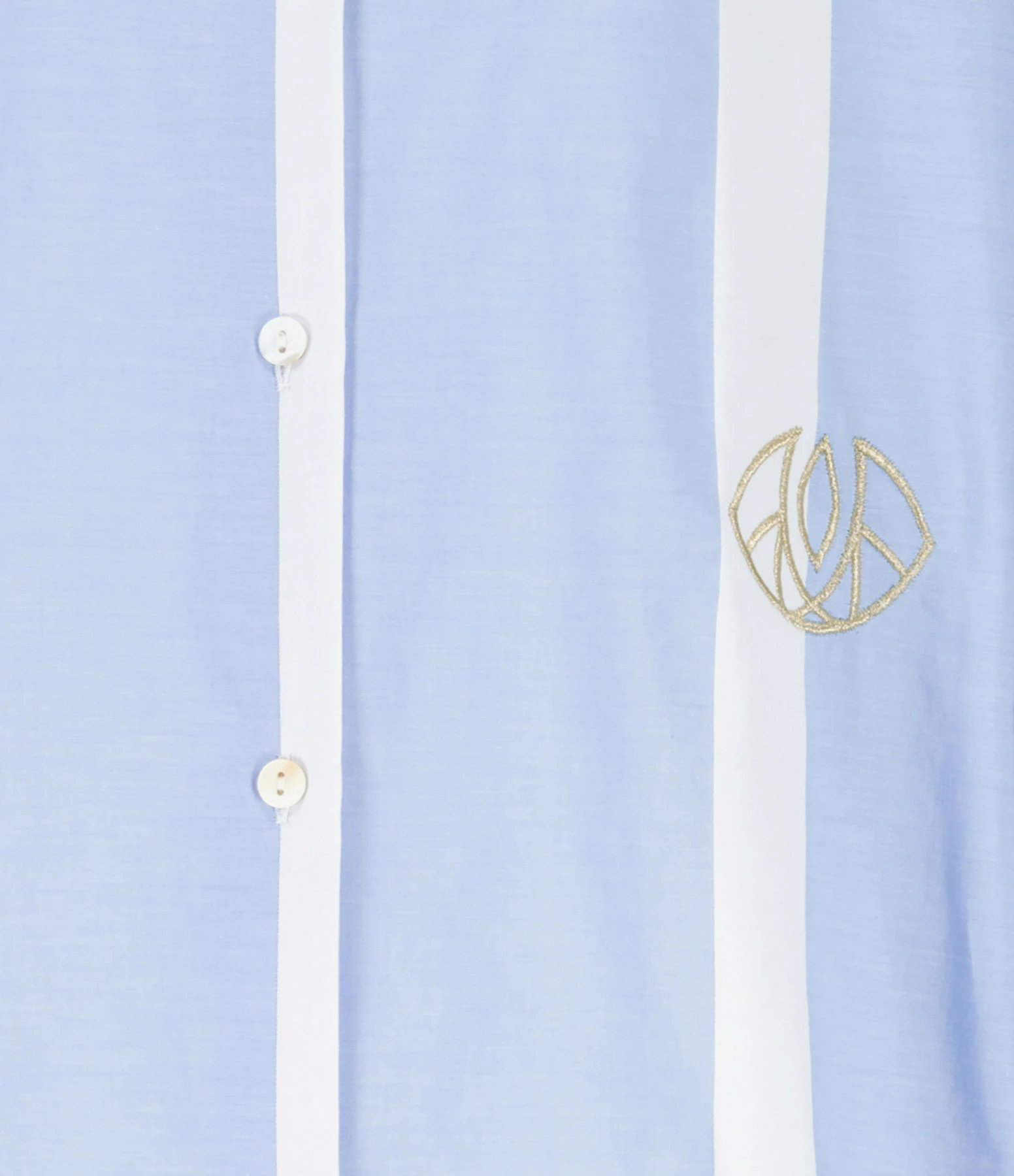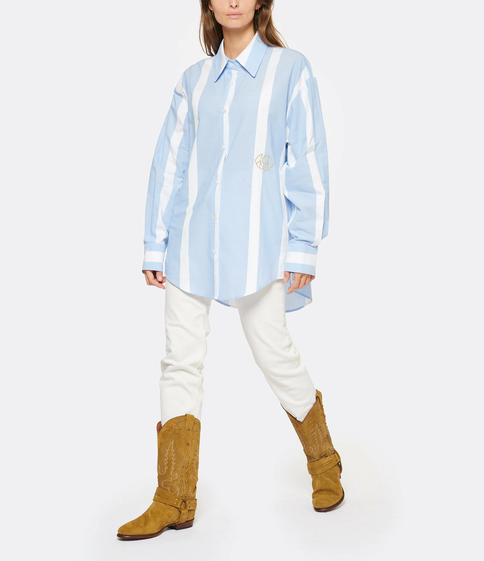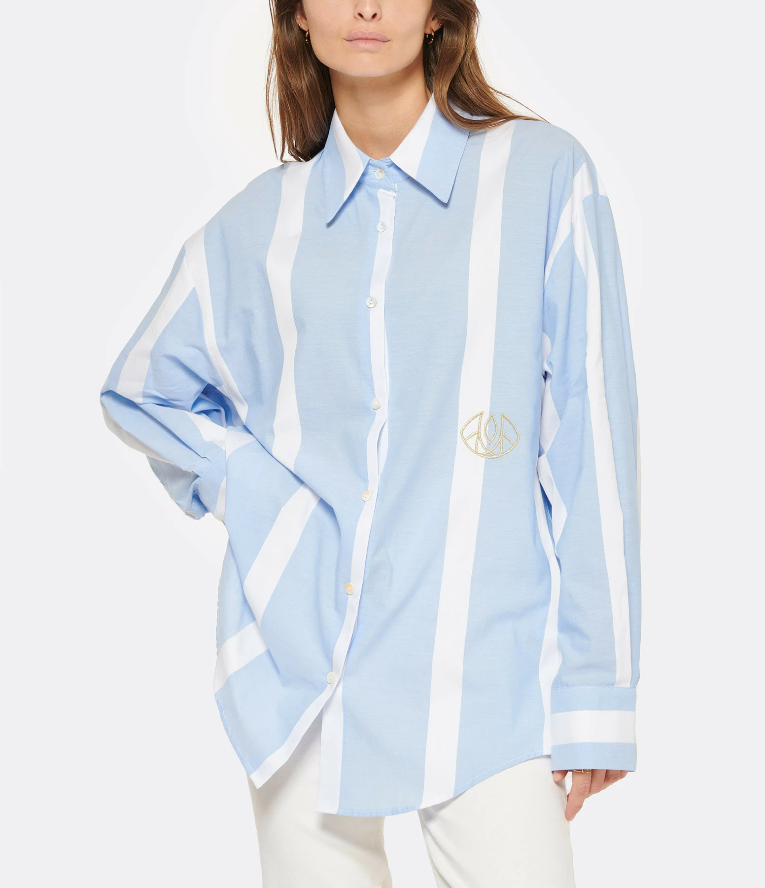Chemise en popeline de coton blanc à larges rayures bleues. Logo brodé en doré sur le devant. Col chemisier. Manches longues avec fentes et poignets boutonnés. Fermeture boutonnée sur le devant. Petits boutons blancs nacrés. Pli creux dans le dos. Coupe oversized. Longueur plus longue dans le dos que sur le devant. Base arrondie.