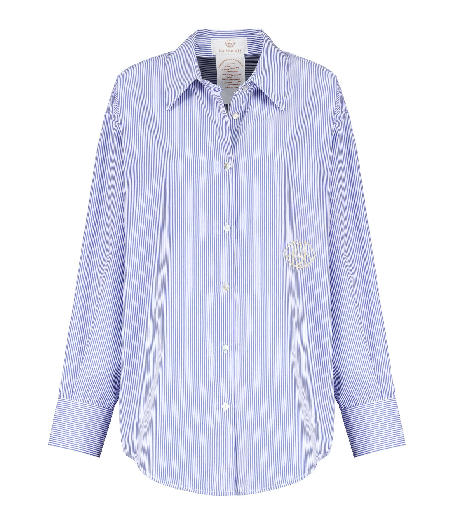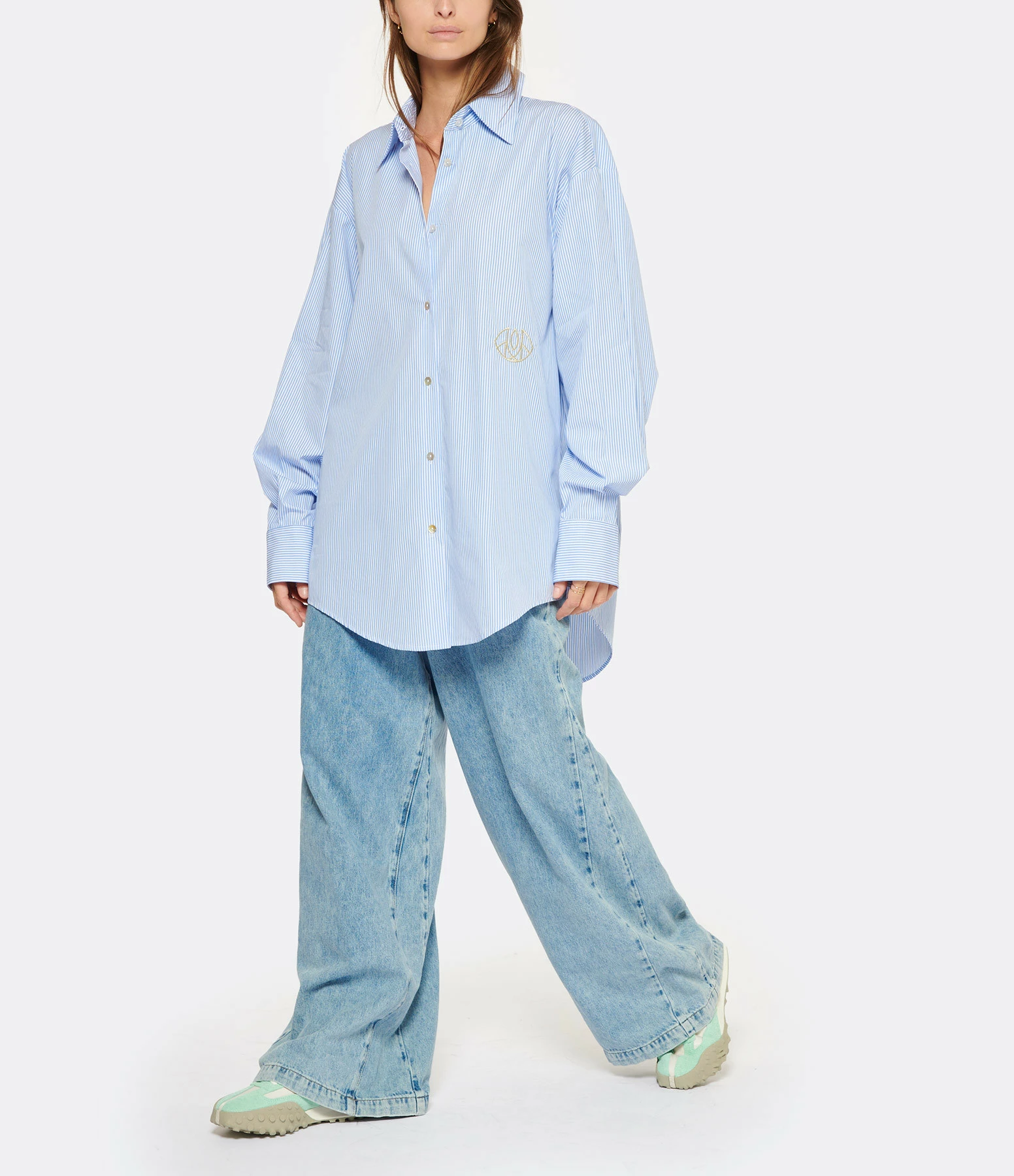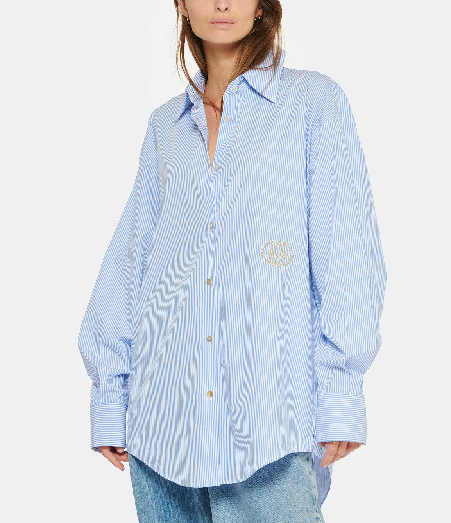 Chemise en popeline de coton blanc à fines rayures bleues. Logo brodé en doré sur le devant. Col chemisier. Manches longues avec fentes et poignets boutonnés. Fermeture boutonnée sur le devant. Petits boutons blancs nacrés. Pli creux dans le dos. Coupe oversized. Longueur plus longue dans le dos que sur le devant. Base arrondie.