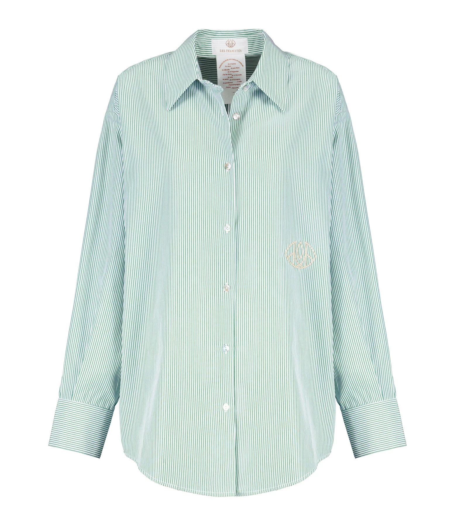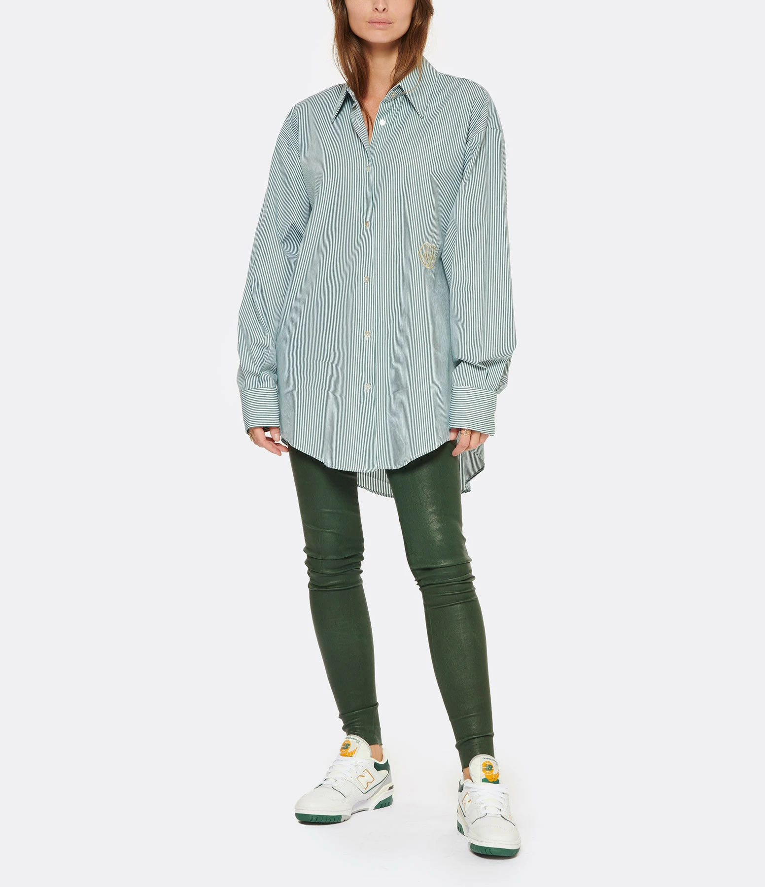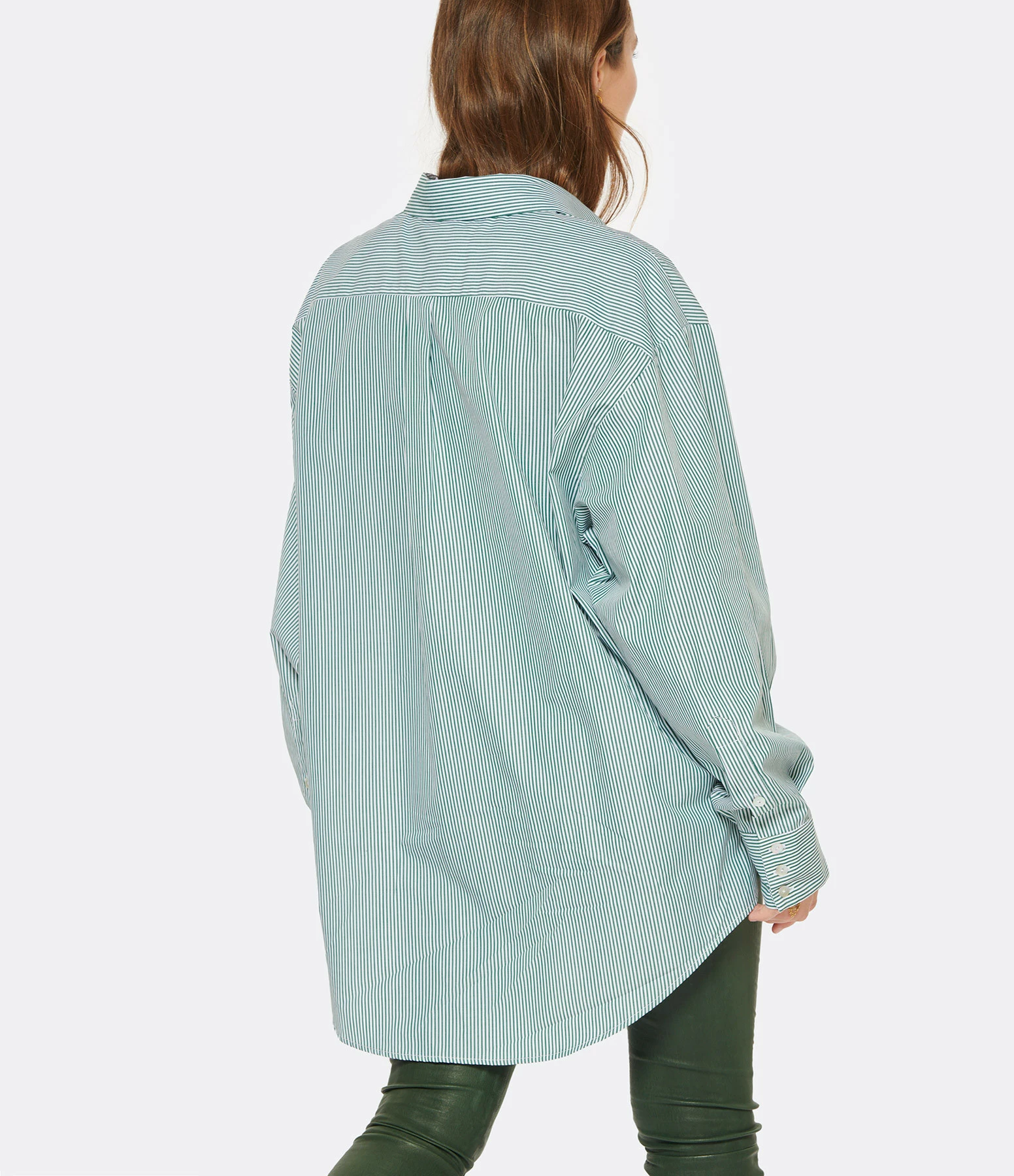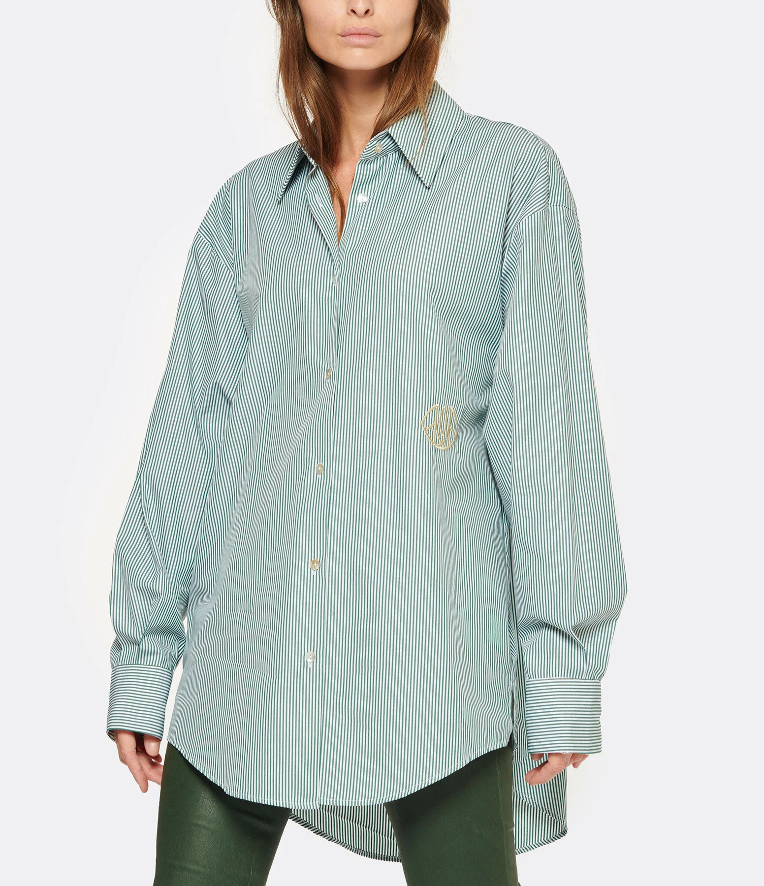 Chemise en popeline de coton blanc à fines rayures kaki. Logo brodé en doré sur le devant. Col chemisier. Manches longues avec fentes et poignets boutonnés. Fermeture boutonnée sur le devant. Petits boutons blancs nacrés. Pli creux dans le dos. Coupe oversized. Longueur plus longue dans le dos que sur le devant. Base arrondie.