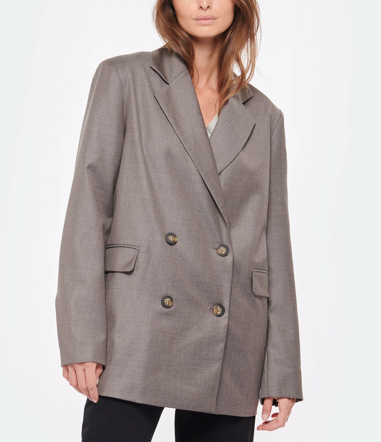 Veste blazer en laine grise. Col tailleur cranté. Épaulettes. Manches longues tailleur avec fentes et poignets boutonnés. Fermeture boutonnée double sur le devant. Boutons marron effet corne. Deux poches plaquées à rabat sur le devant. Une fente milieu dos. Coupe droite. Base droite. Doublée.