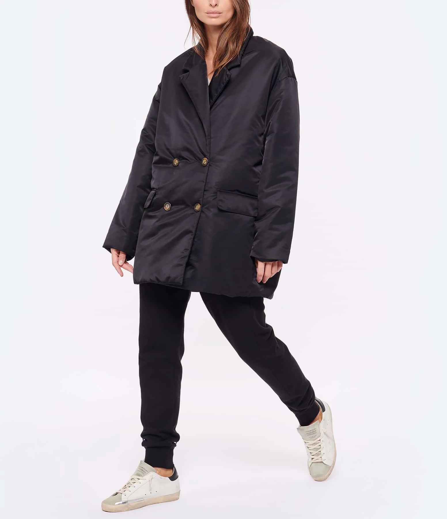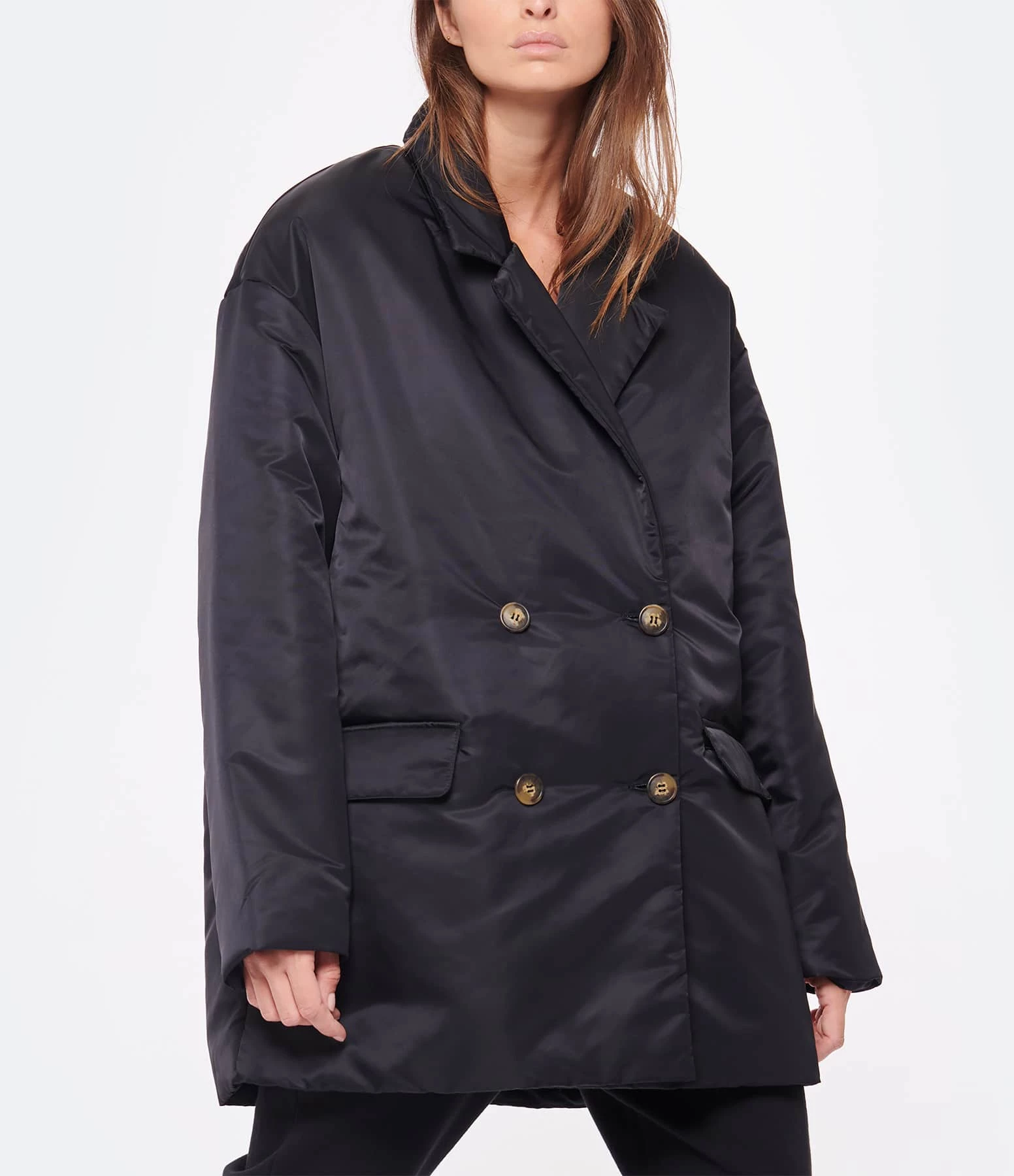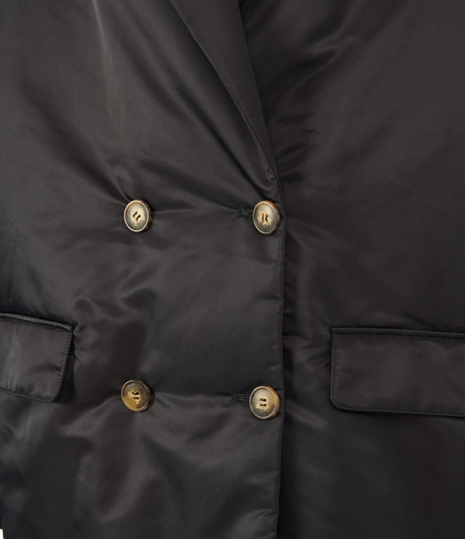 Manteau court matelassé noir. Col tailleur cranté. Manches longues. Fermeture boutonnée double sur le devant. Boutons marron effet corne. Deux poches à rabat sur le devant. Une poche passepoilée intérieure. Coupe oversize. Base droite. Doublé.