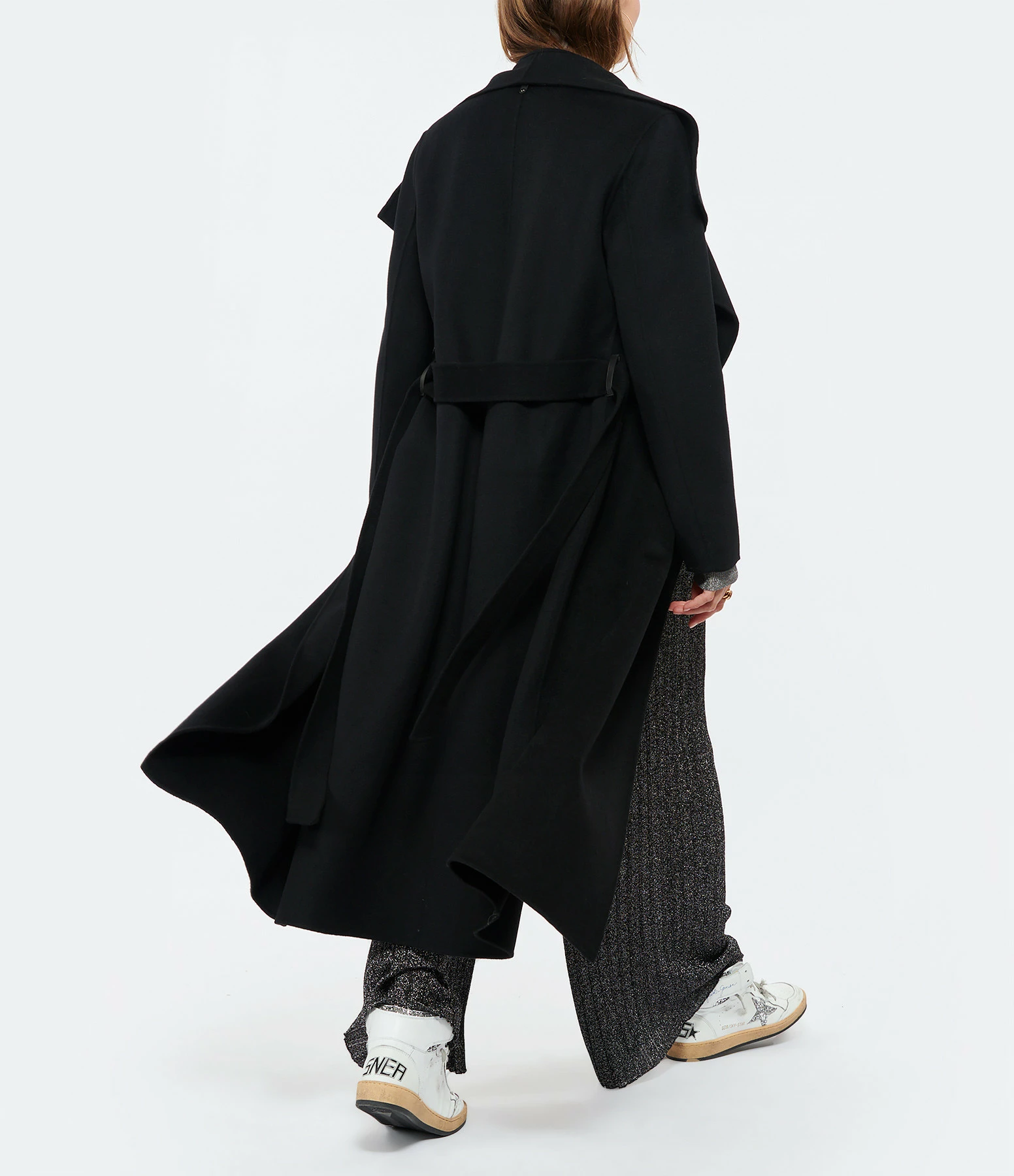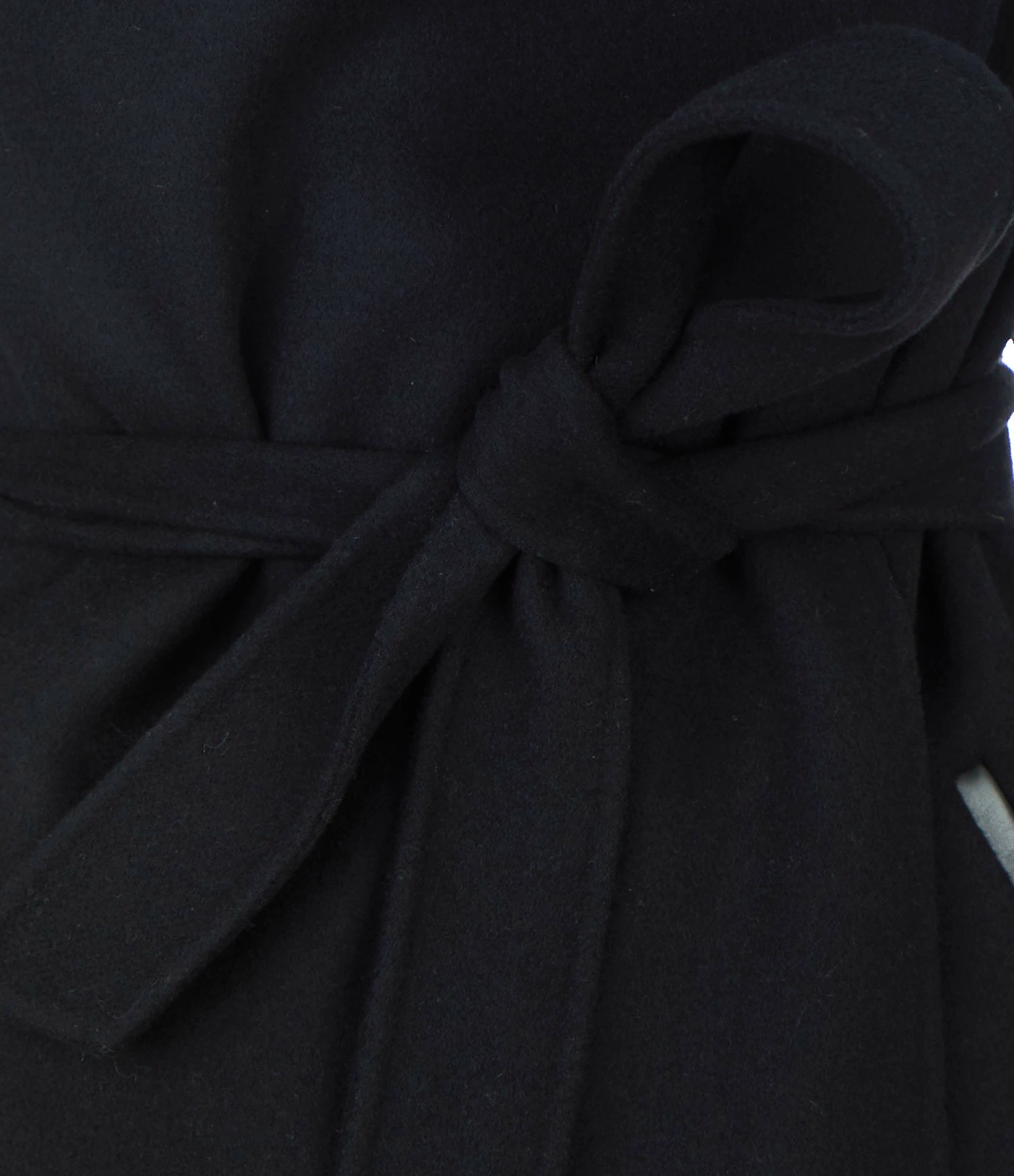 Manteau long en laine noir. Col châle et manches longues. Ceinture à nouer. Deux poches passepoilées bordées de cuir. Base droite. Non doublé.