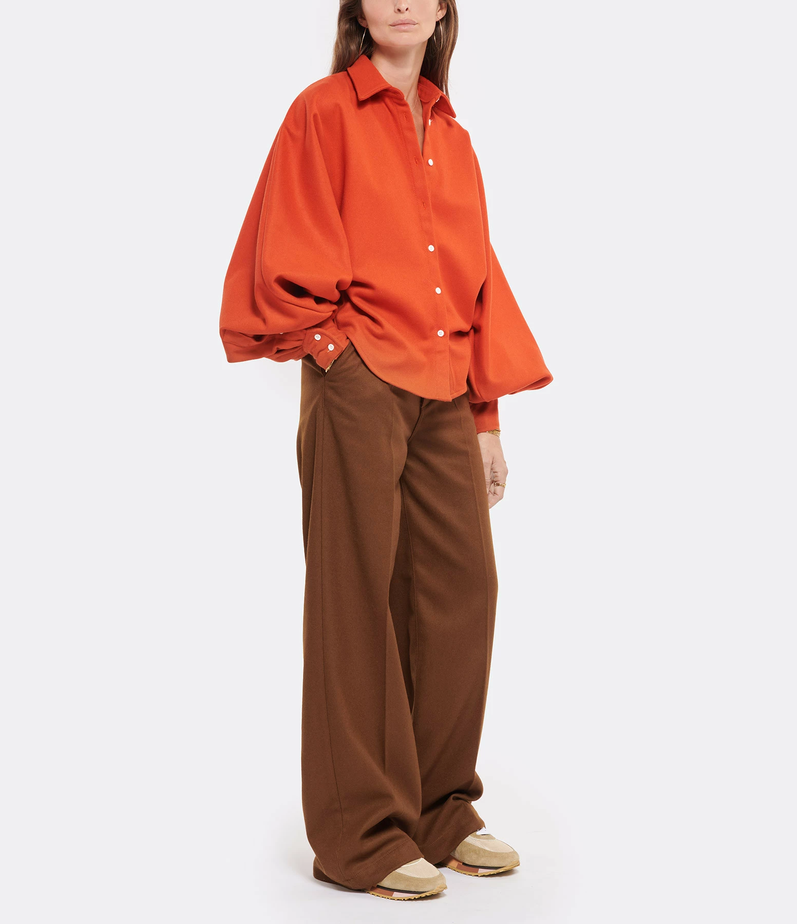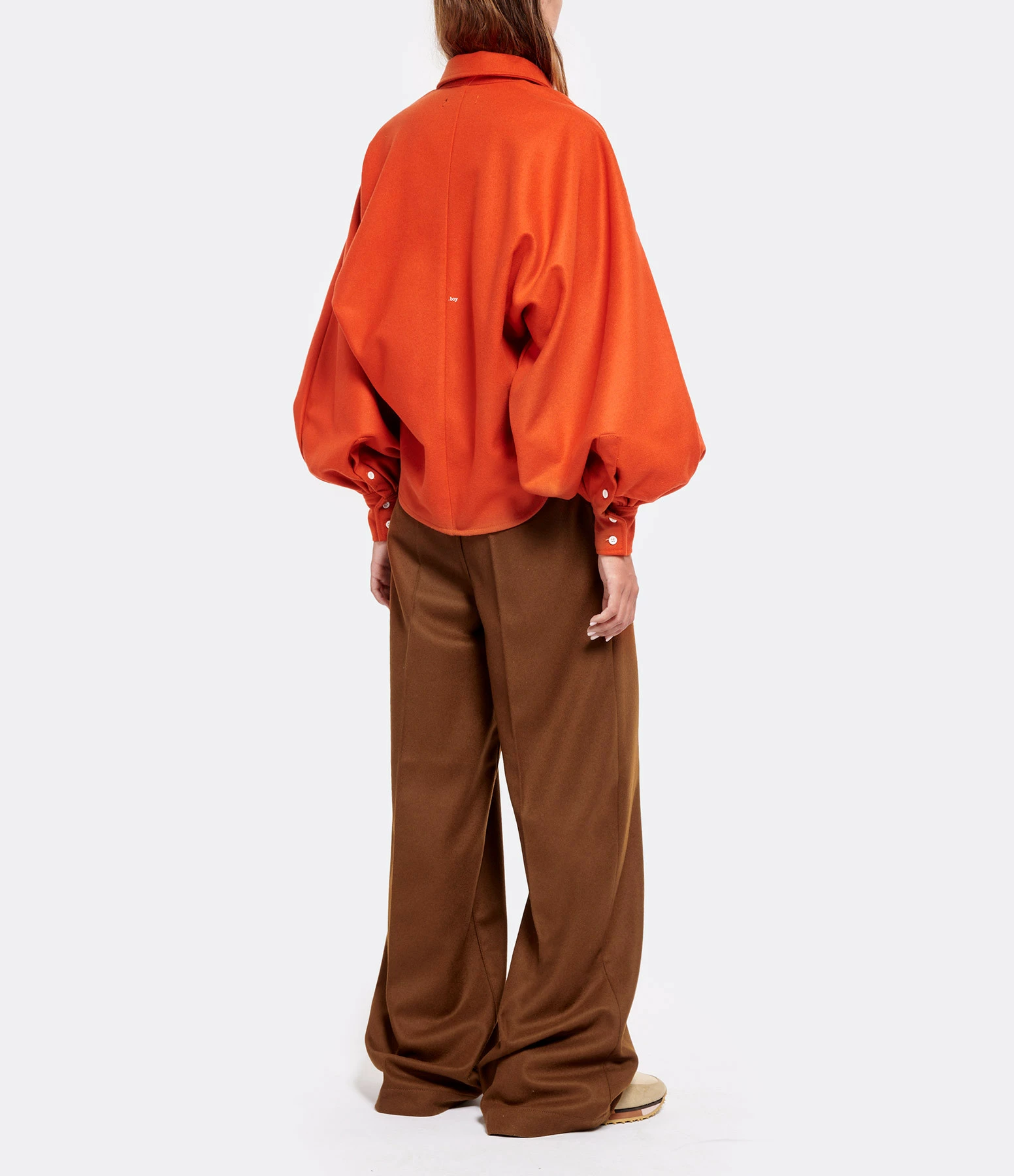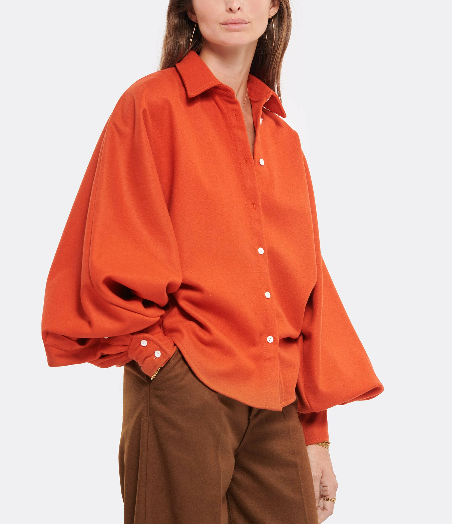 Chemise en laine et cachemire orange. Col chemisier. Manches longues bouffantes chauve-souris oversize. Fermeture par boutons. Coupe droite. Base arrondie. Non doublée.