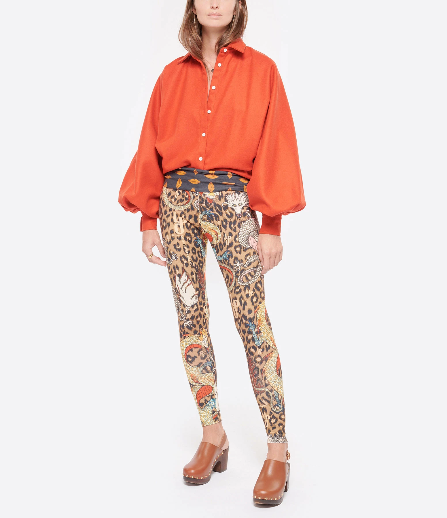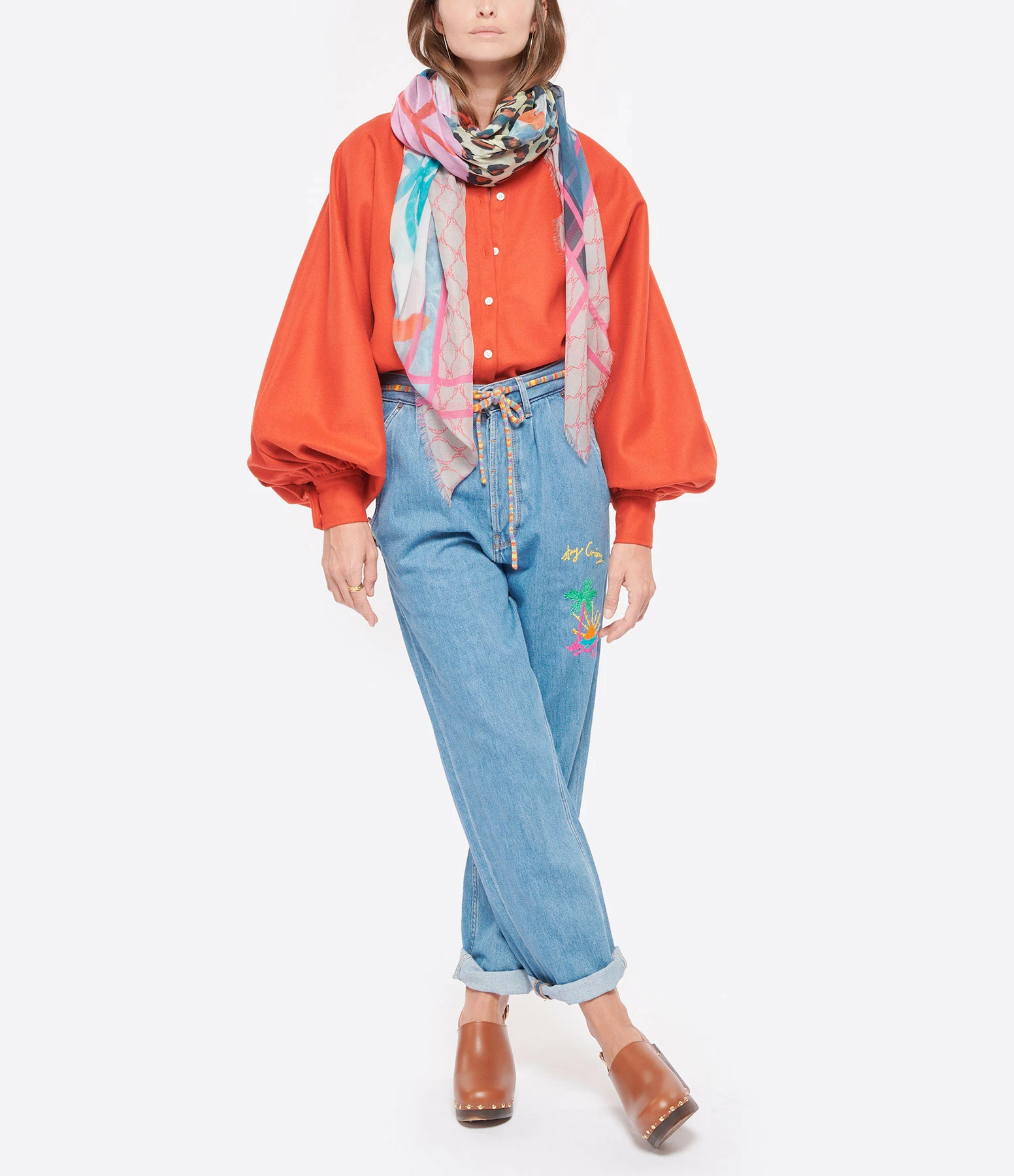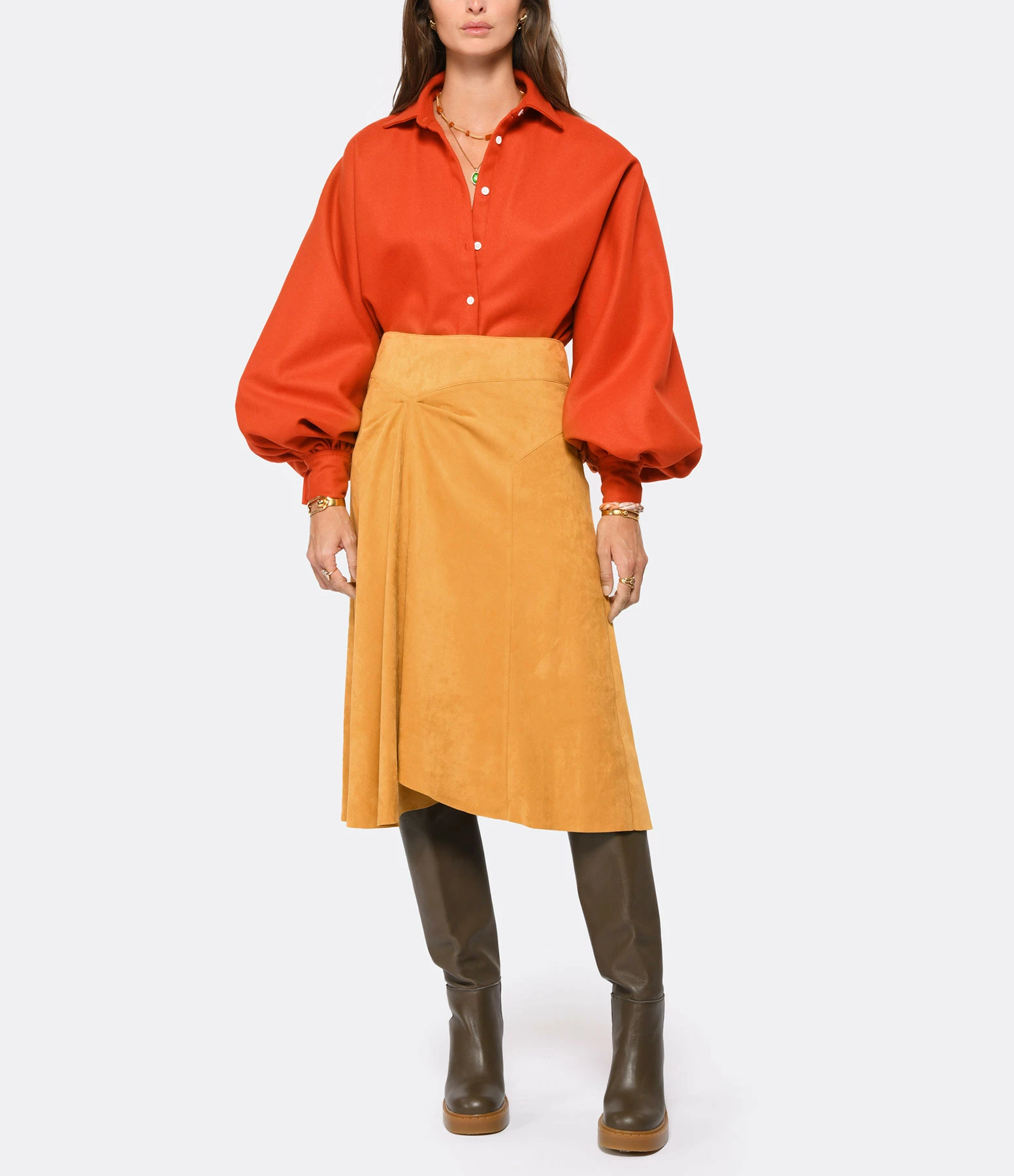 Chemise en laine et cachemire orange. Col chemisier. Manches longues bouffantes chauve-souris oversize. Fermeture par boutons. Coupe droite. Base arrondie. Non doublée.