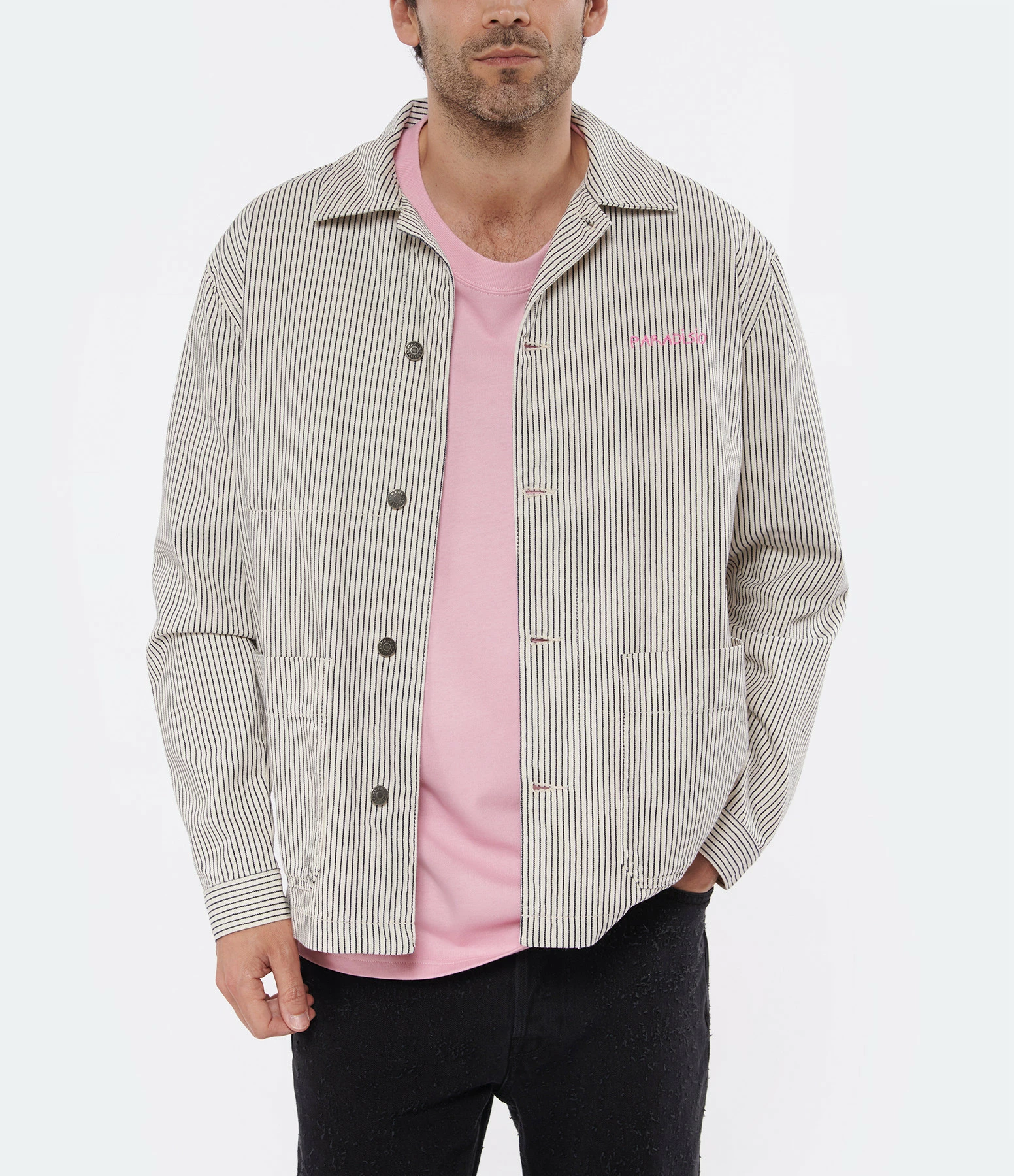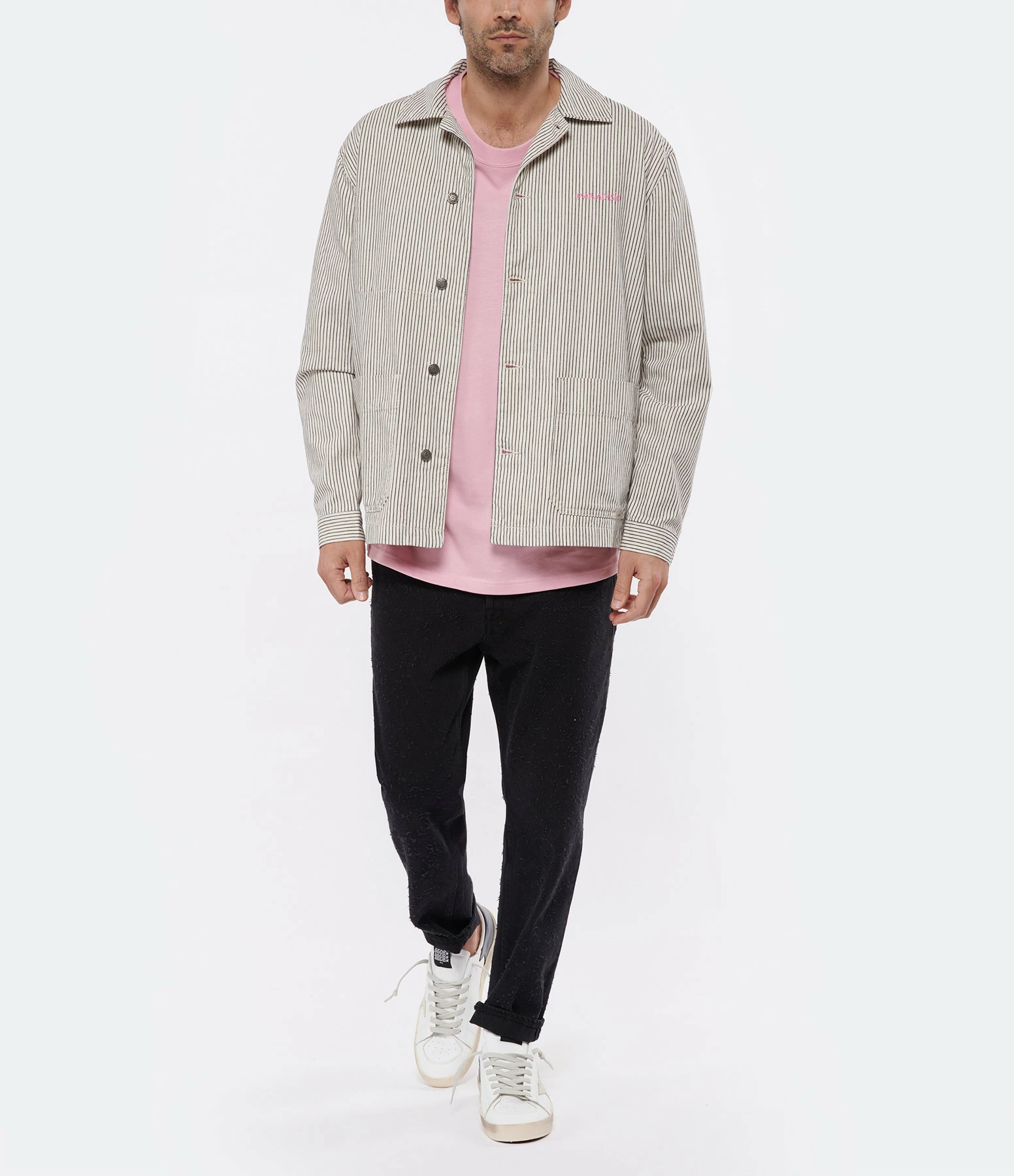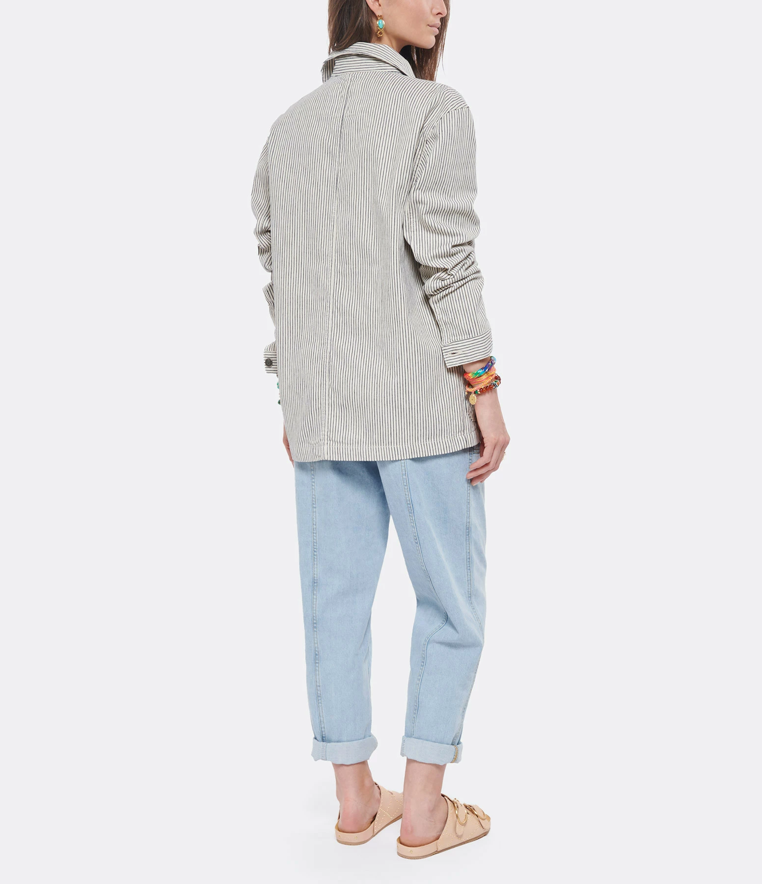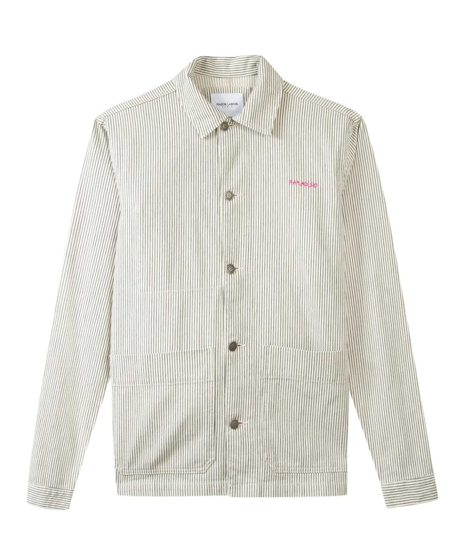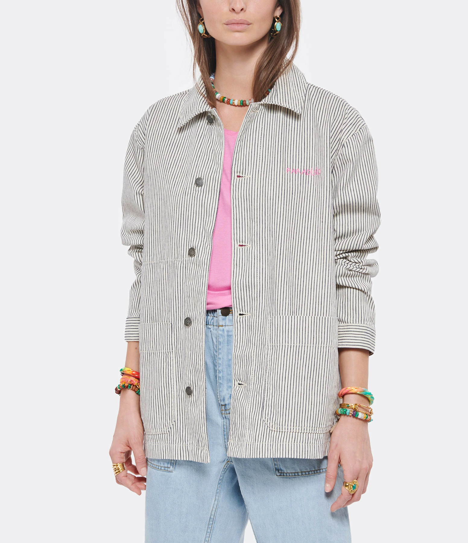 Veste en denim rayée. Broderie “Paradisio” rose côté cœur. Manches longues boutonnées. Col chemisier. Fermeture boutonnée. Deux poches plaquées. Coupe droite. Base droite.