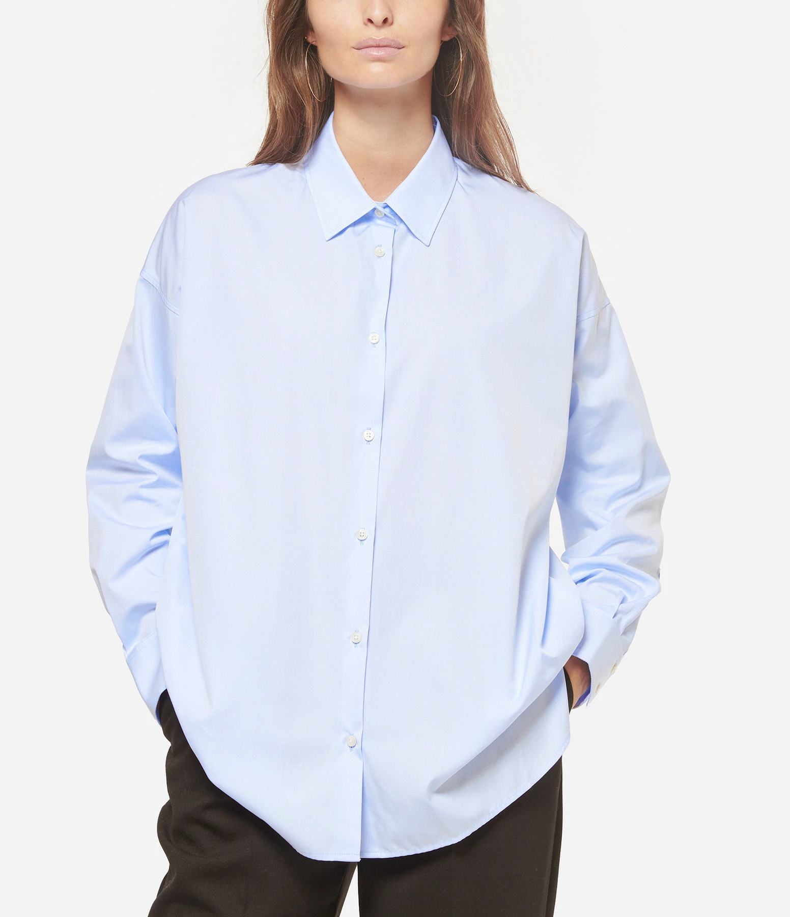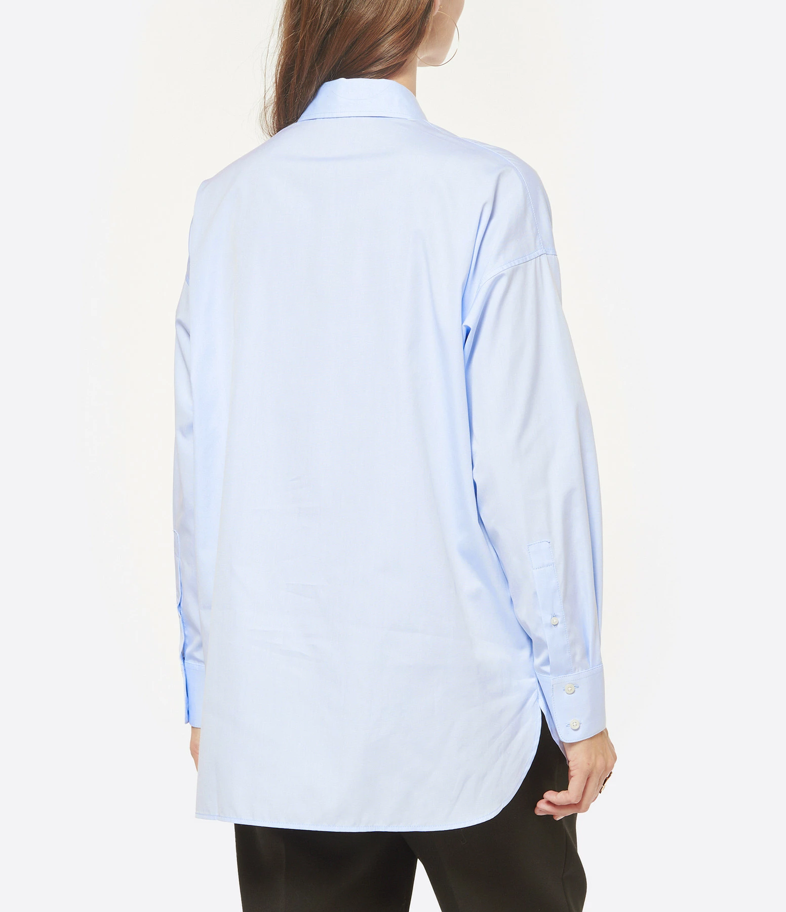 Chemise en coton bleu. Col chemise. Manches longues. Fermeture boutonnée. Coupe ample. Base arrondie.
