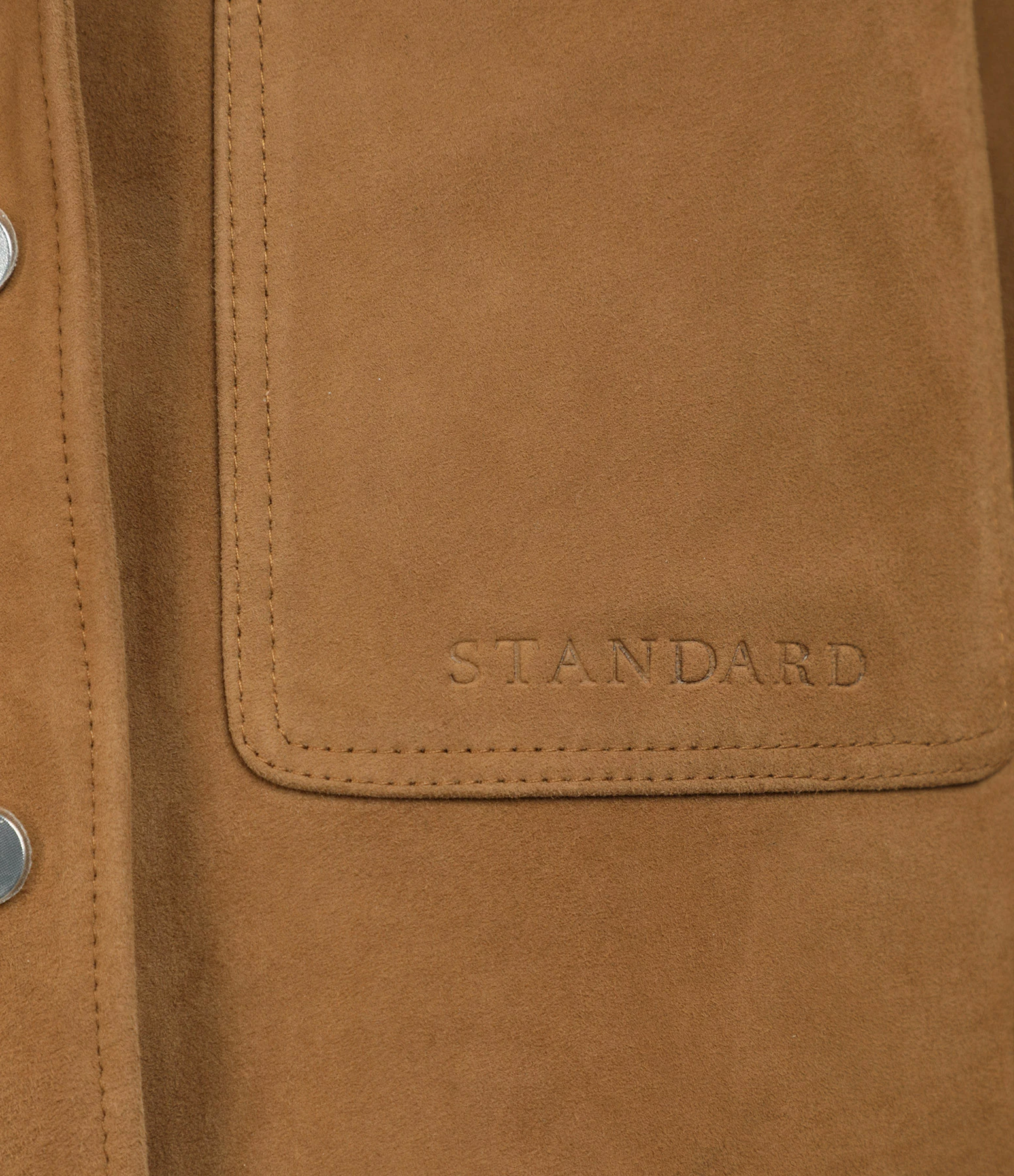 Veste courte en cuir velours marron. Col chemisier. Manches longues. Fermeture par boutons pressions. Deux poches plaquées à l’avant. Coupe droite. Base droite. Doublée.