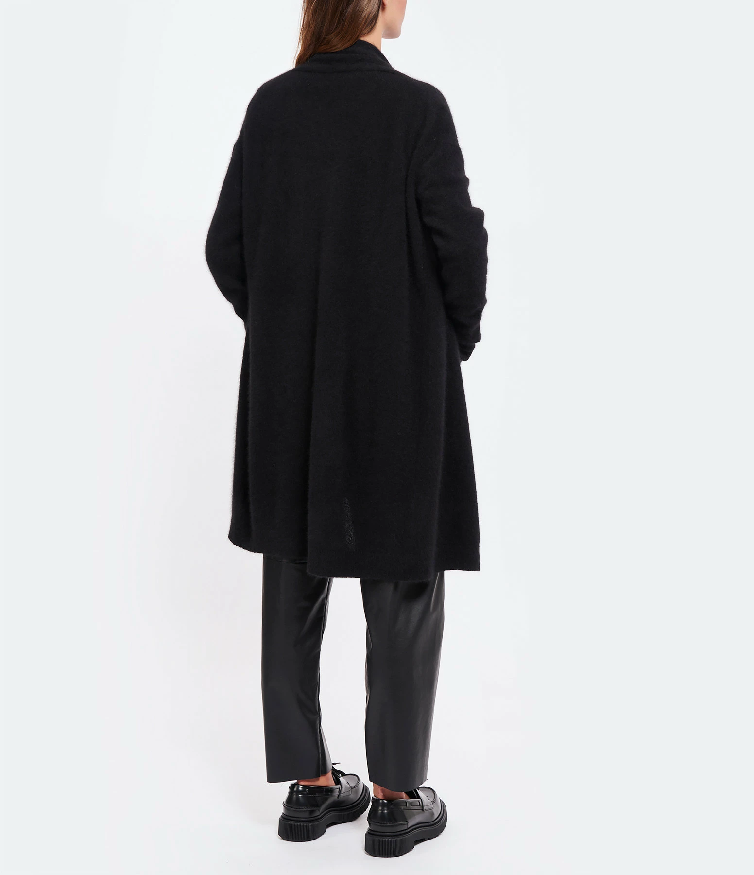 Gilet long en mailles noir. Col châle. Manches longues. Coupe droite. Base droite côtelée.