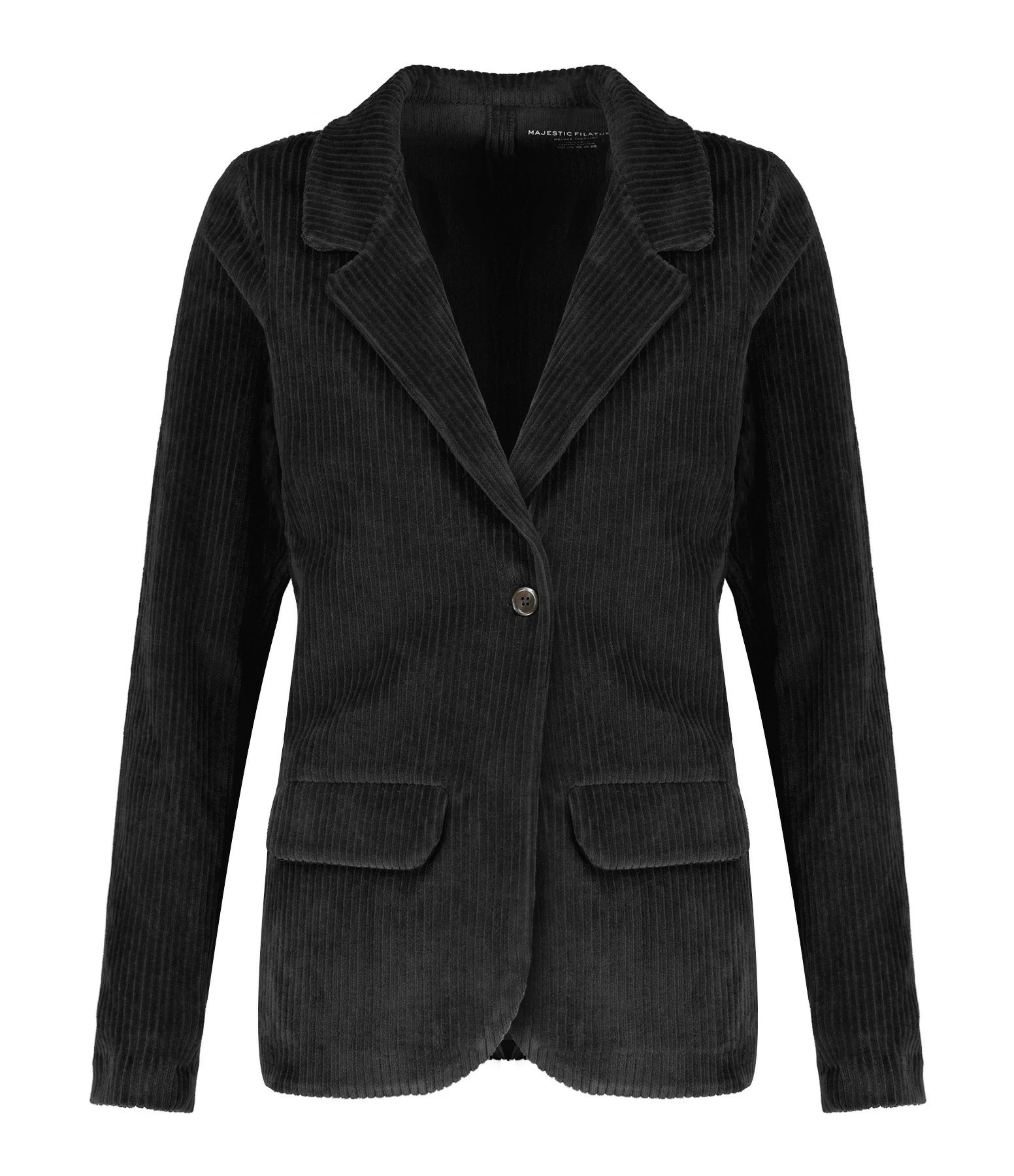 Veste blazer en velours côtelé de coton noir. Col tailleur cranté. Manches longues tailleur. Fermeture boutonnée simple sur le bouton. Bouton effet corne. Deux poches à rabat sur le devant. Coupe droite. Base arrondie.