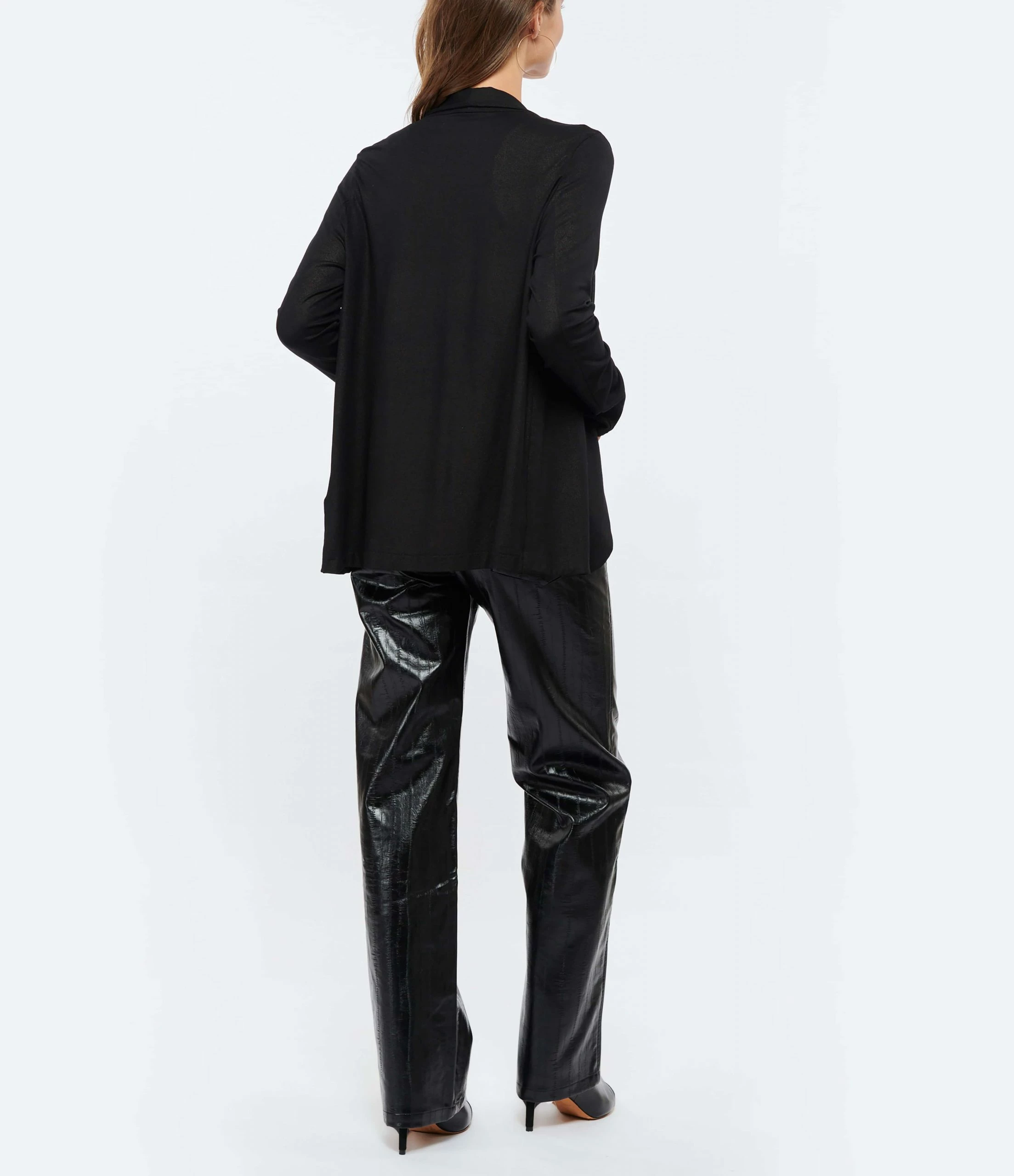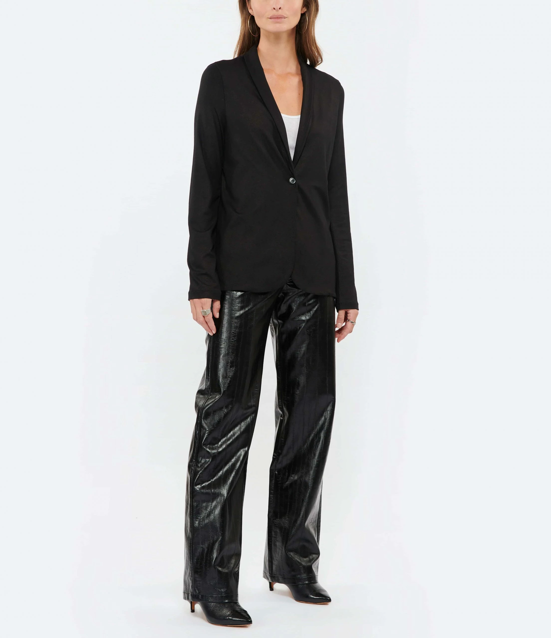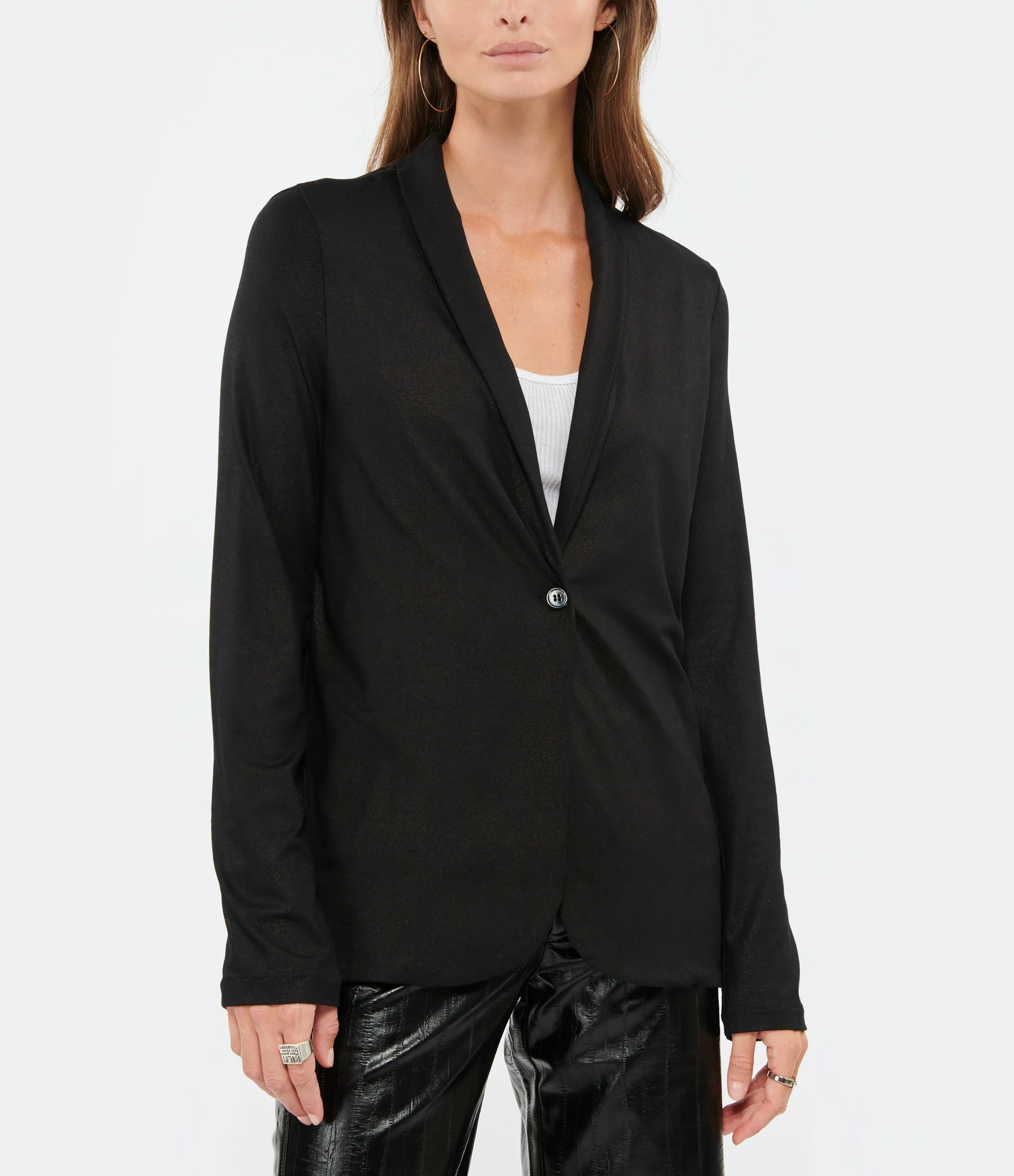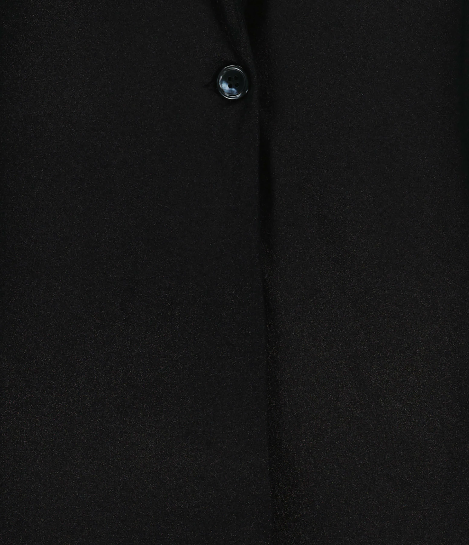 Veste blazer en tissu stretch métallisé noir. Col châle. Manches longues tailleur. Fermeture boutonnée simple sur le bouton. Bouton effet corne. Coupe droite. Base arrondie.