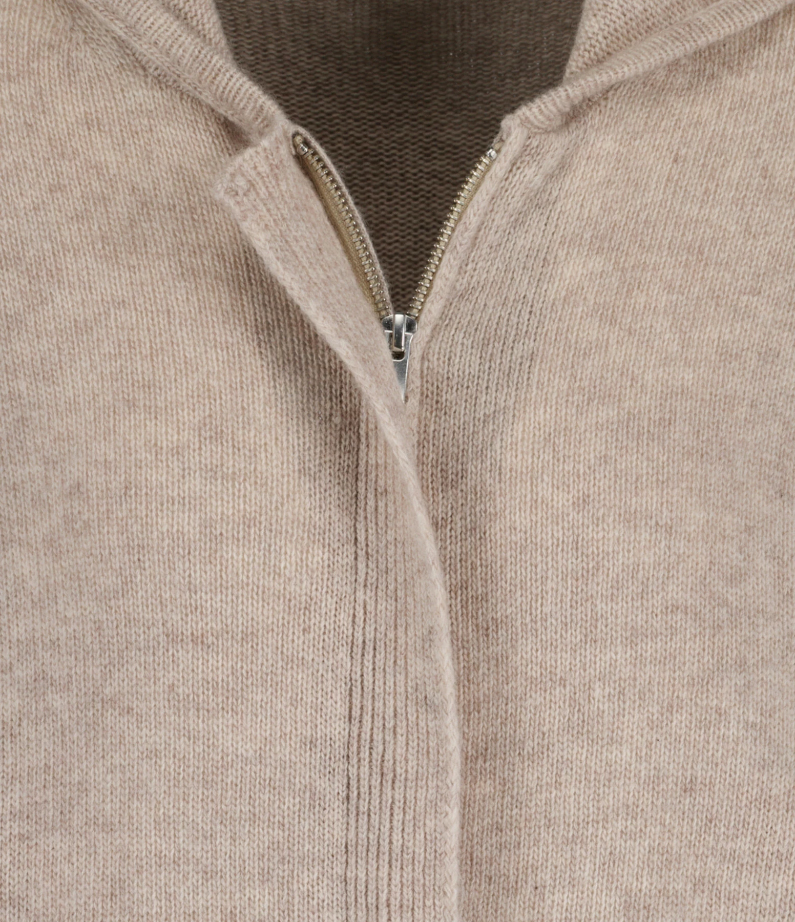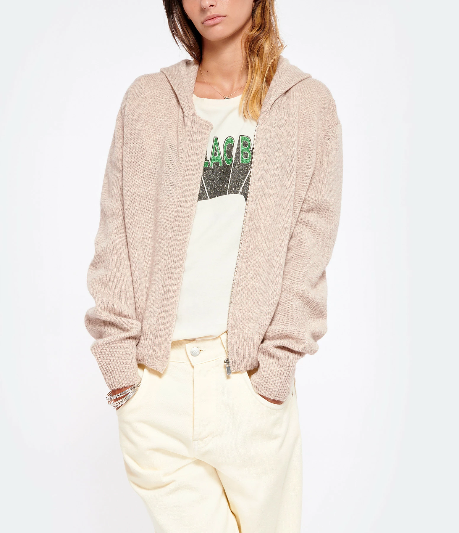 Veste courte en maille de laine et cachemire rose poudré. Col à capuche. Manches longues avec poignets côtelés. Fermeture zippée cachée sur le devant. Coupe droite. Base droite côtelée.