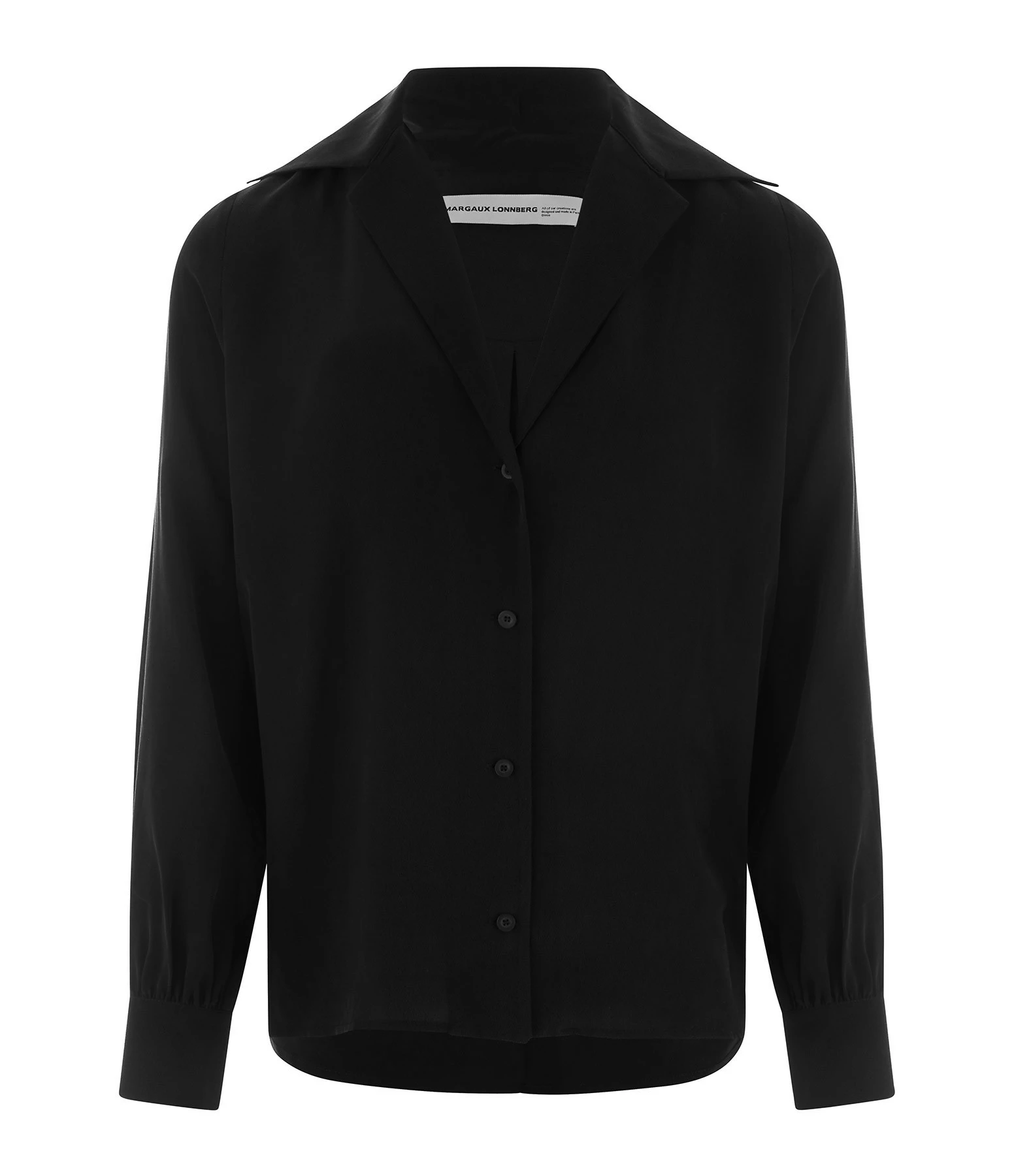 Chemise en soie noire. Col V à revers. Manches longues. Fermeture par boutons. Coupe droite. Base droite. Non doublée.