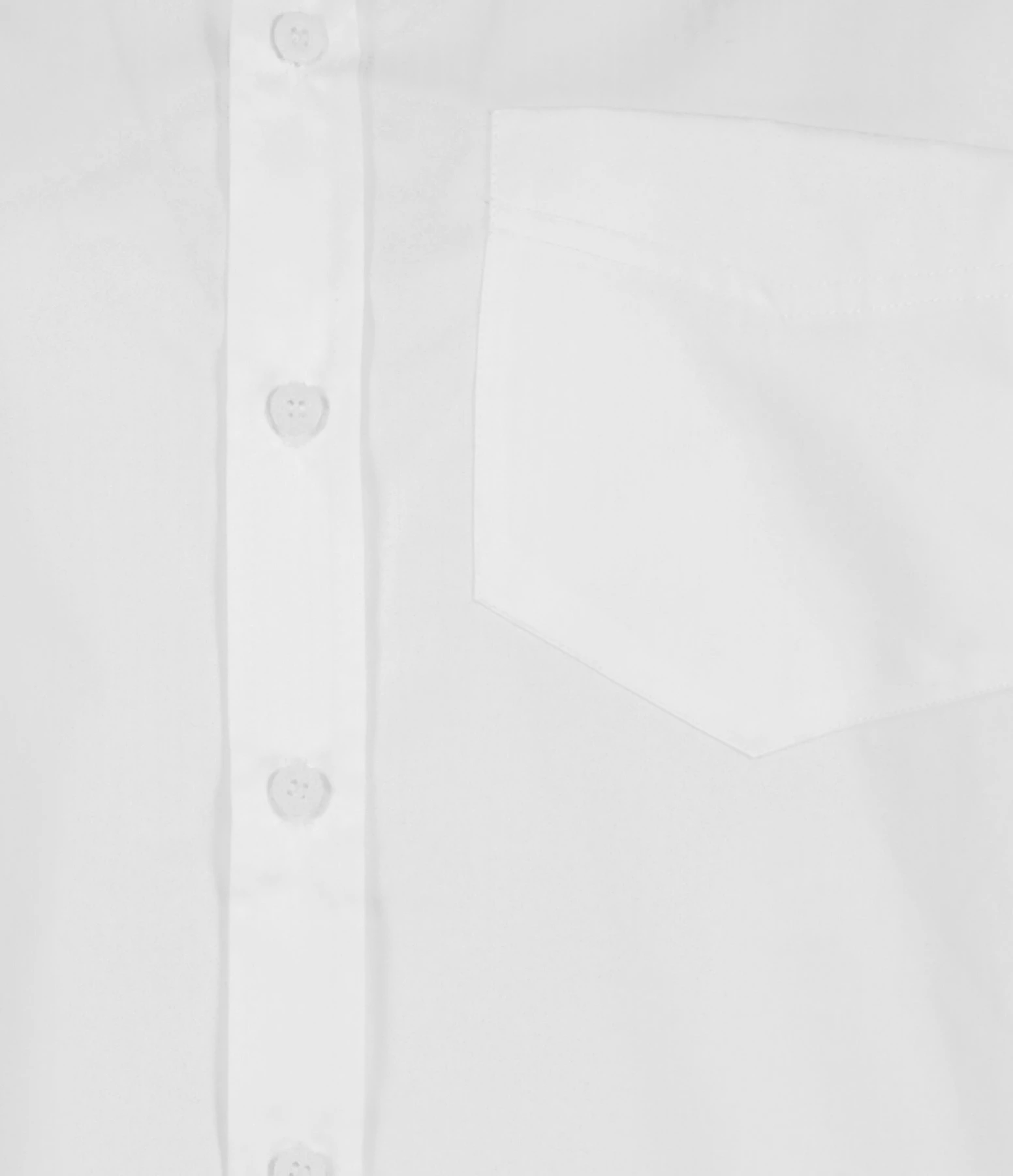 Chemise en coton blanc. Col chemisier. Manches longues avec fentes et poignets boutonnés. Logo brodée en blanc sur le poignet. Fermeture boutonnée sur le devant. Boutons blancs. Une poche plaquée poitrine. Un pli creux dans le dos. Coupe droite ample. Base arrondie.