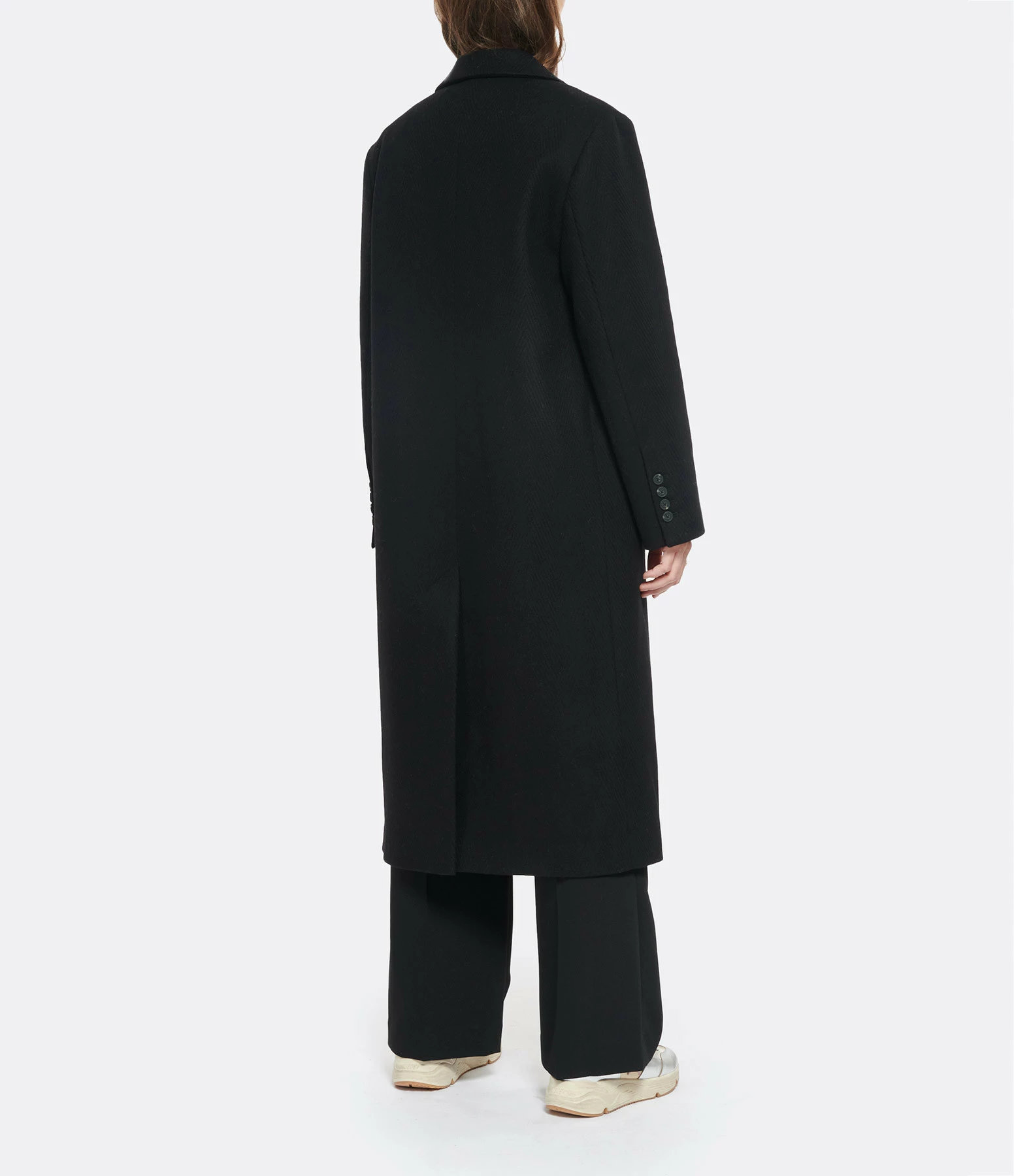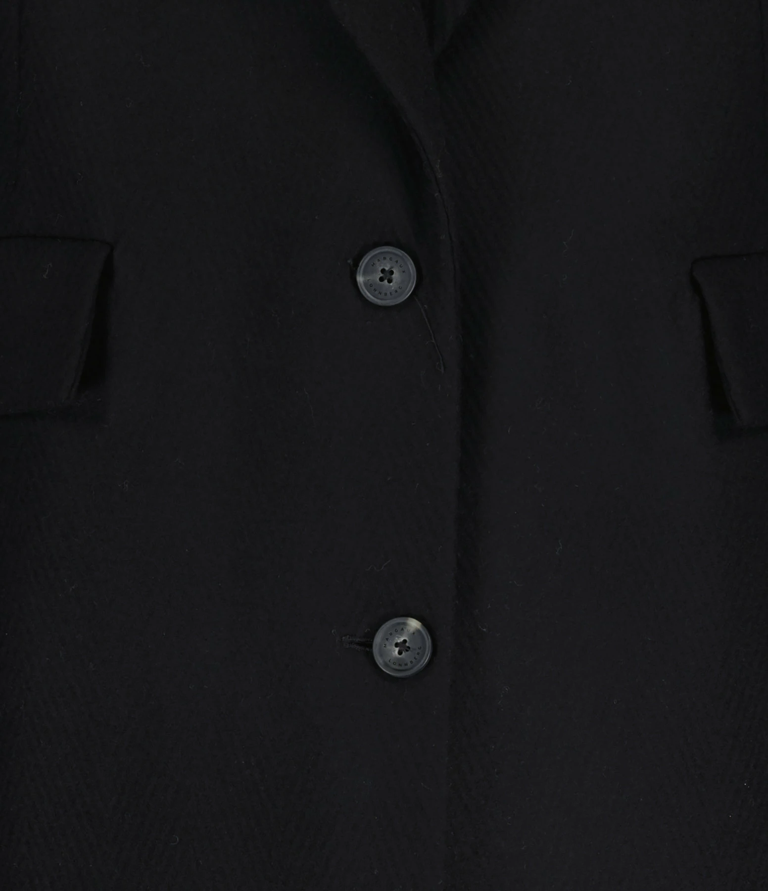Manteau long en laine mélangée noir. Col tailleur cranté. Manches longues tailleur avec fentes et poignets boutonnés. Une poche poitrine et deux poches à rabat sur le devant. Fermeture par boutons. Fente milieu dos de 43 cm. Coupe droite. Base droite. Doublé.