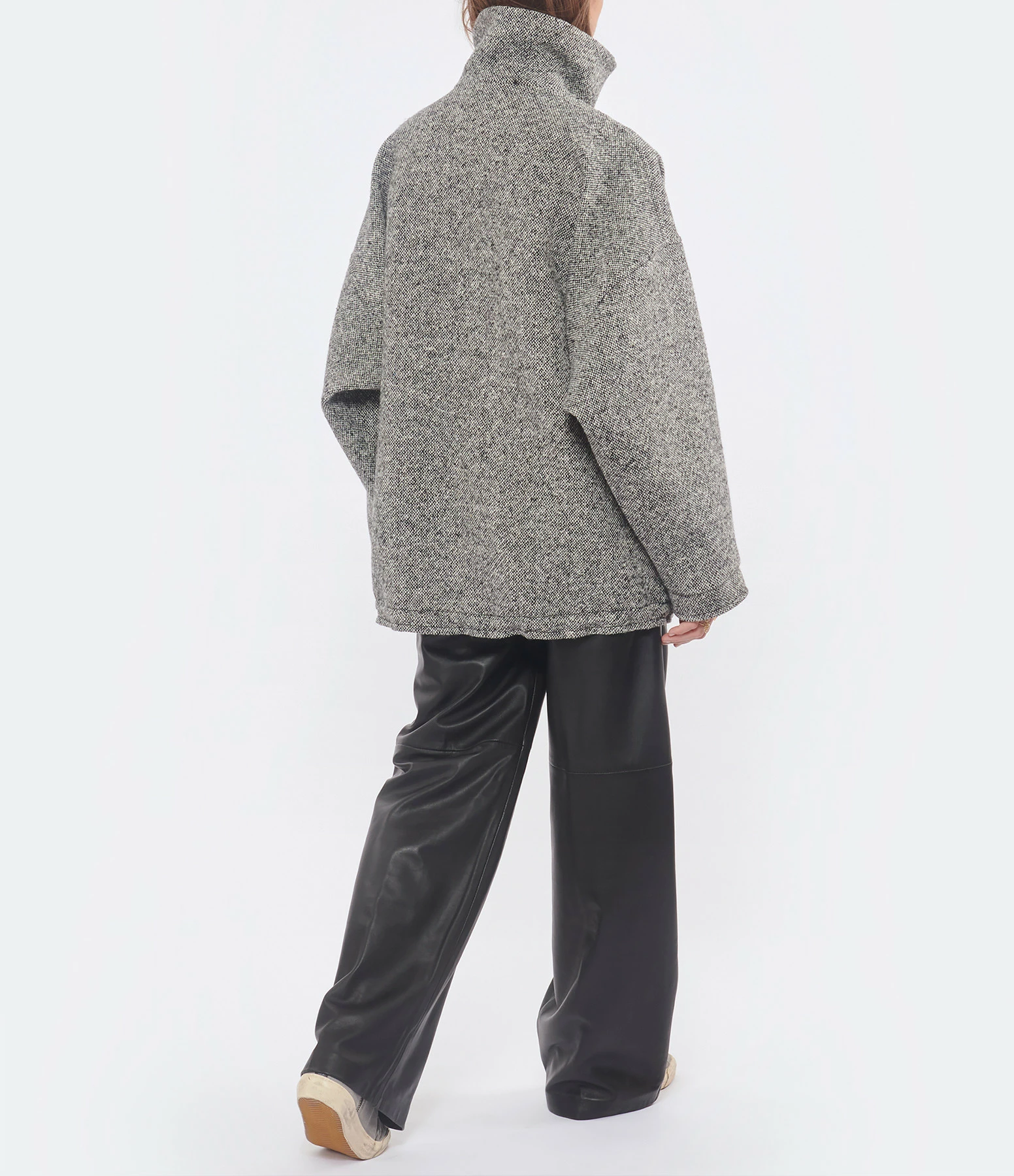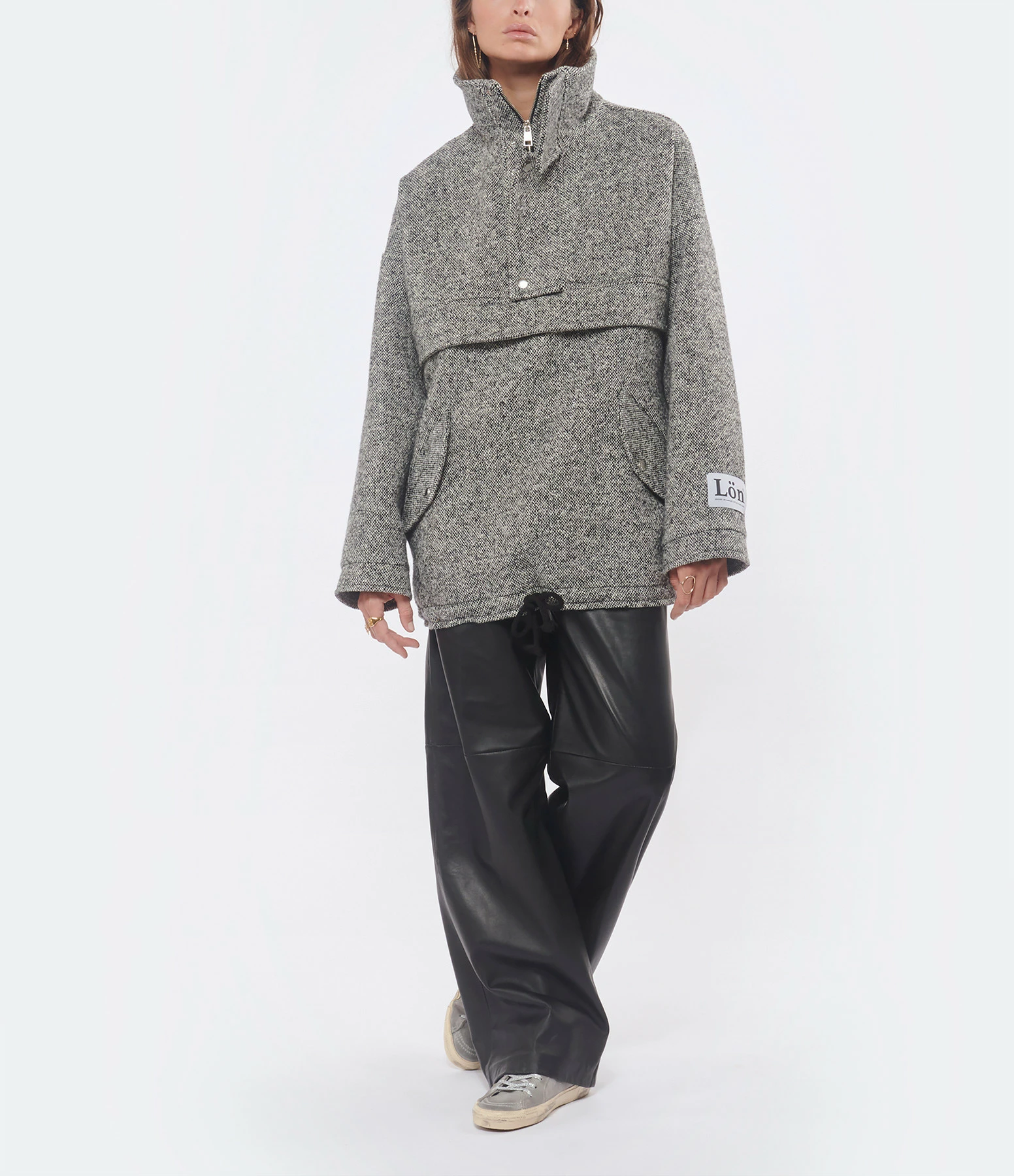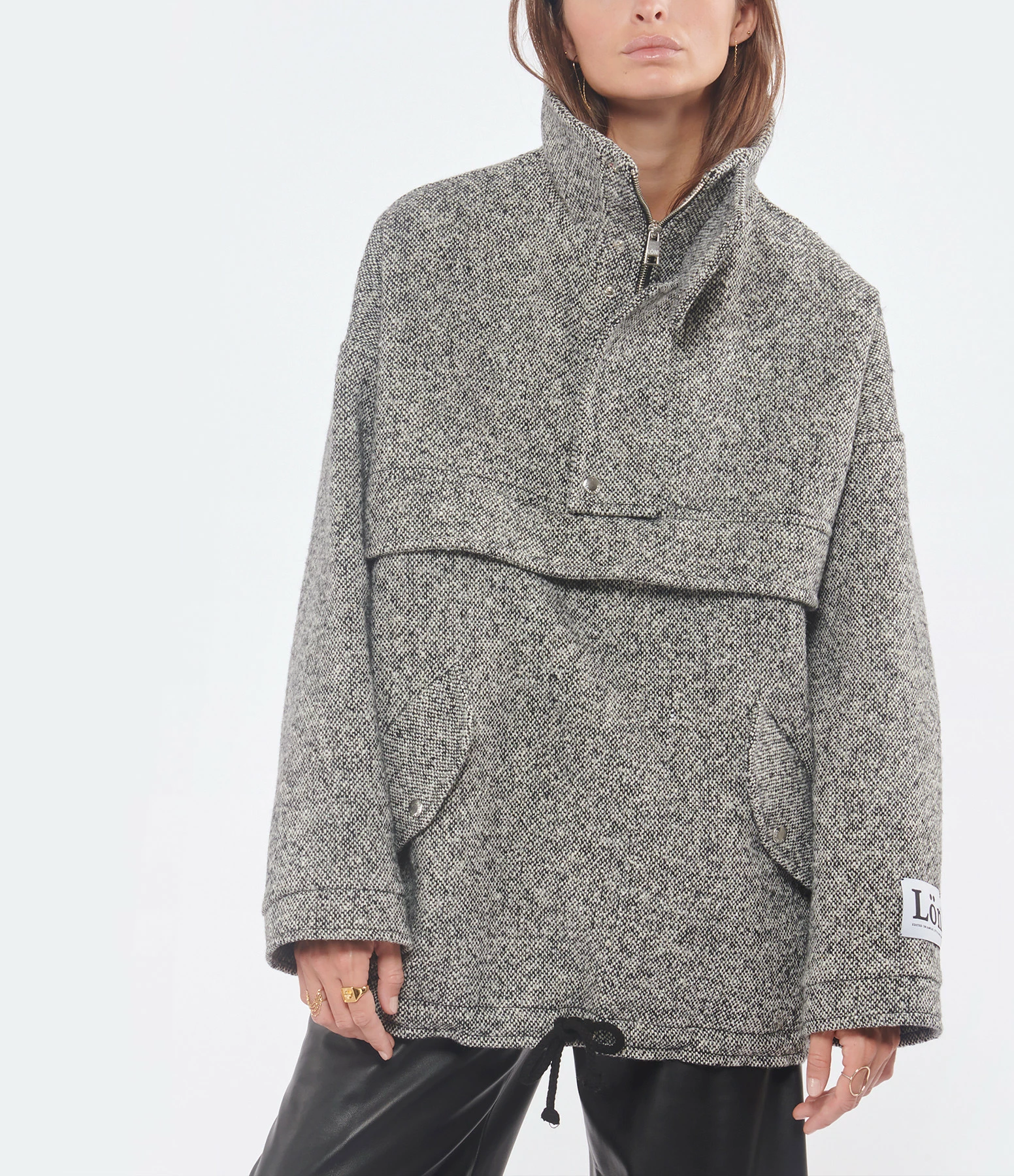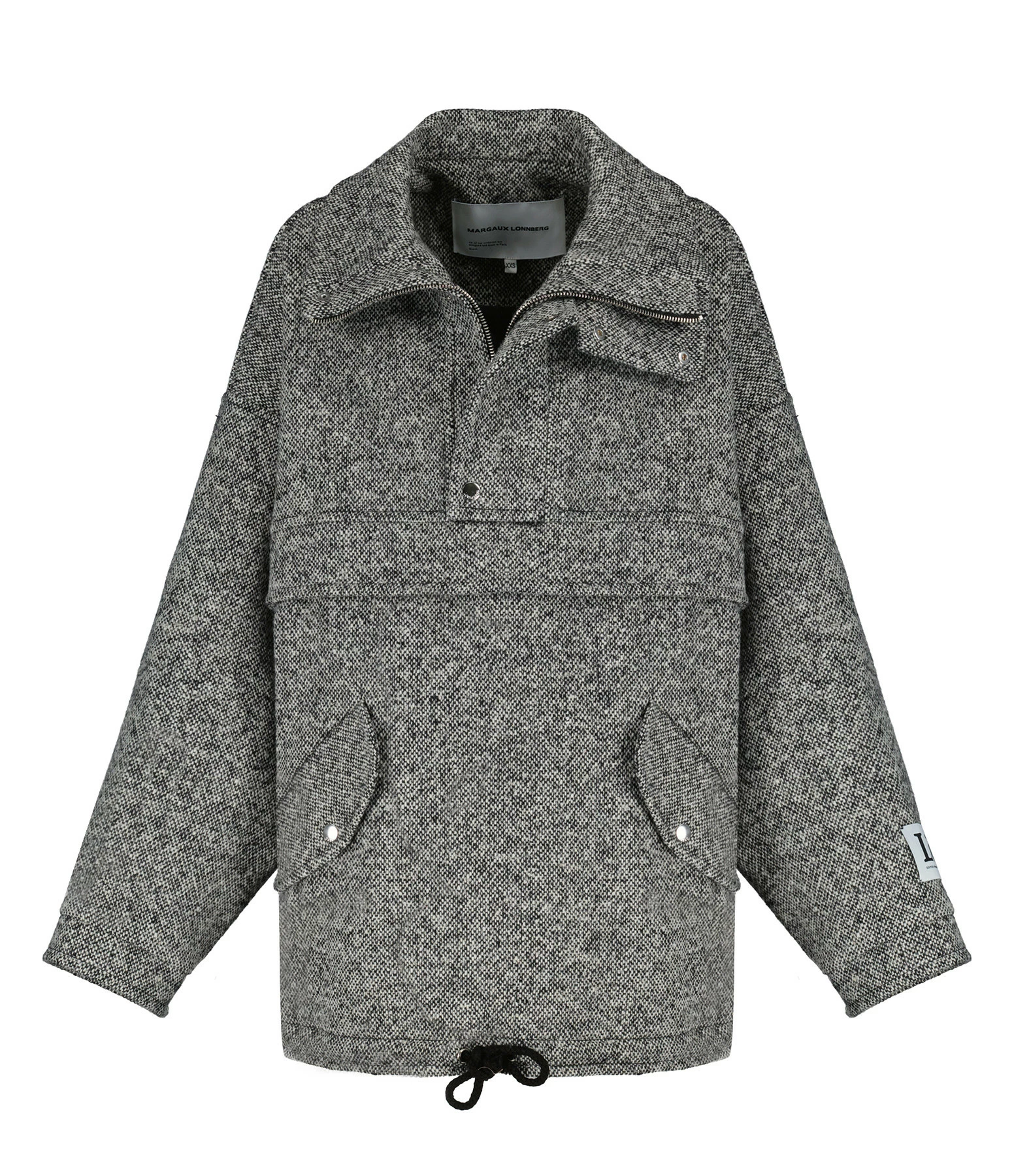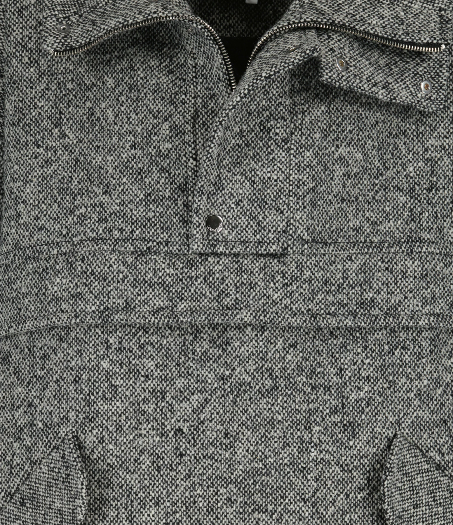 Anorak en tweed gris. Col montant zippé et pressionné. Boutons pressions métalliques argentés gravés du logo. Manches longues. Etiquette blanche avec logo cousue sur la manche gauche. Une poche zippée cachée sous un long rabat cousu le long de la poitrine. Deux poches à rabat pressionné sur le devant. Coupe droite large. Base droite avec cordons de serrage noirs. Doublé.
