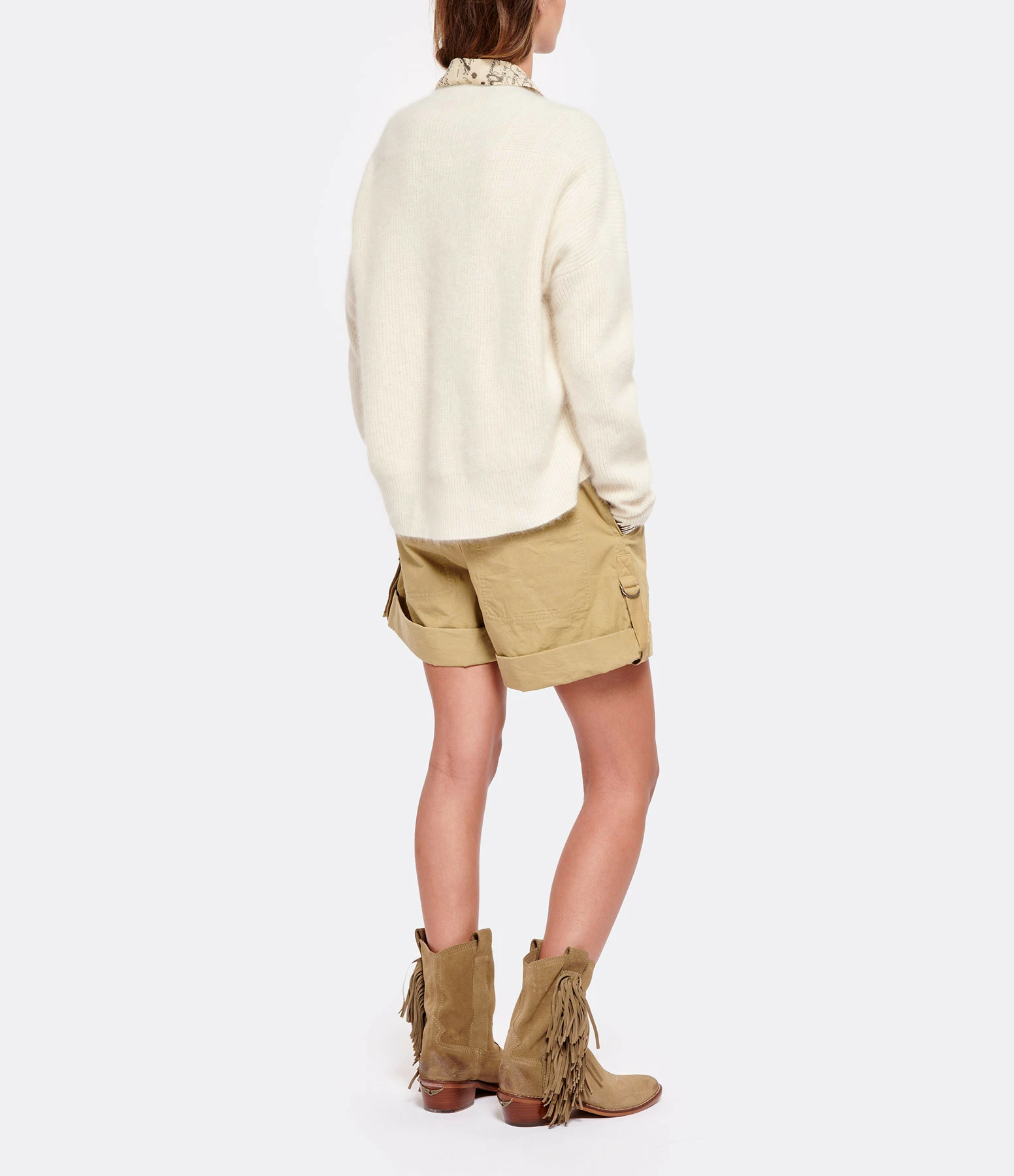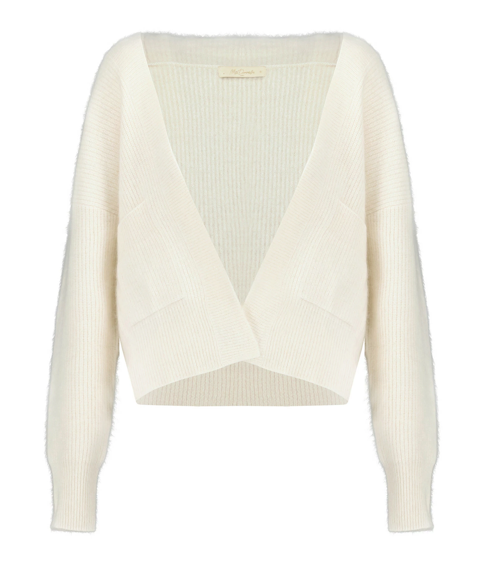 Cardigan court en laine blanc. Deux poches plaquées latérales. Base arrondie.