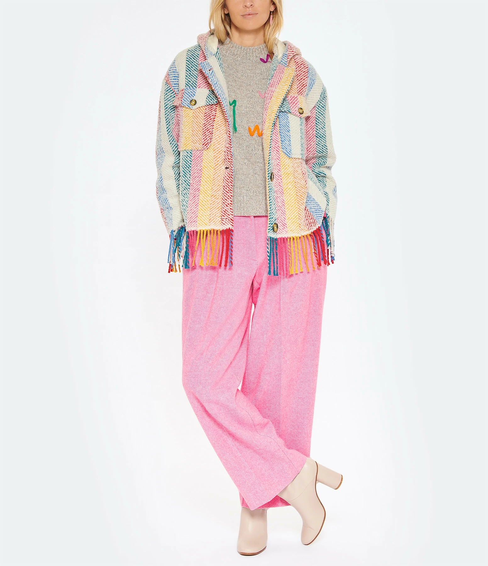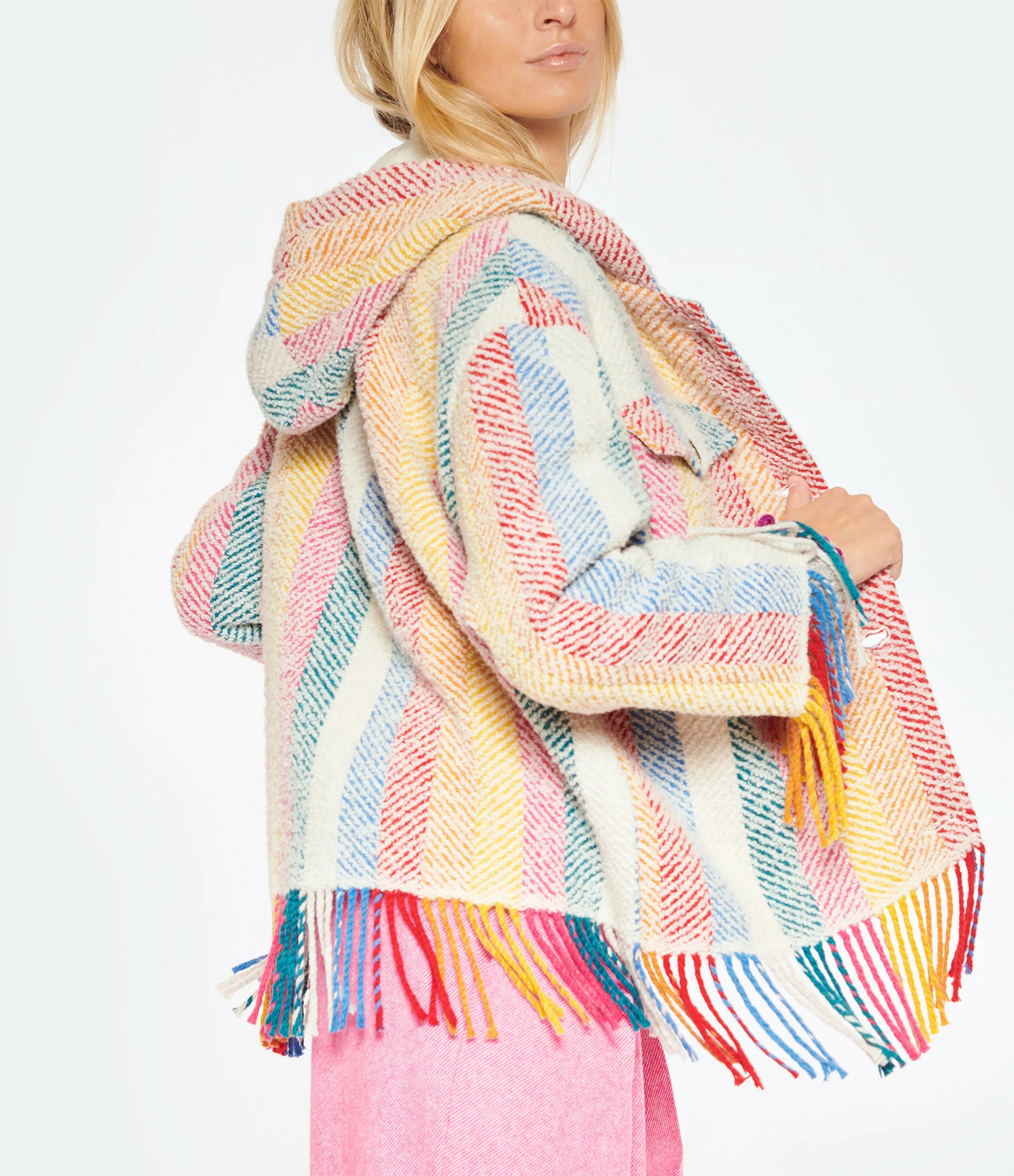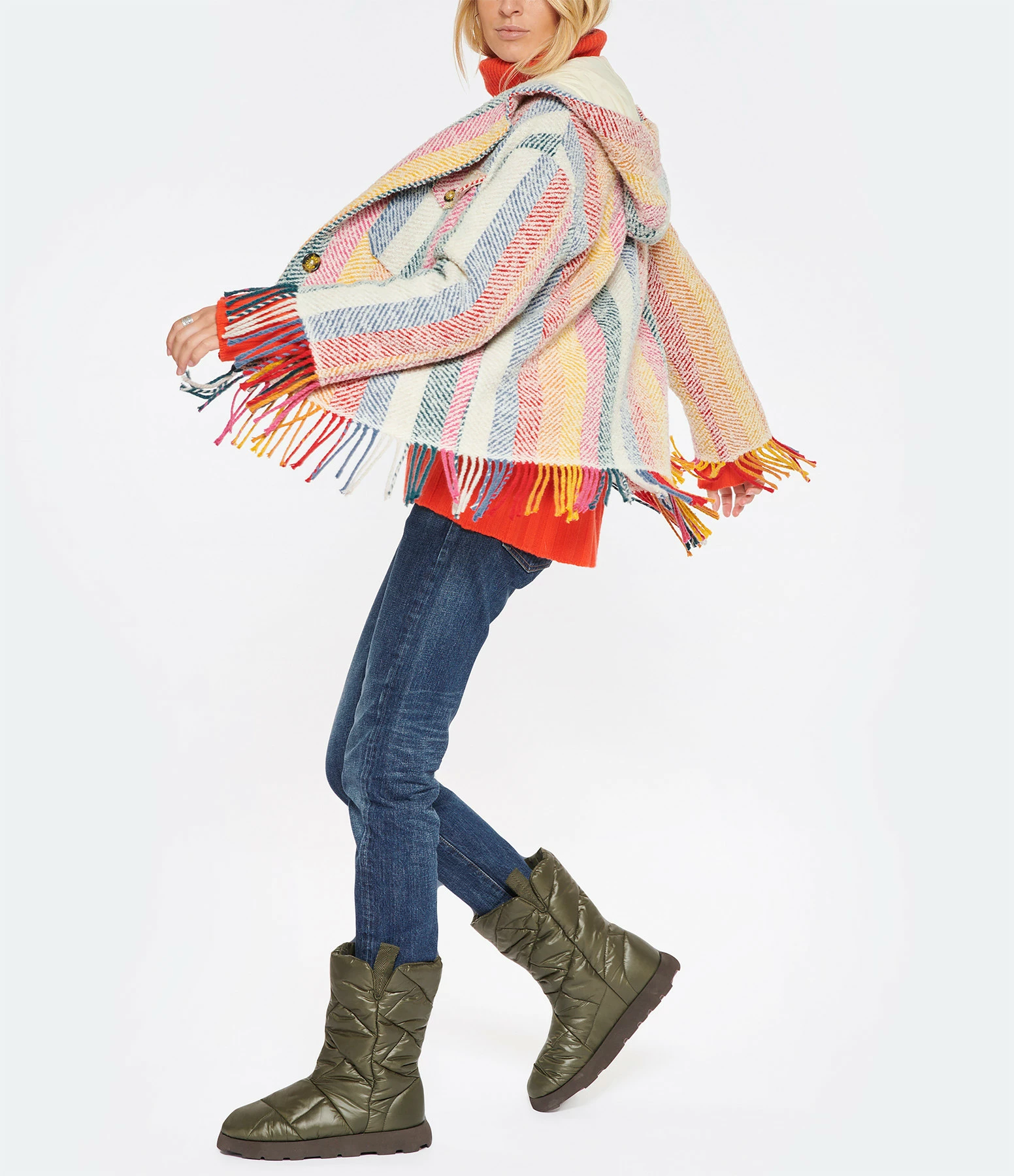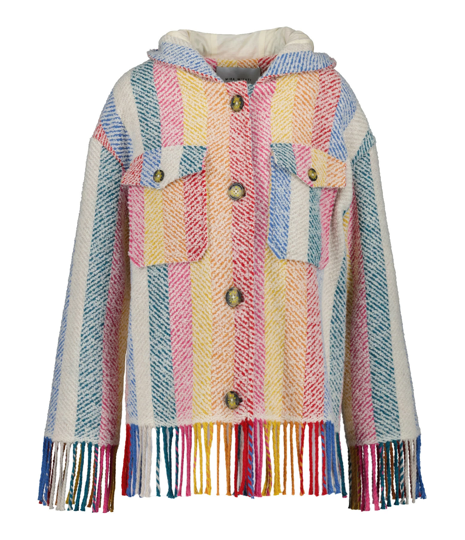 Veste courte en tweed de laine mélangée à rayures multicolores. Encolure à capuche. Manches longues avec bords frangés. Fermeture boutonnée simple sur le devant. Deux poches plaquées à rabat boutonné sur le devant. Boutons marron effet corne. Coupe droite. Base droite frangée. Doublée.