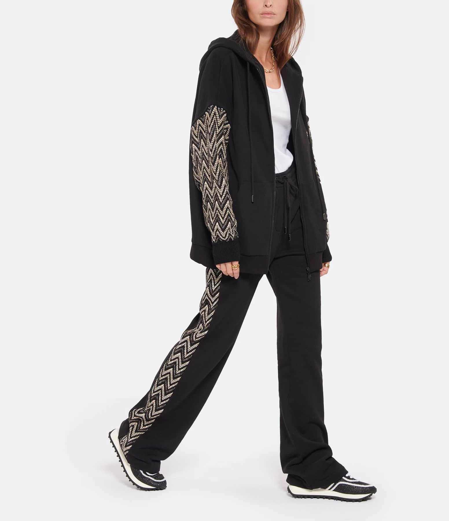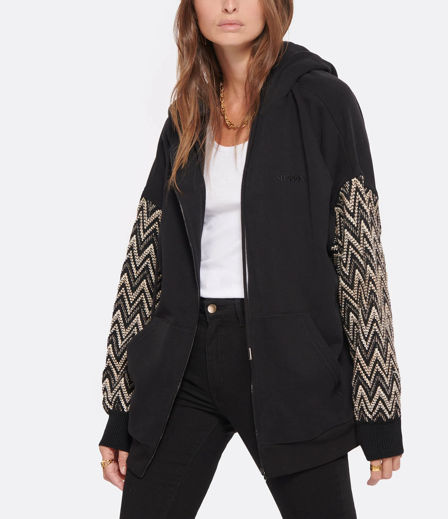 Gilet style sweatshirt en coton molletonné noir. Manches longues brodées écru et beige. Fermeture zippée. Empiècement “MISSONI” noir sur poitrine. Col à capuche avec liens de serrage. Poche kangourou à l’avant. Coupe droite. Base arrondie.