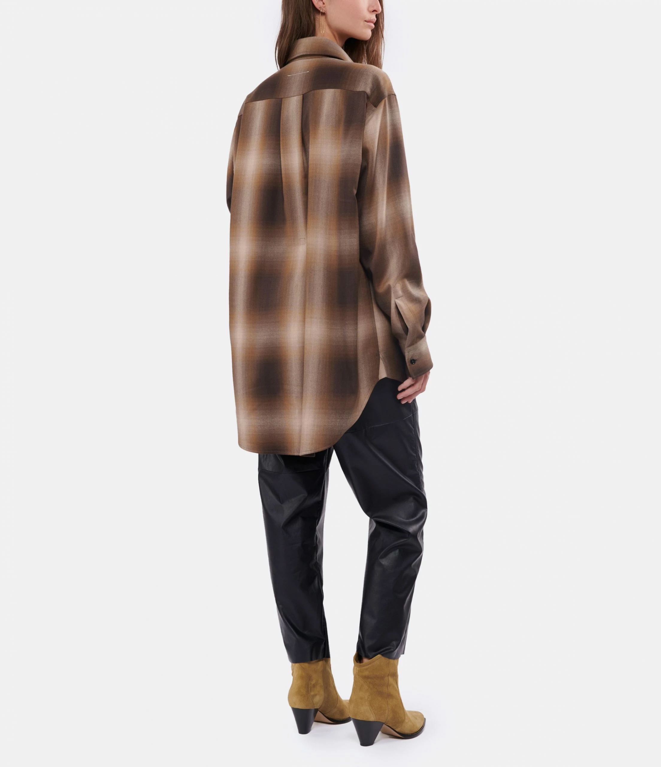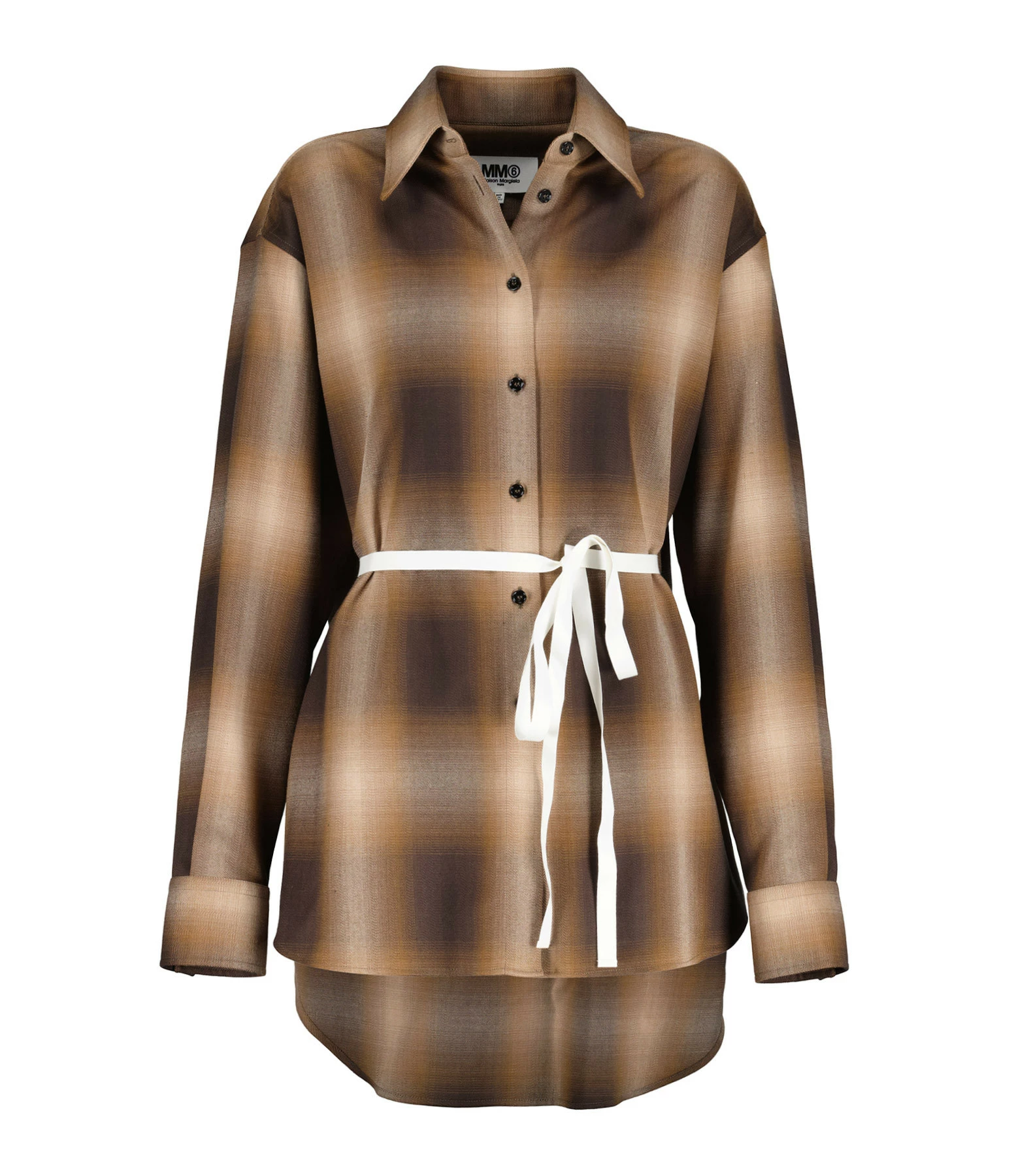 Chemise longue à carreaux marrons. Ceinture en coton blanc, cousue à l’intérieur effet cache-cœur à nouer à l’avant. Base arrondie et légèrement plus longue.