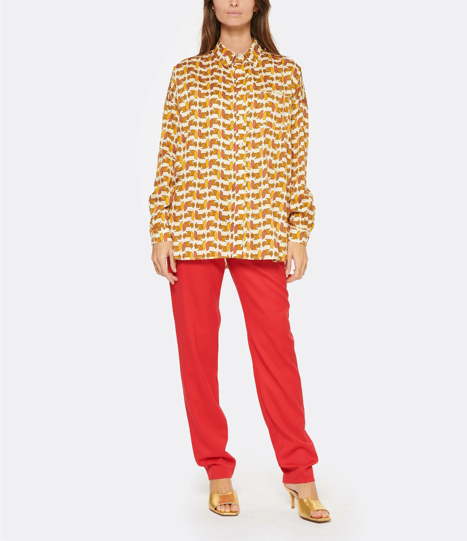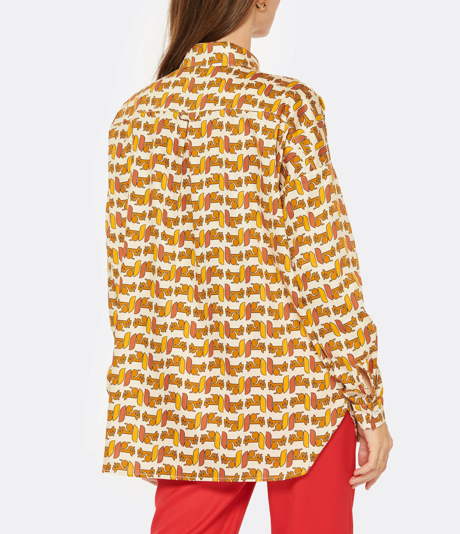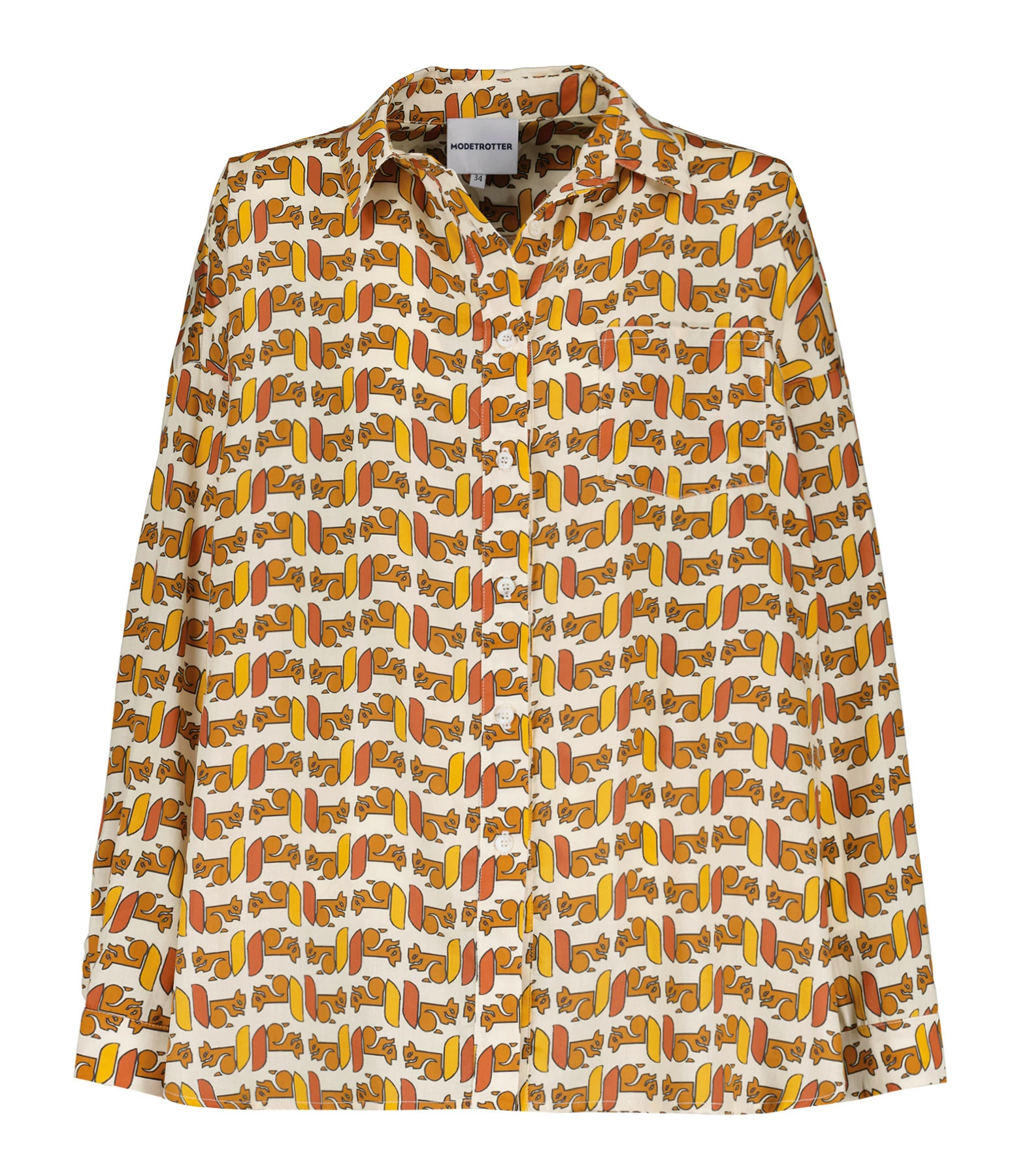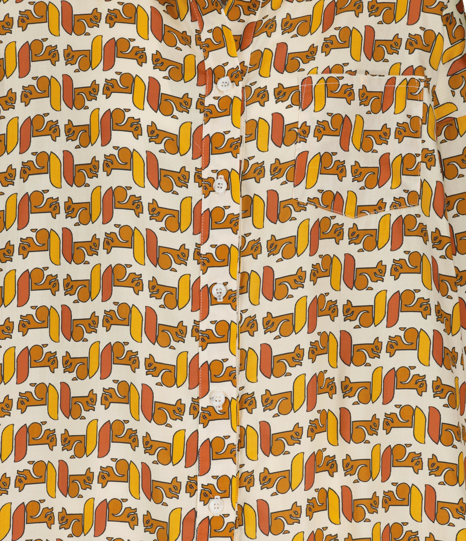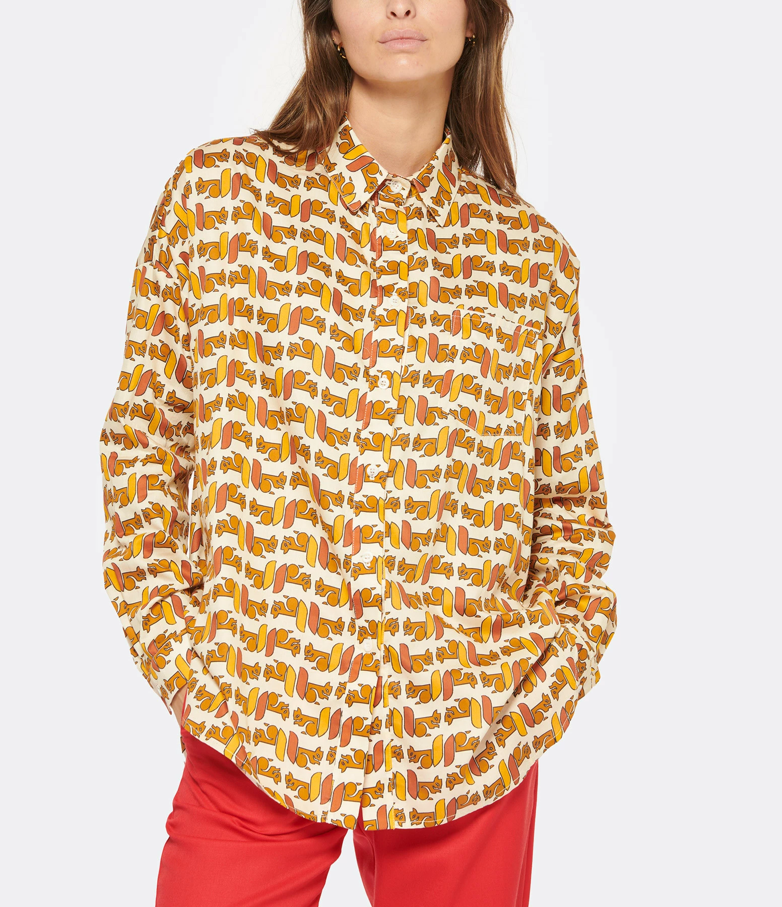 Chemise en coton à imprimé écureuil. Col chemise. Manches longues avec fentes et poignets boutonnés. Fermeture boutonnée sur le devant. Petits boutons blancs nacrés. Une poche plaquée poitrine. Pli creux dans le dos. Fentes latérales. Coupe ample. Longueur plus longue dans le dos que sur le devant. Base arrondie. Non doublée