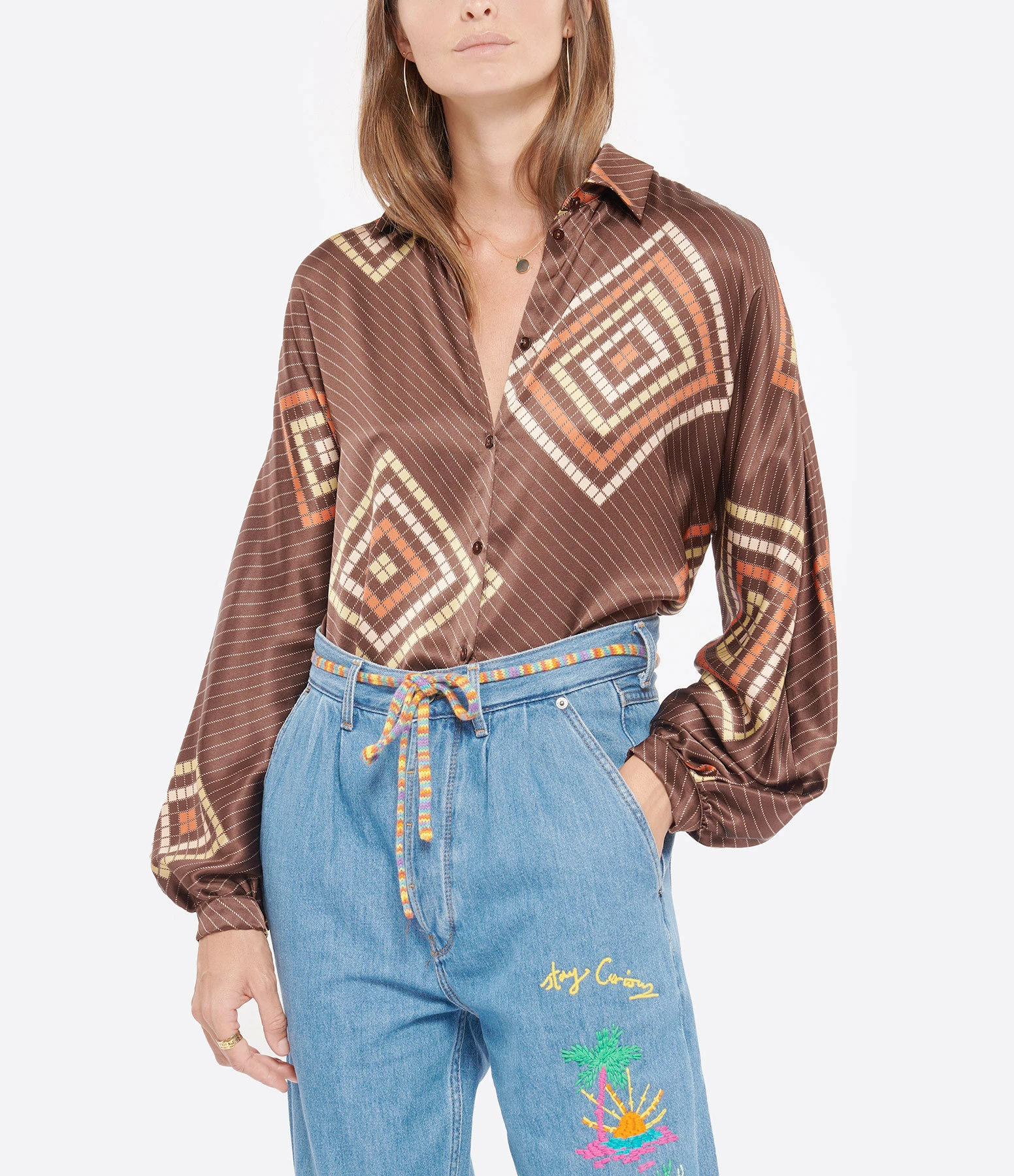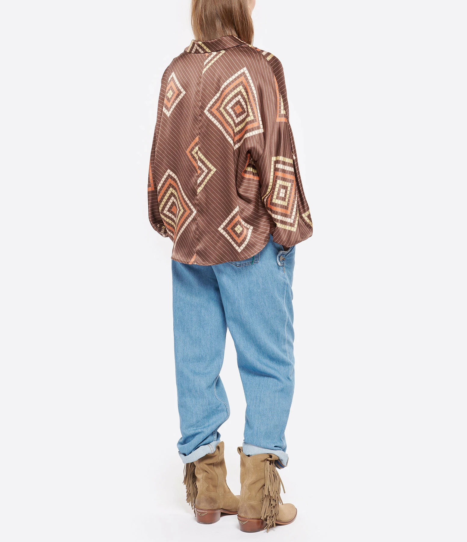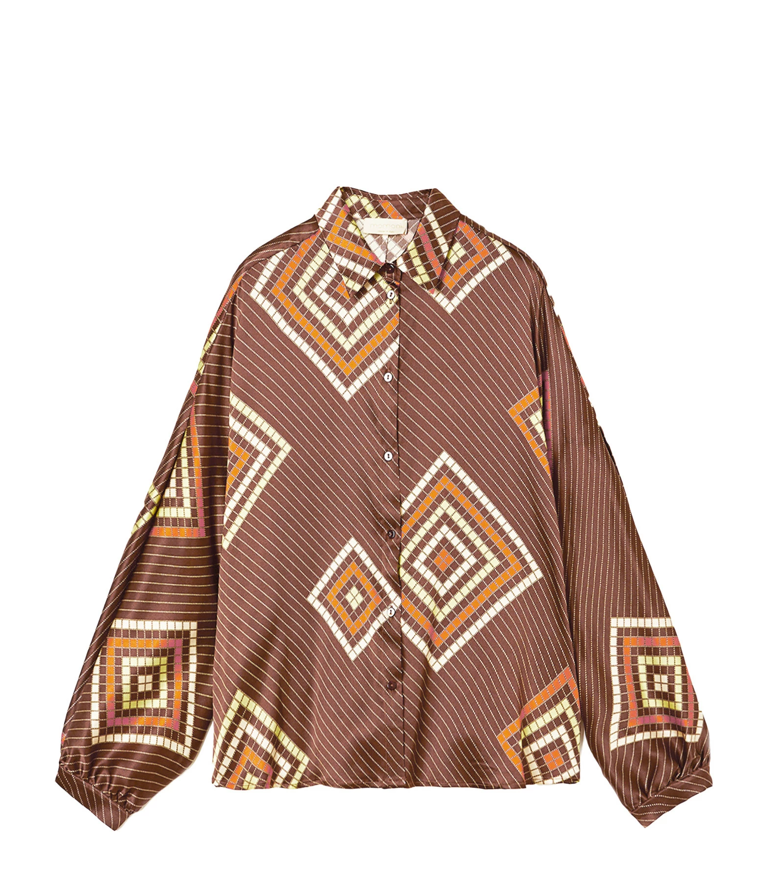 Chemise en soie marron à imprimé losange orange, vert et blanc. Col chemiser. Manches longues. Fermeture boutonnée. Coupe ample. Base droite.