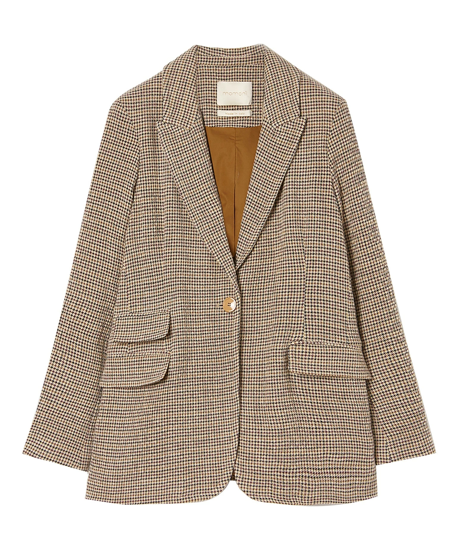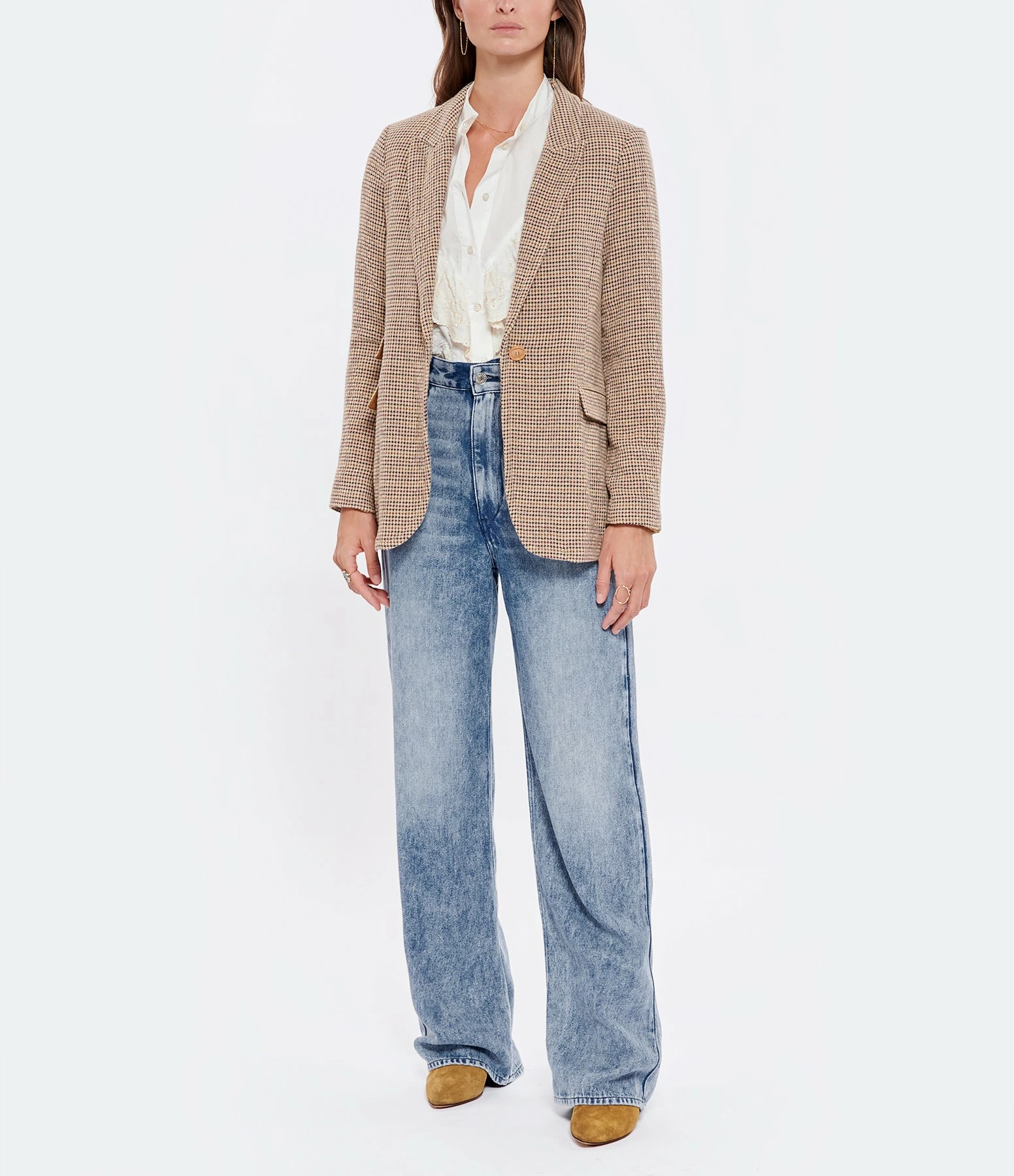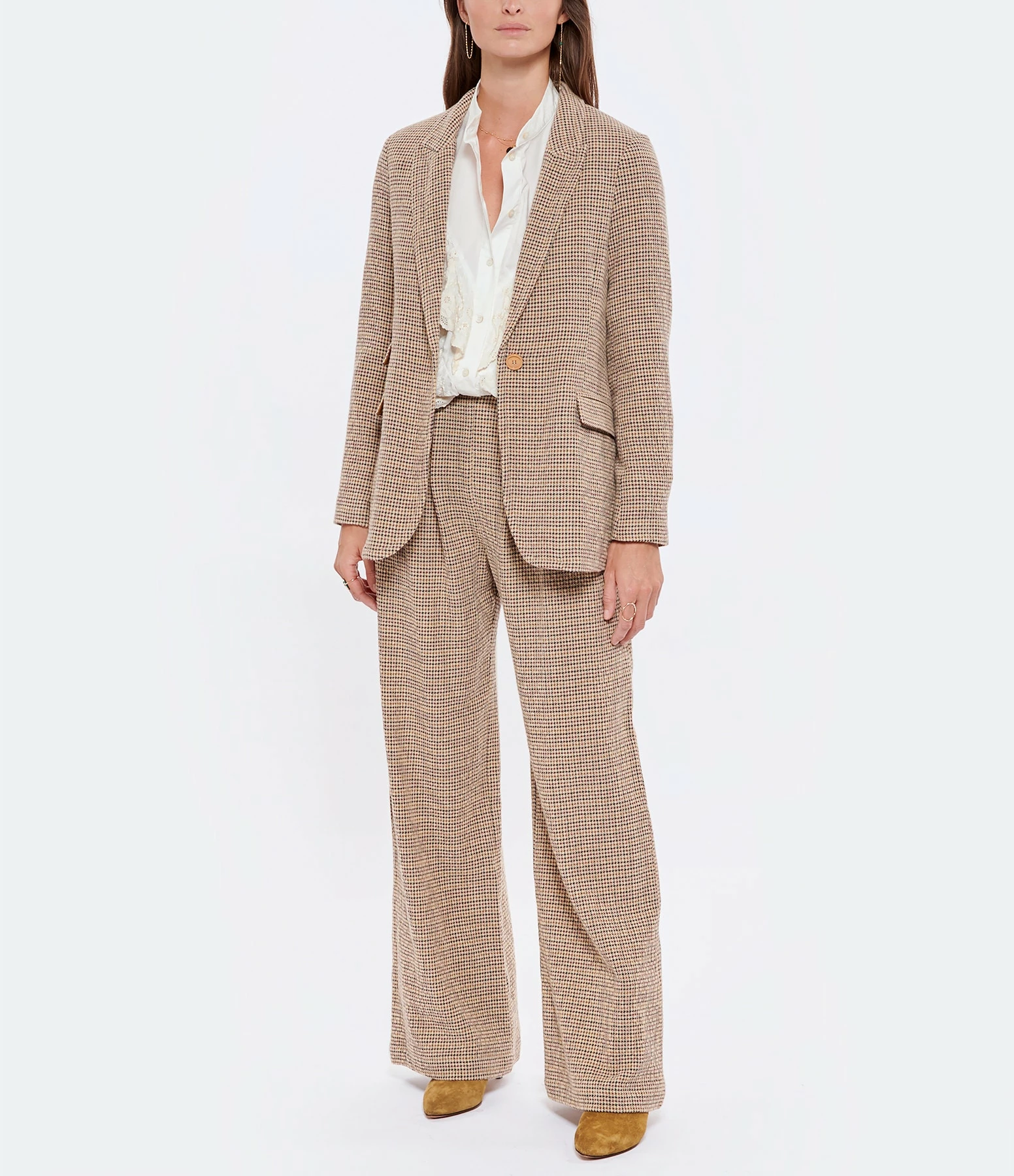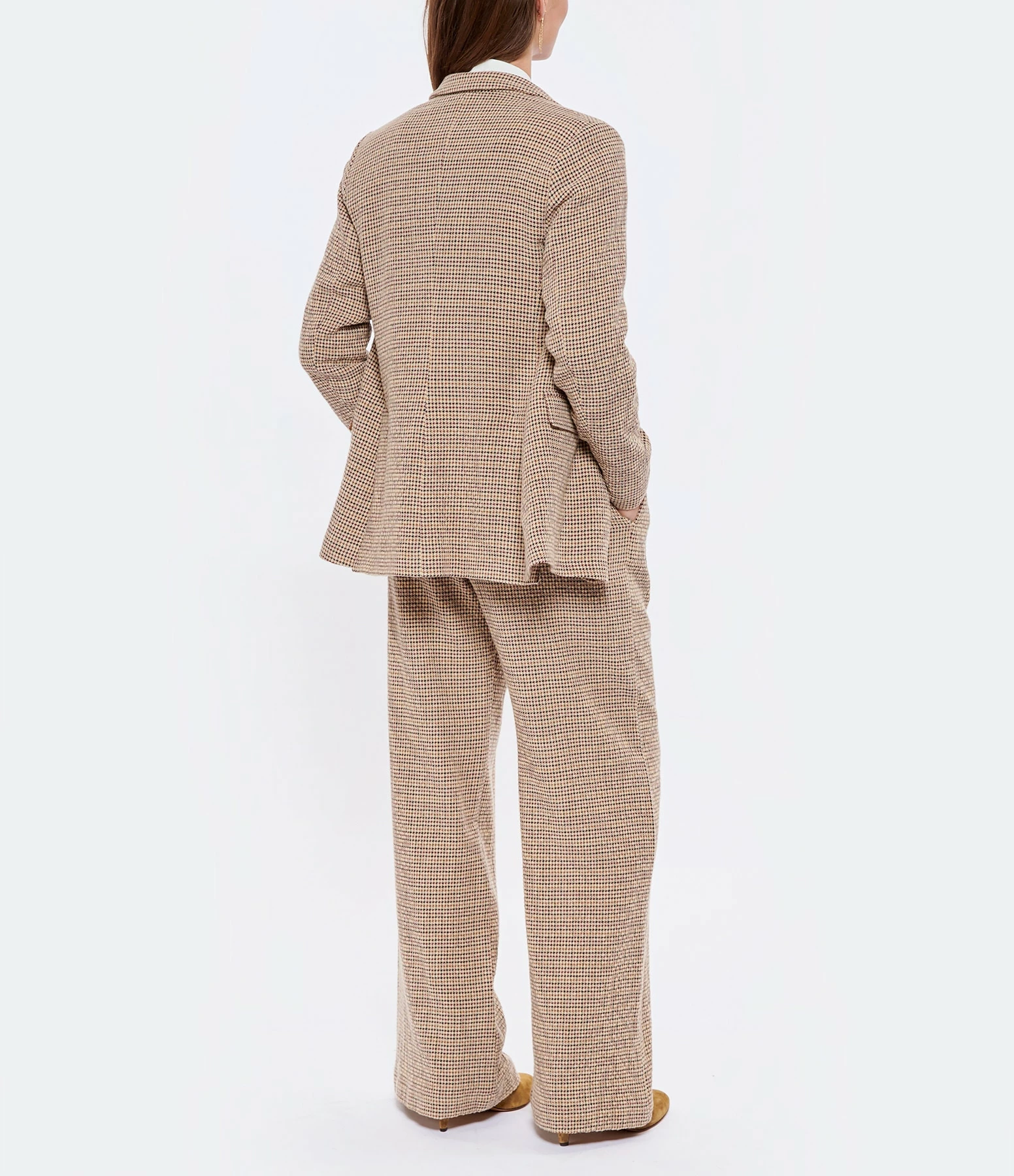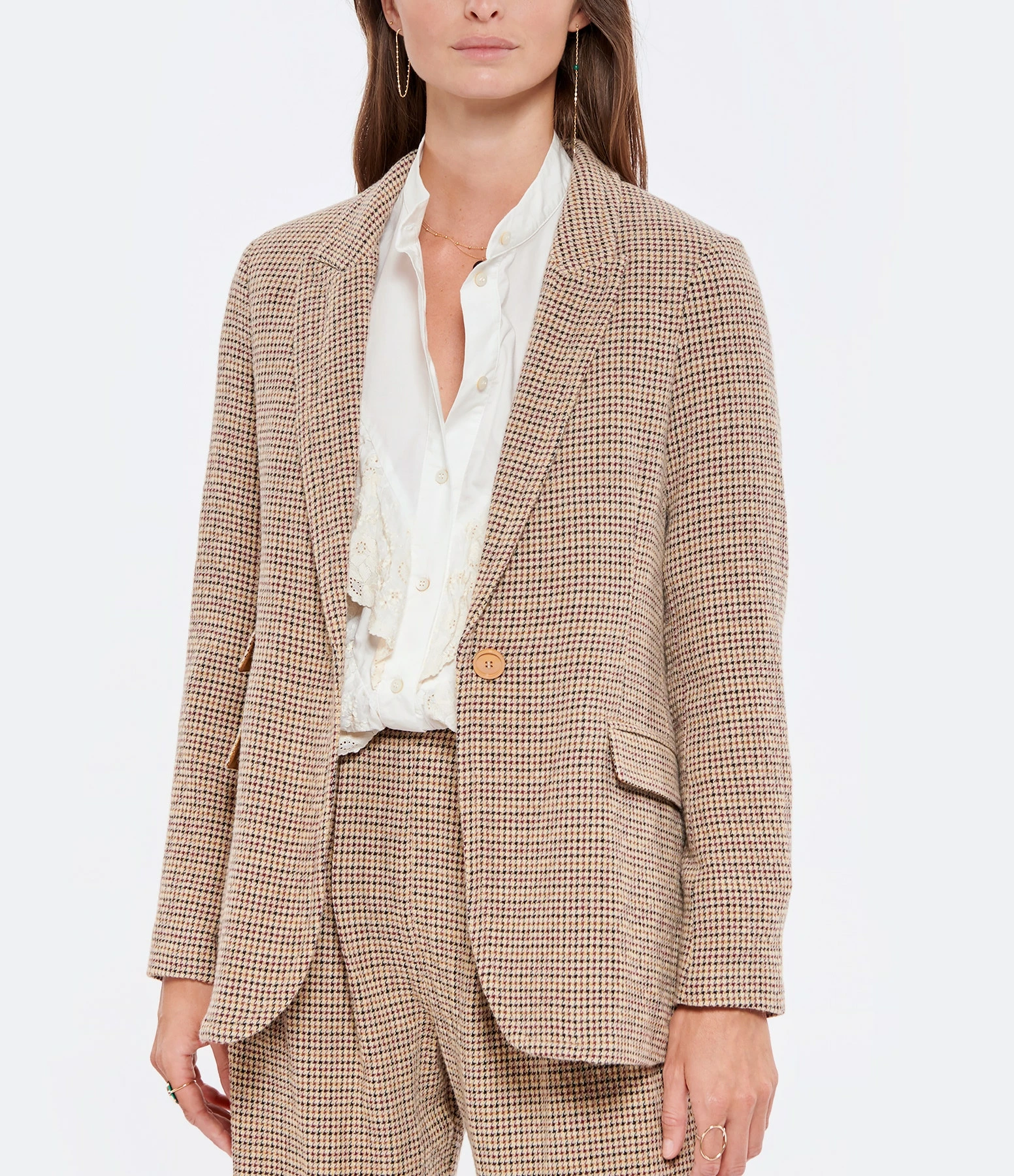 Veste tailleur en laine mélangée à motifs pied-de-poule beige. Col tailleur cranté. Manches tailleur longues. Fermeture boutonnée simple avec un bouton sur le devant. Trois poches à rabat sur le devant. Fentes latérales. Coupe droite. Base arrondie. Doublée en coton.
