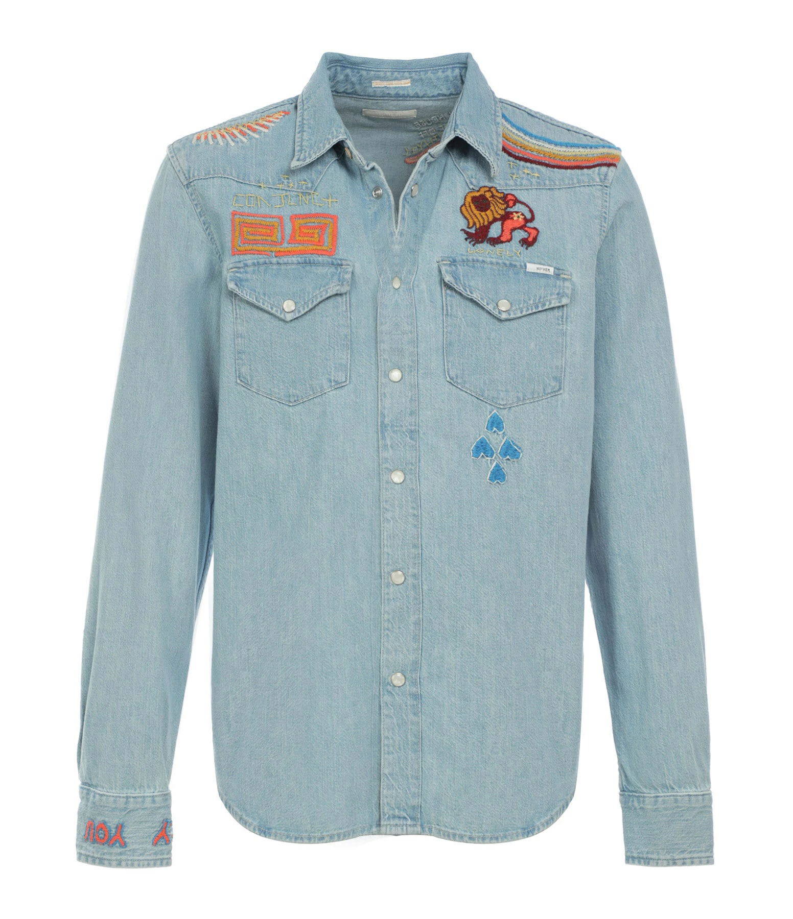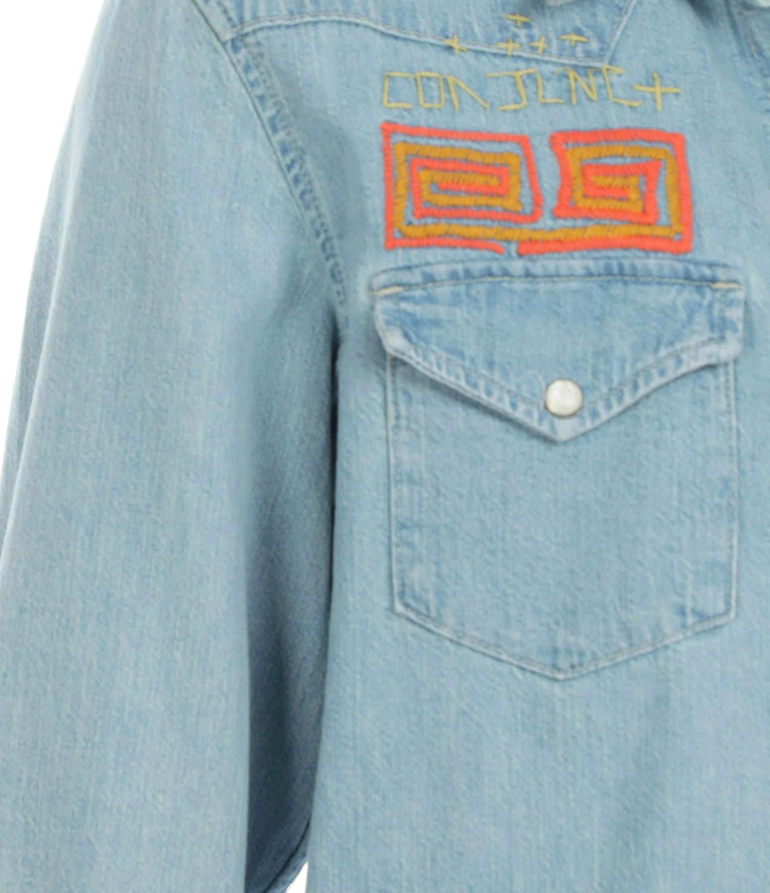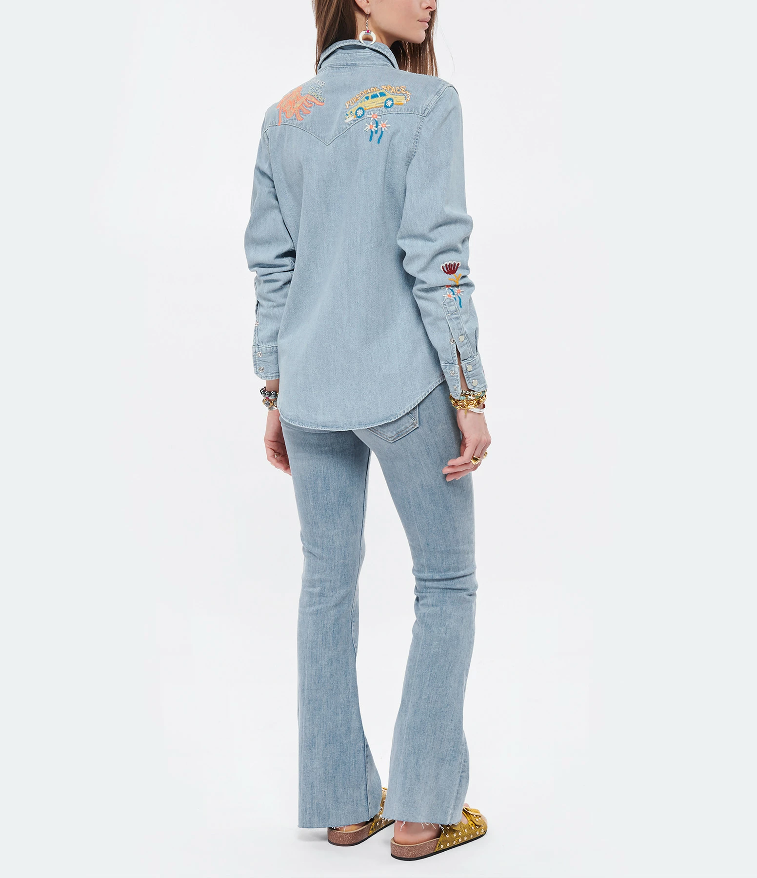 Chemise en denim bleu délavé avec broderies multicolores. Col chemise. Manches longues. Fermeture boutonnée. Deux poches plaquées à rabats sur la poitrine. Coupe droite. Base arrondie.
