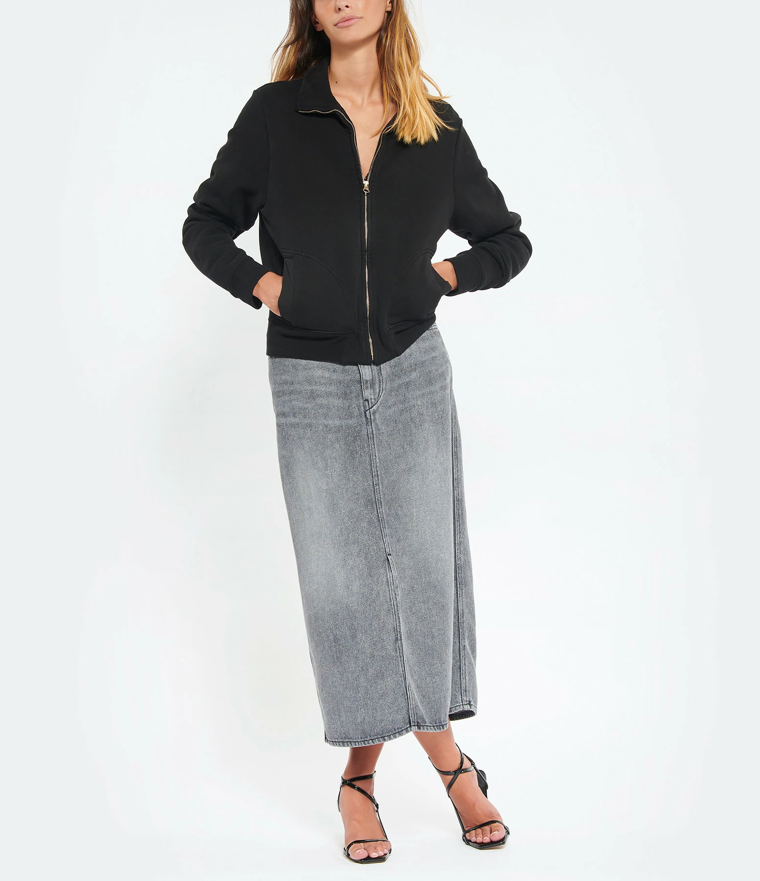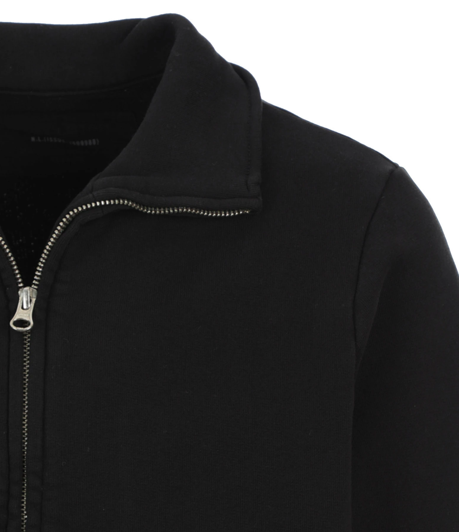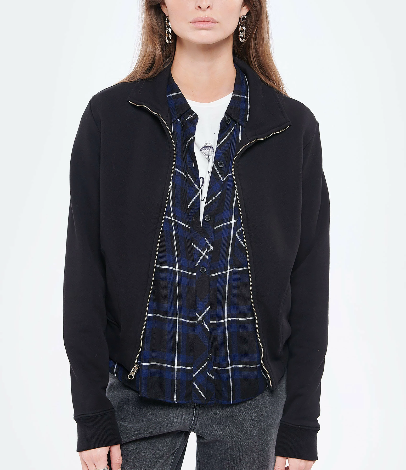 Veste courte en coton noir. Fermeture zippée. Col montant. Manches longues. Deux poches. Coupe droite. Base droite.