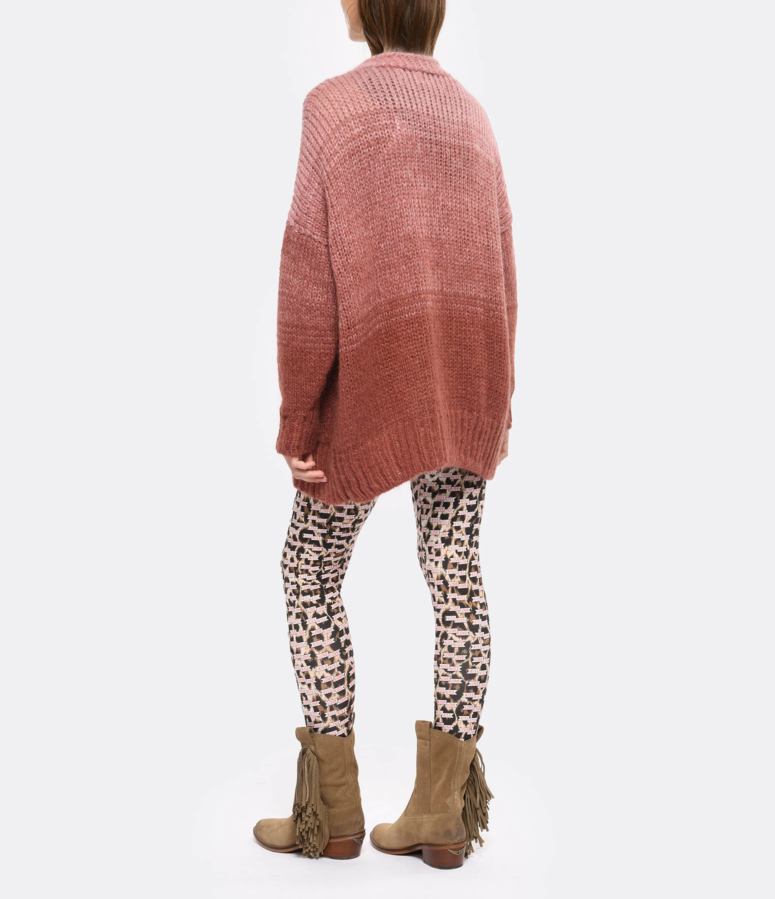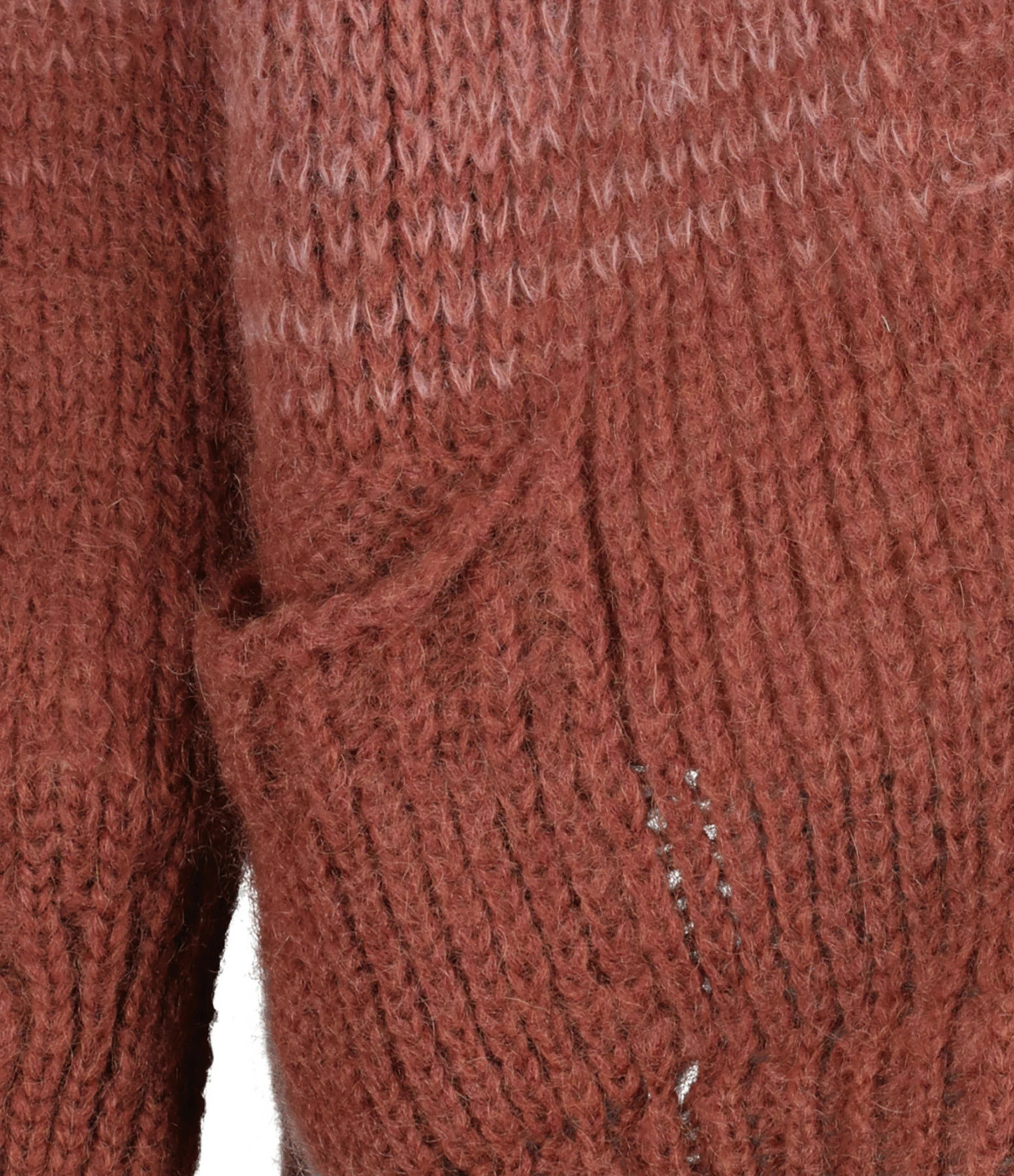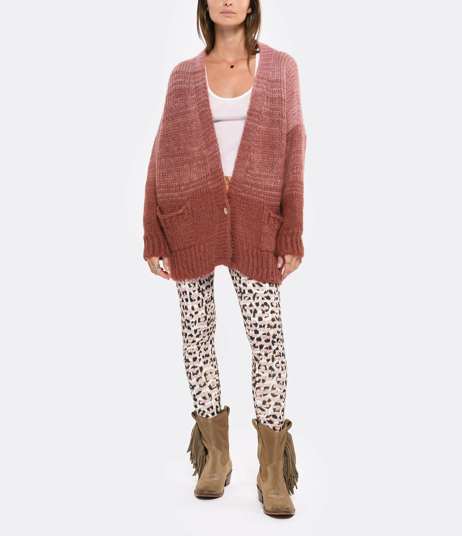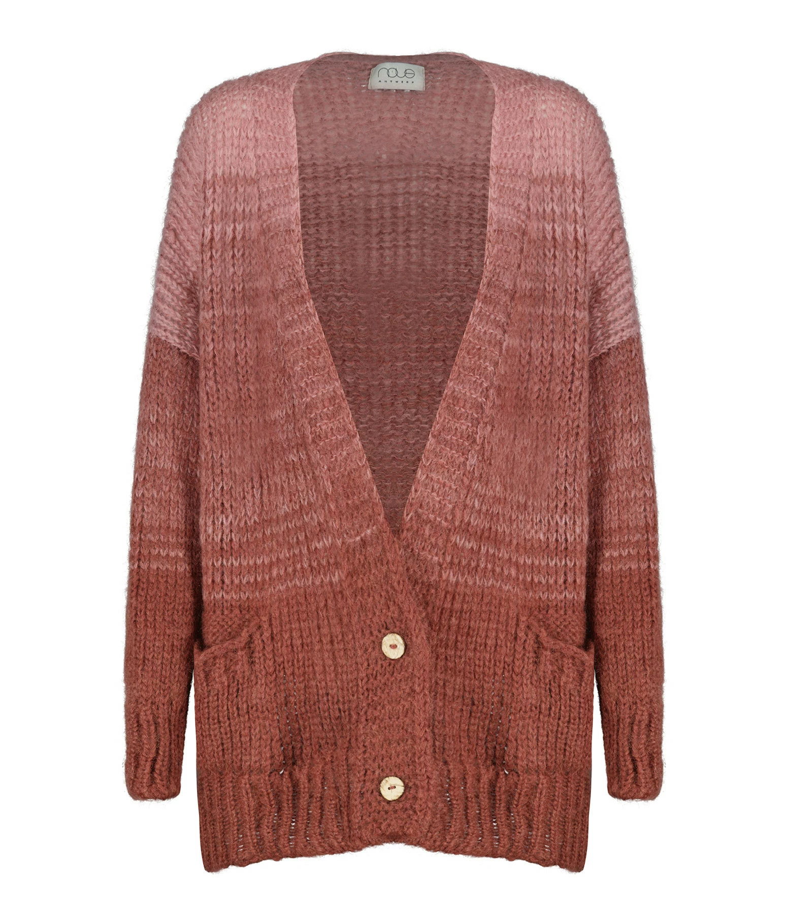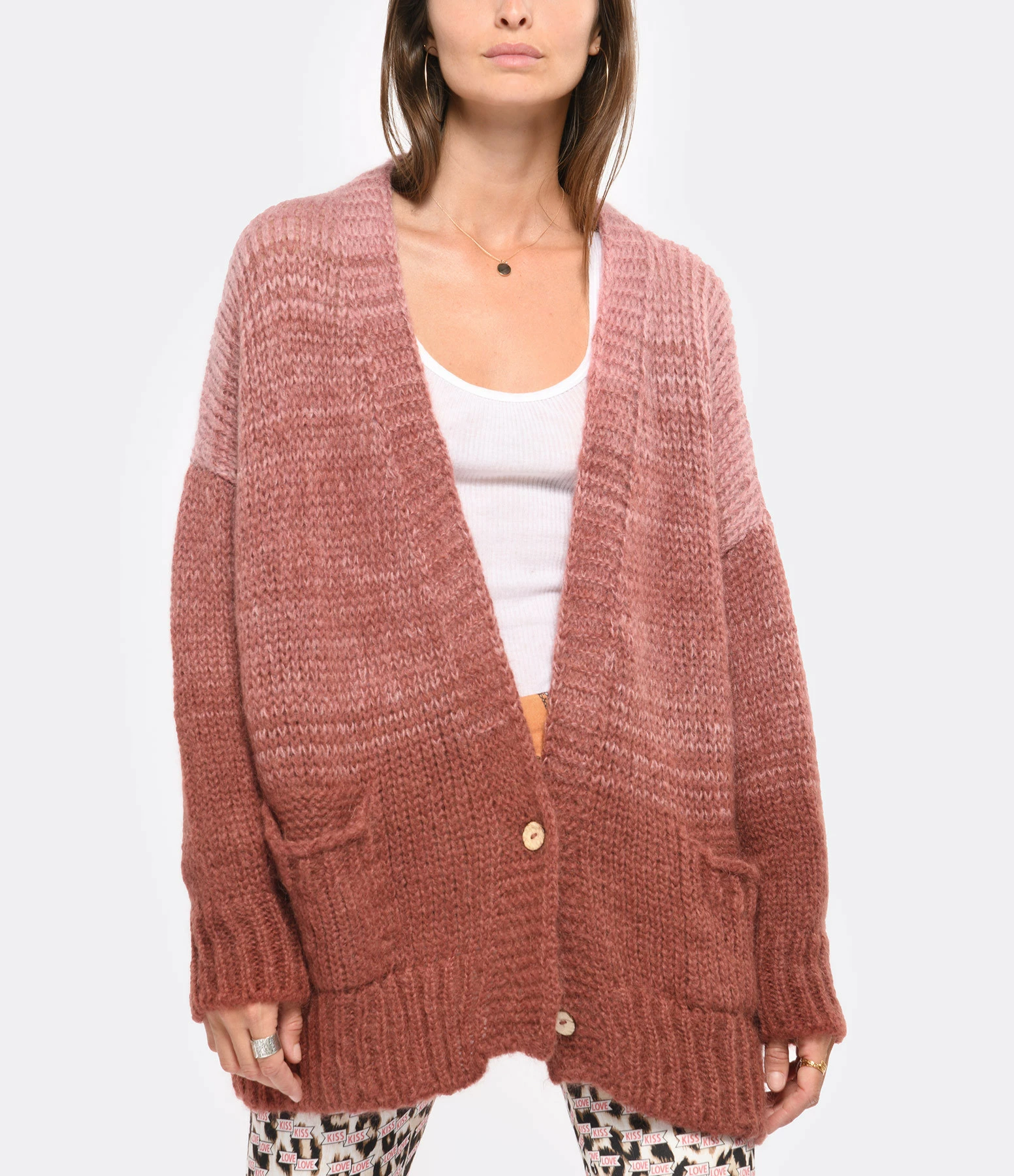 Cardigan en grosse maille rouge dégradée. Manches longues resserrées aux poignets. Deux poches plaquées. Fermeture par boutons. Coupe oversize. Base droite. Non doublé.