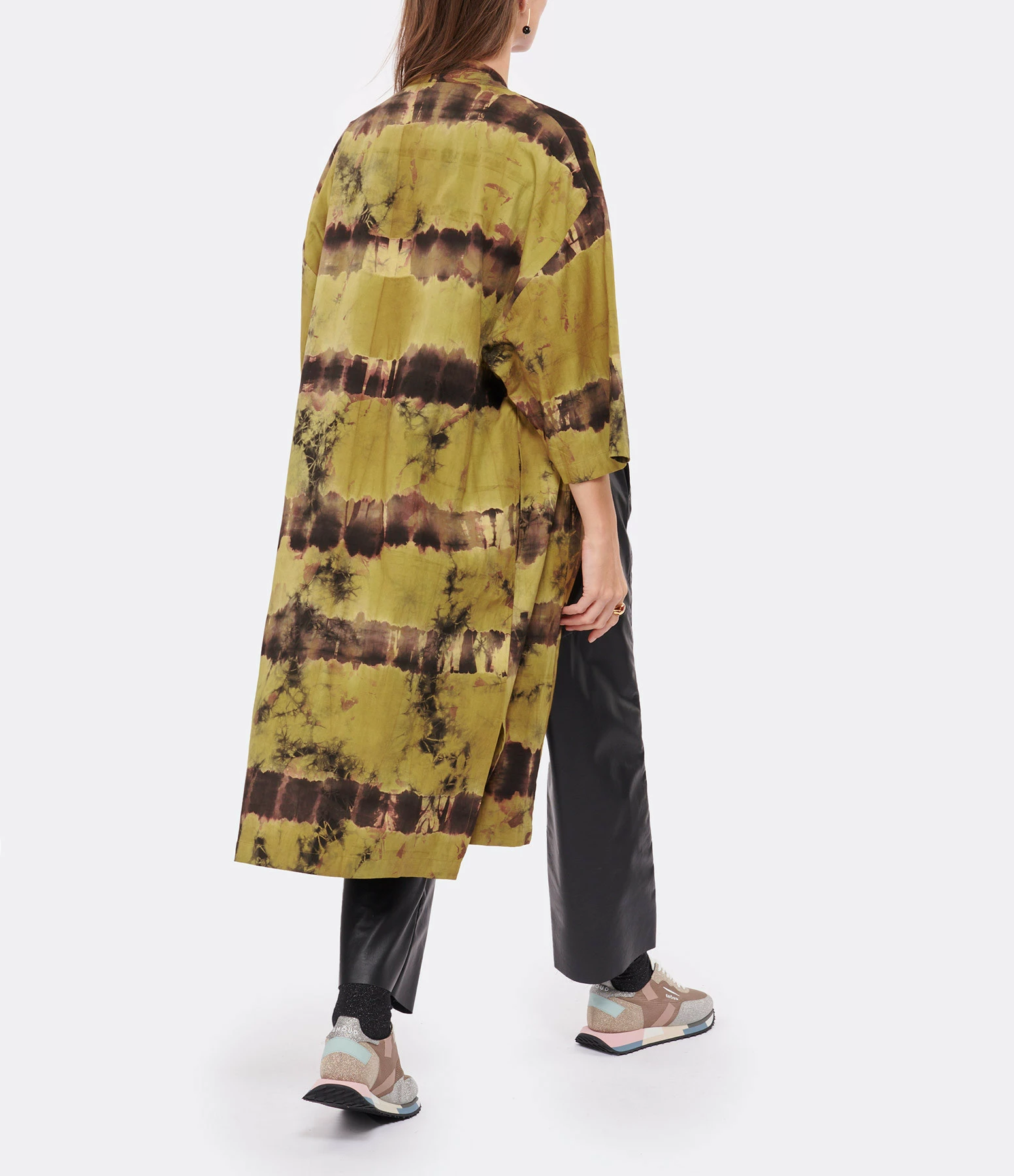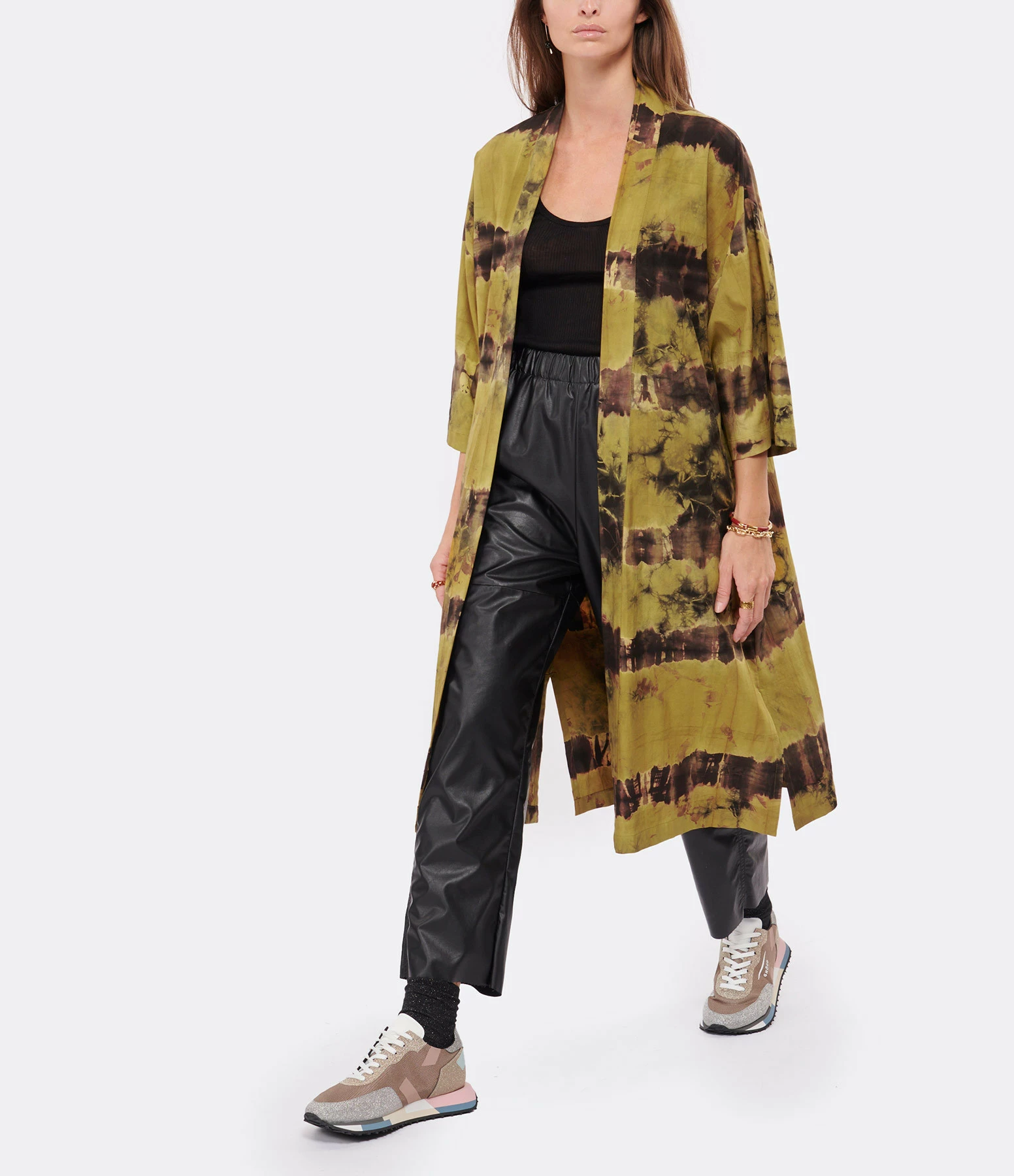 Kimono long à imprimé tie and dye dans des tons jaune curry et marron. Encolure ouverte. Manches courtes amples. Deux poches prises dans les coutures latérales. Fentes latérales. Coupe ample. Base droite. Non doublé.