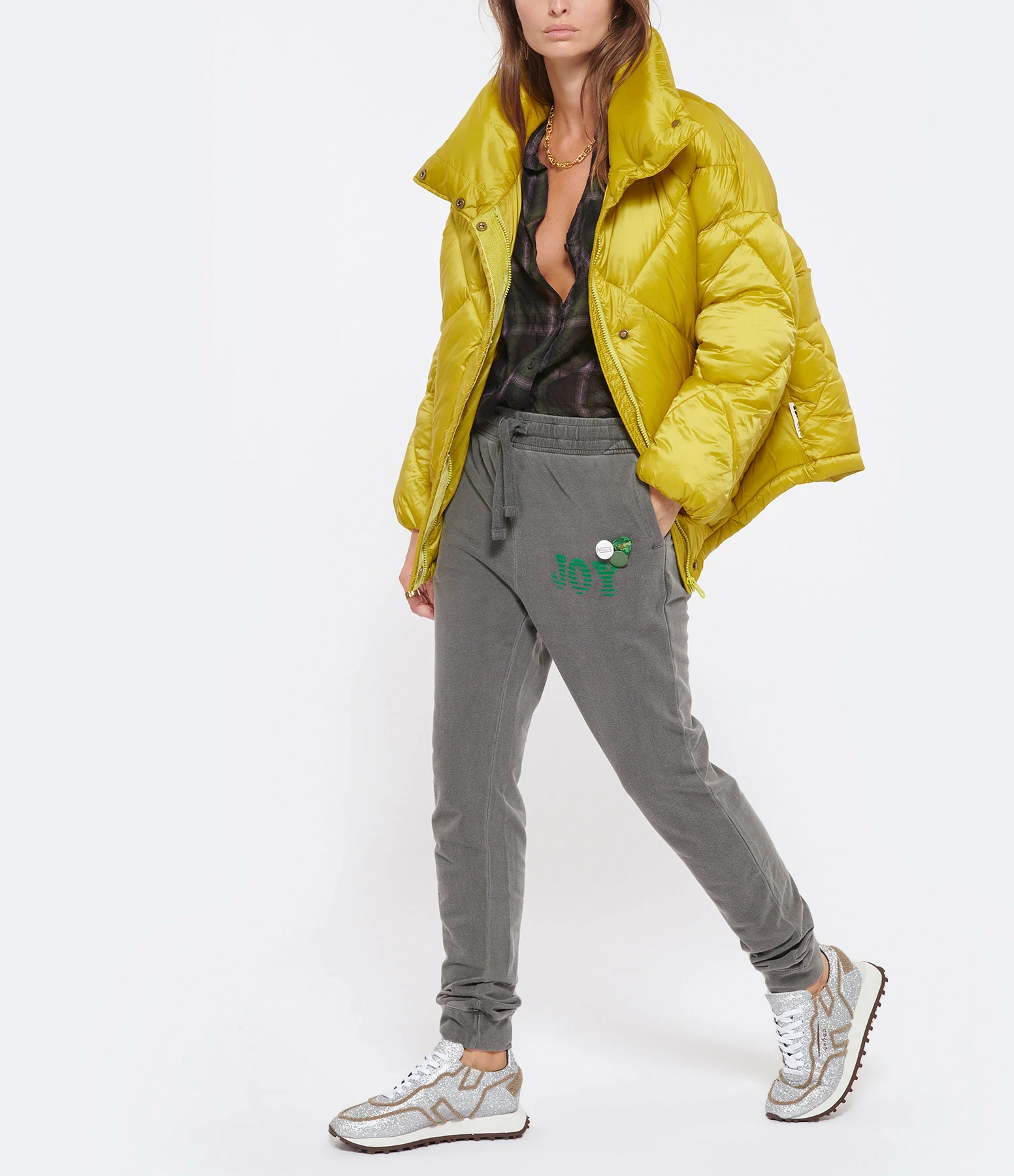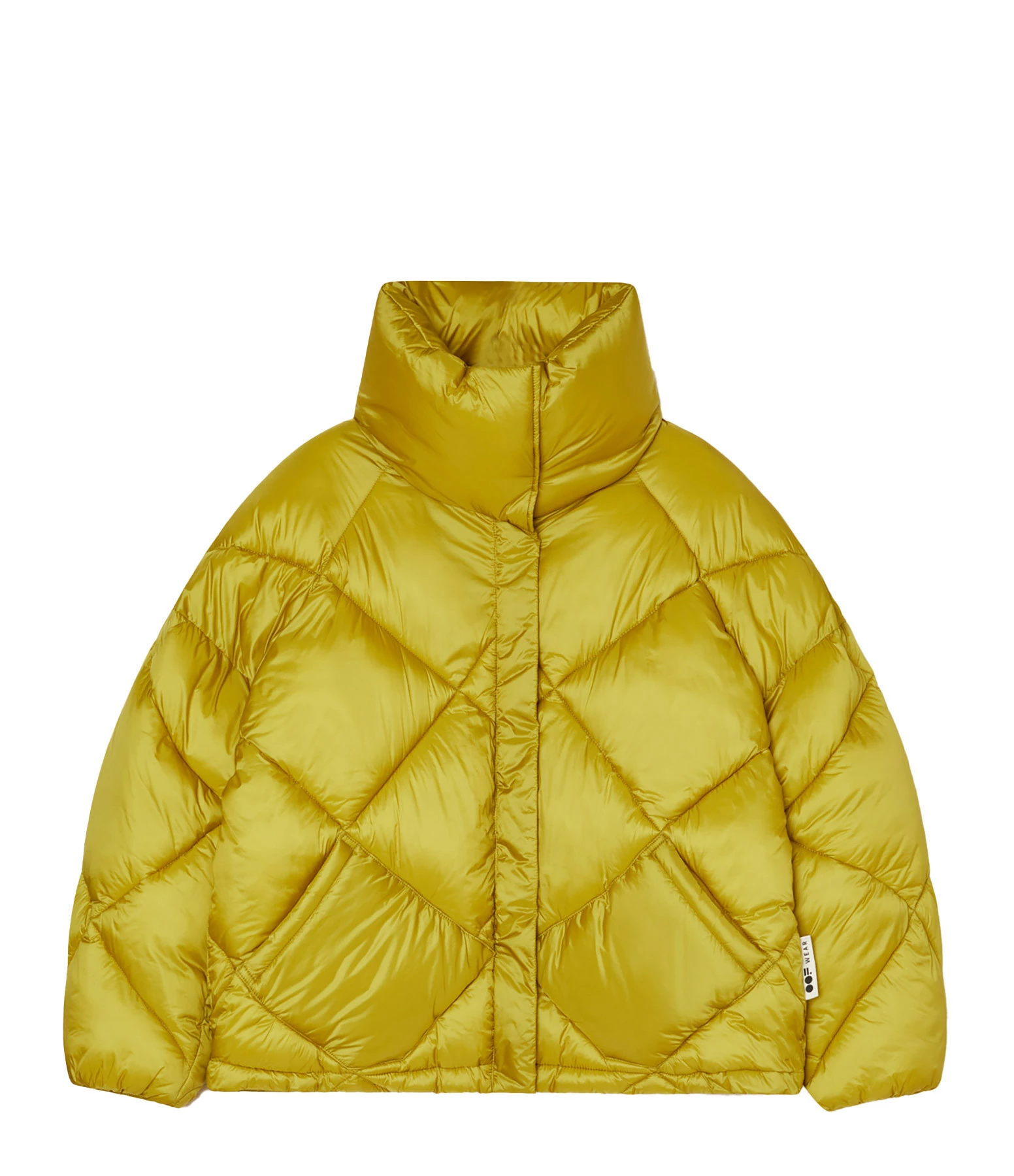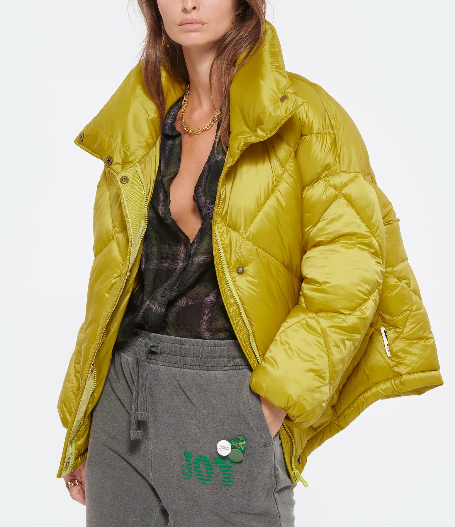 Doudoune matelassée vert/jaune. Col montant. Manches longues. Fermeture par zip et boutons pressionnés. Deux poches italiennes latérales. Coupe droite. Base droite ajustable par cordons élastiques. Doublée.