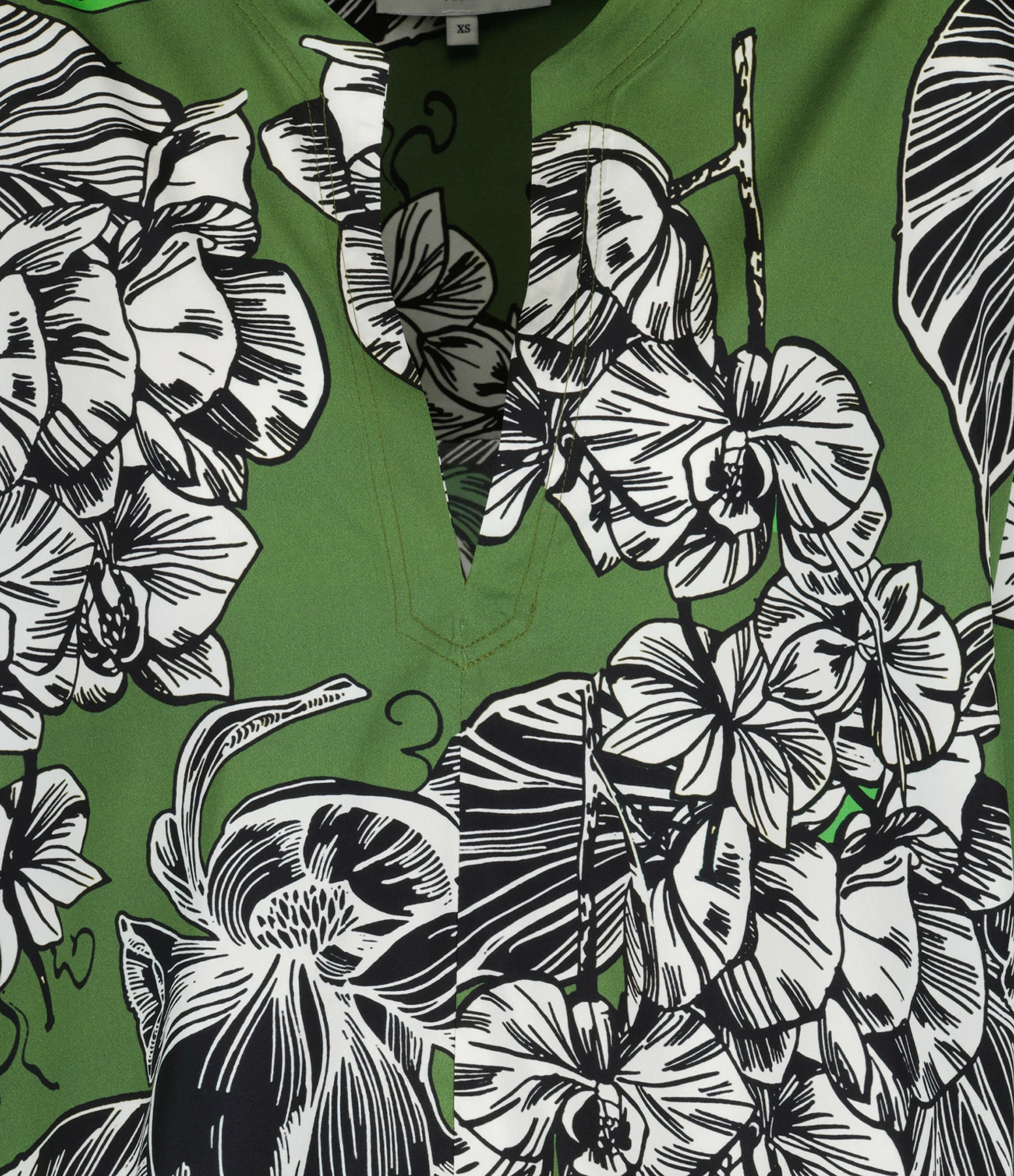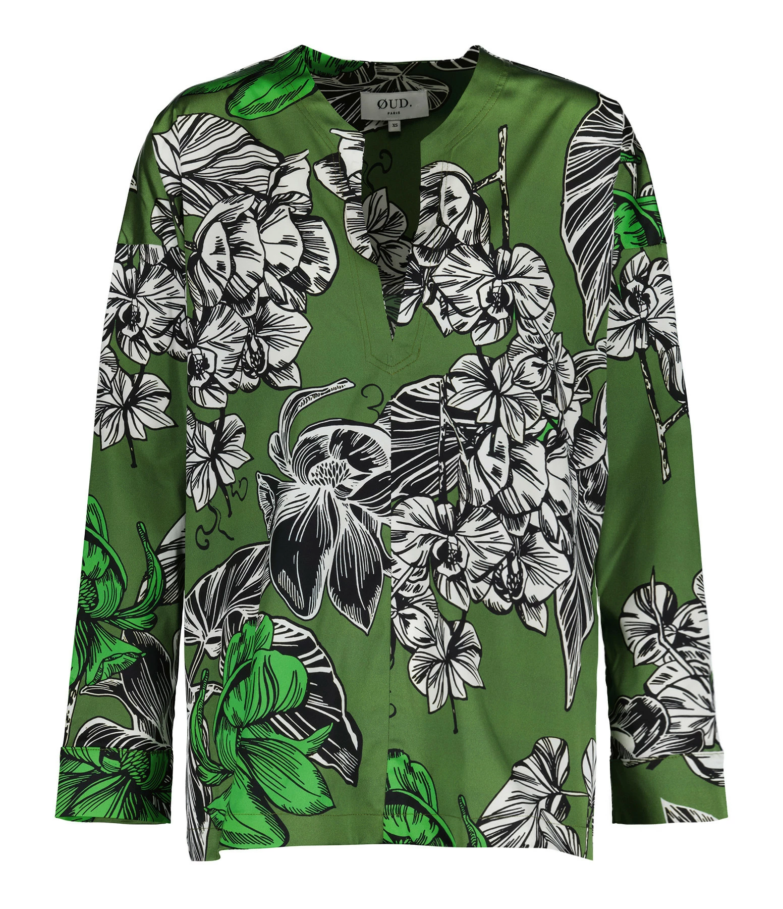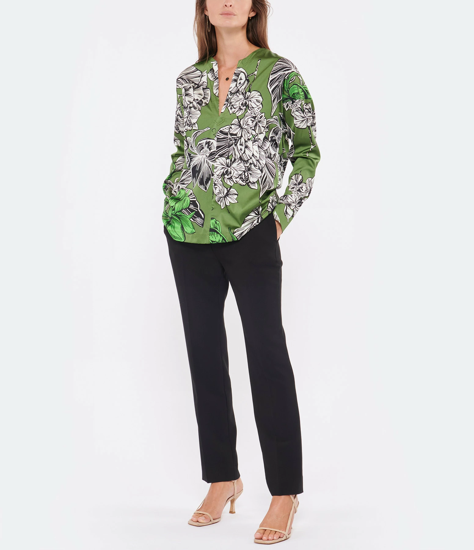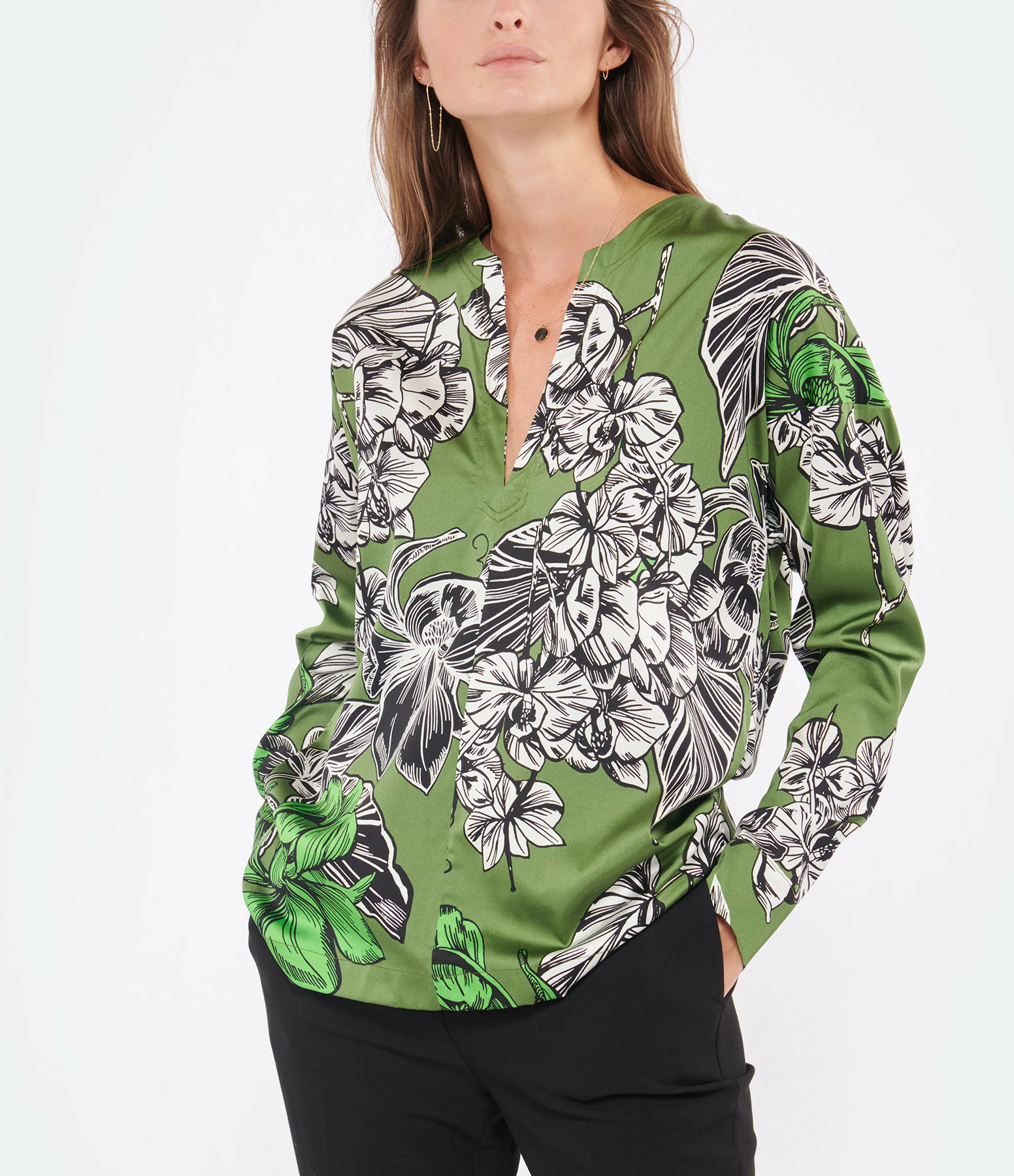 Blouse en satin de soie à motif fleur vert. Col tunisien. Manches longues avec poignets rabattus. Coupe droite ample. Base droite.