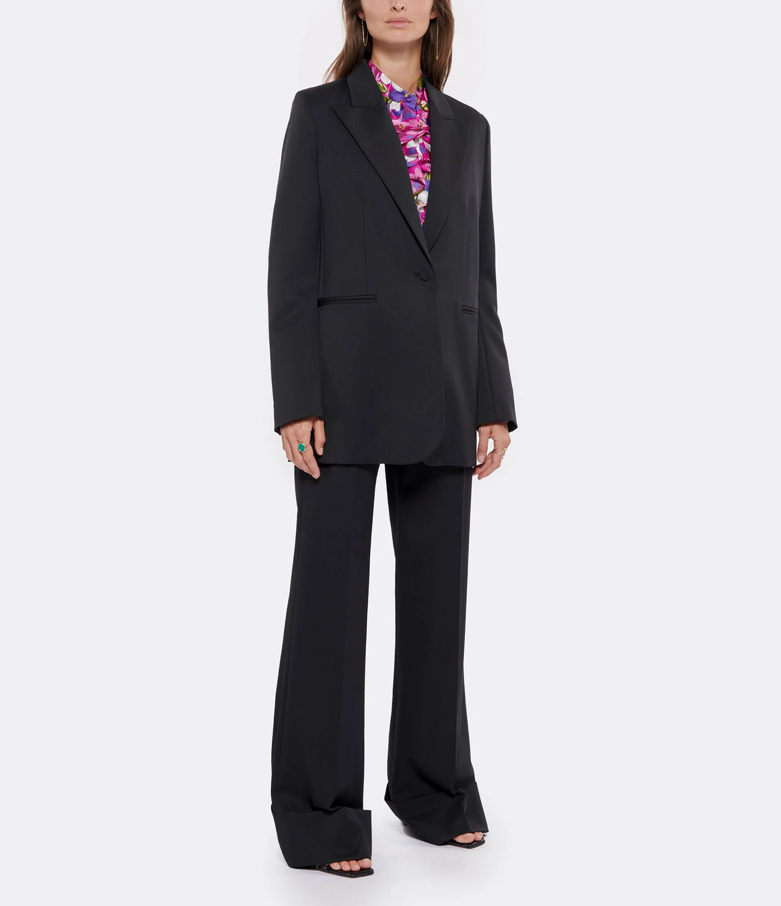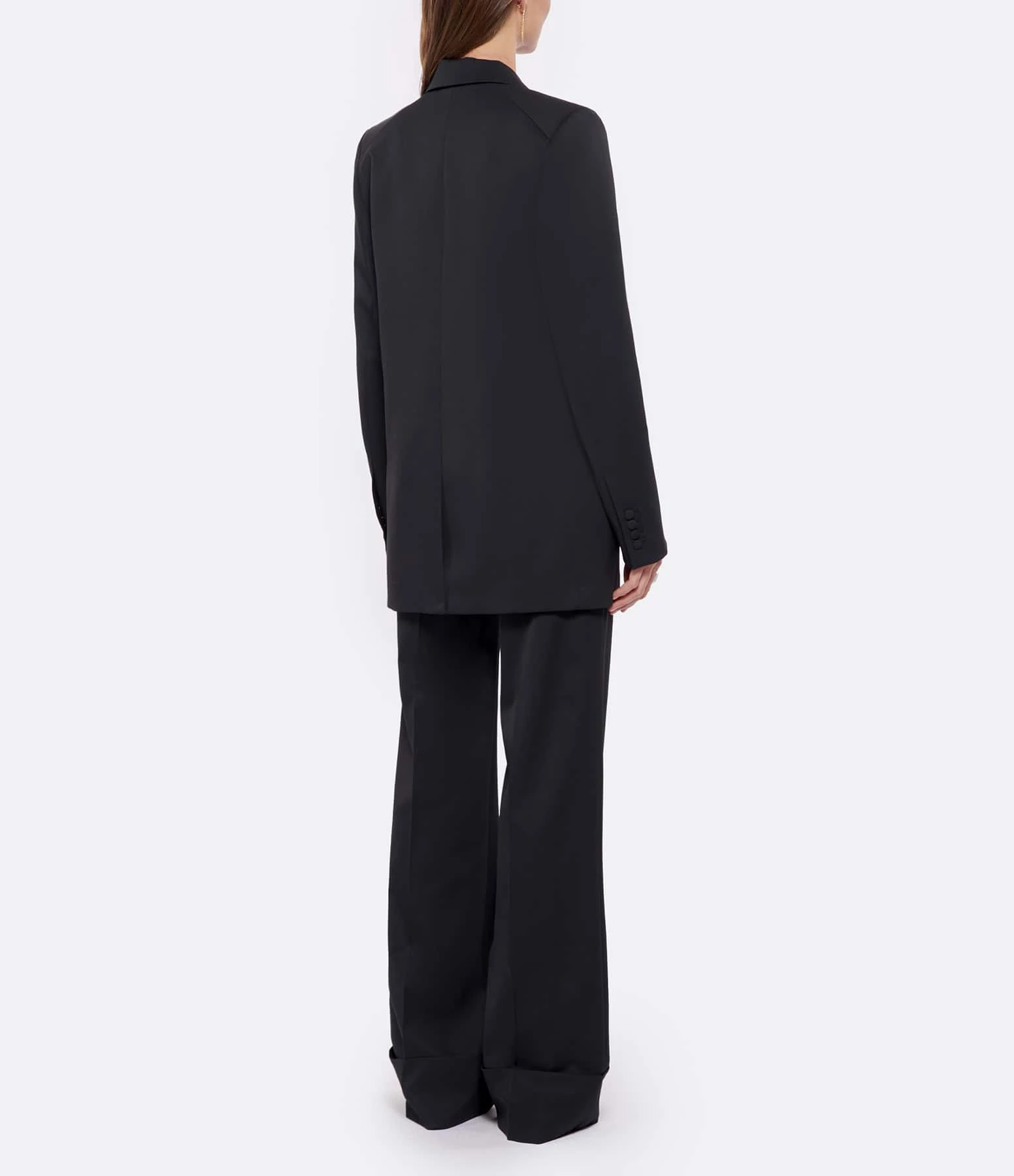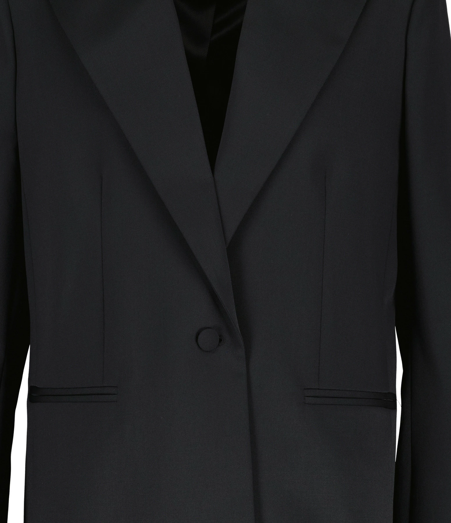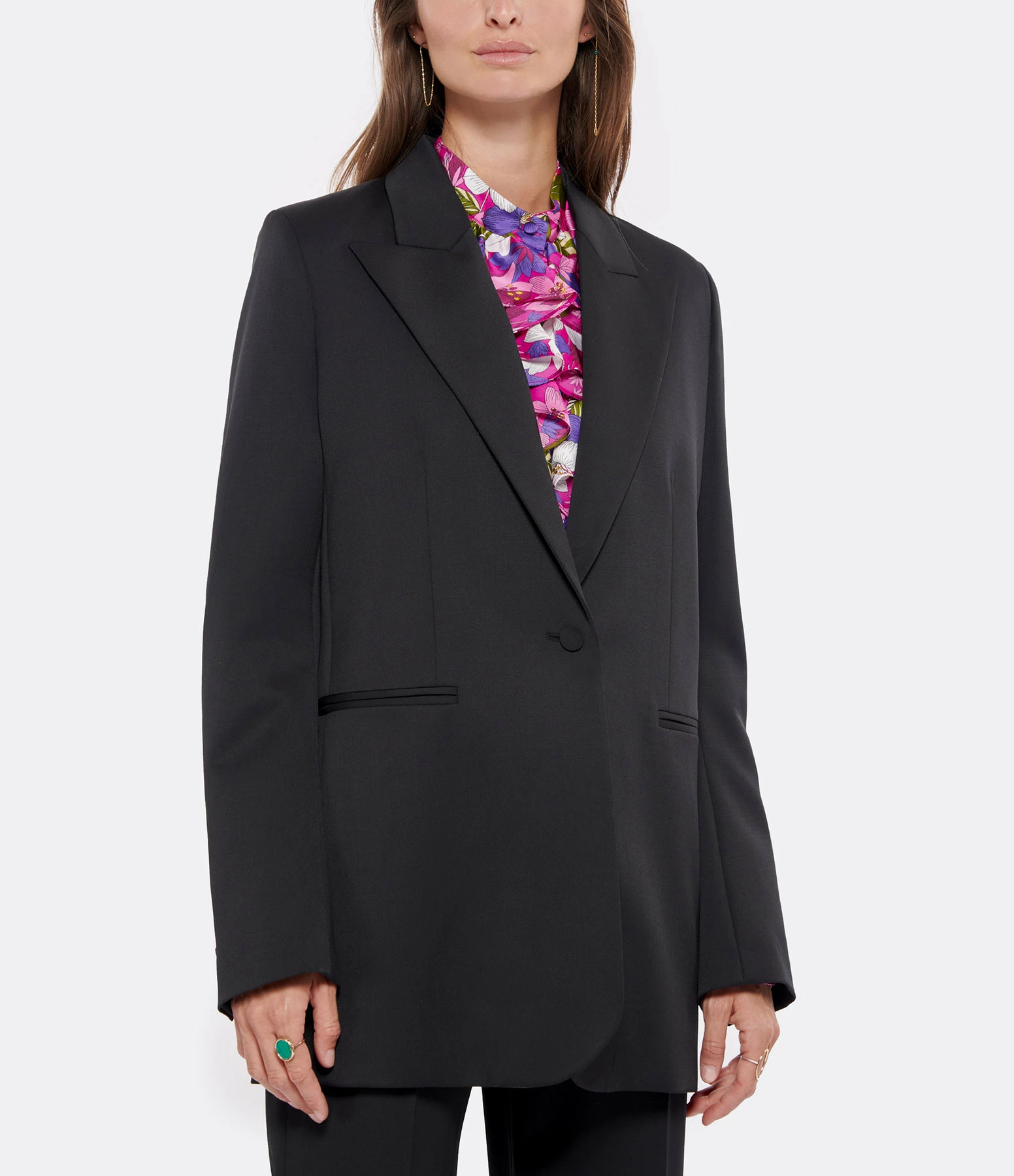 Veste blazer en laine mélangée noire. Col tailleur en pique. Fermeture boutonnée sur le devant : simple boutonnage avec un bouton noir. Manches longues tailleur avec fentes boutonnées. Epaulettes. Deux fausses poches passepoilées sur le devant. Une fente au milieu dos. Coupe droite ample. Base arrondie. Doublée.