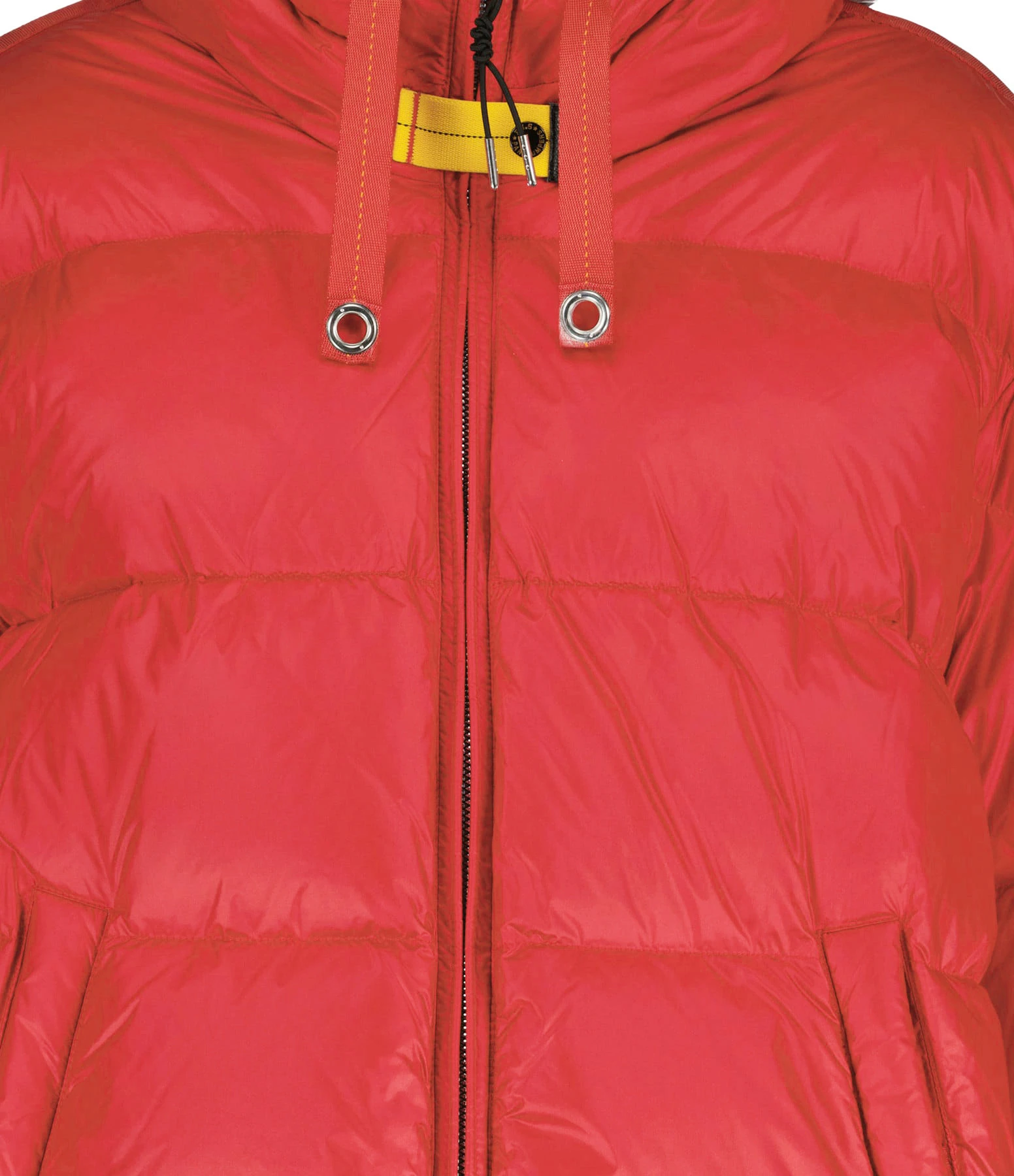 Doudoune courte en tissu technique rouge. Col montant à capuche avec liens de serrage et patte de serrage pressionnée. Manches longues. Ecusson avec logo sur la manche gauche. Fermeture zippée sur le devant. Logo gravé sur le curseur du zip. Deux poches raglans pressionnées sur le devant. Une poche plaquée intérieure. Coupe droite. Base droite élastiquée.