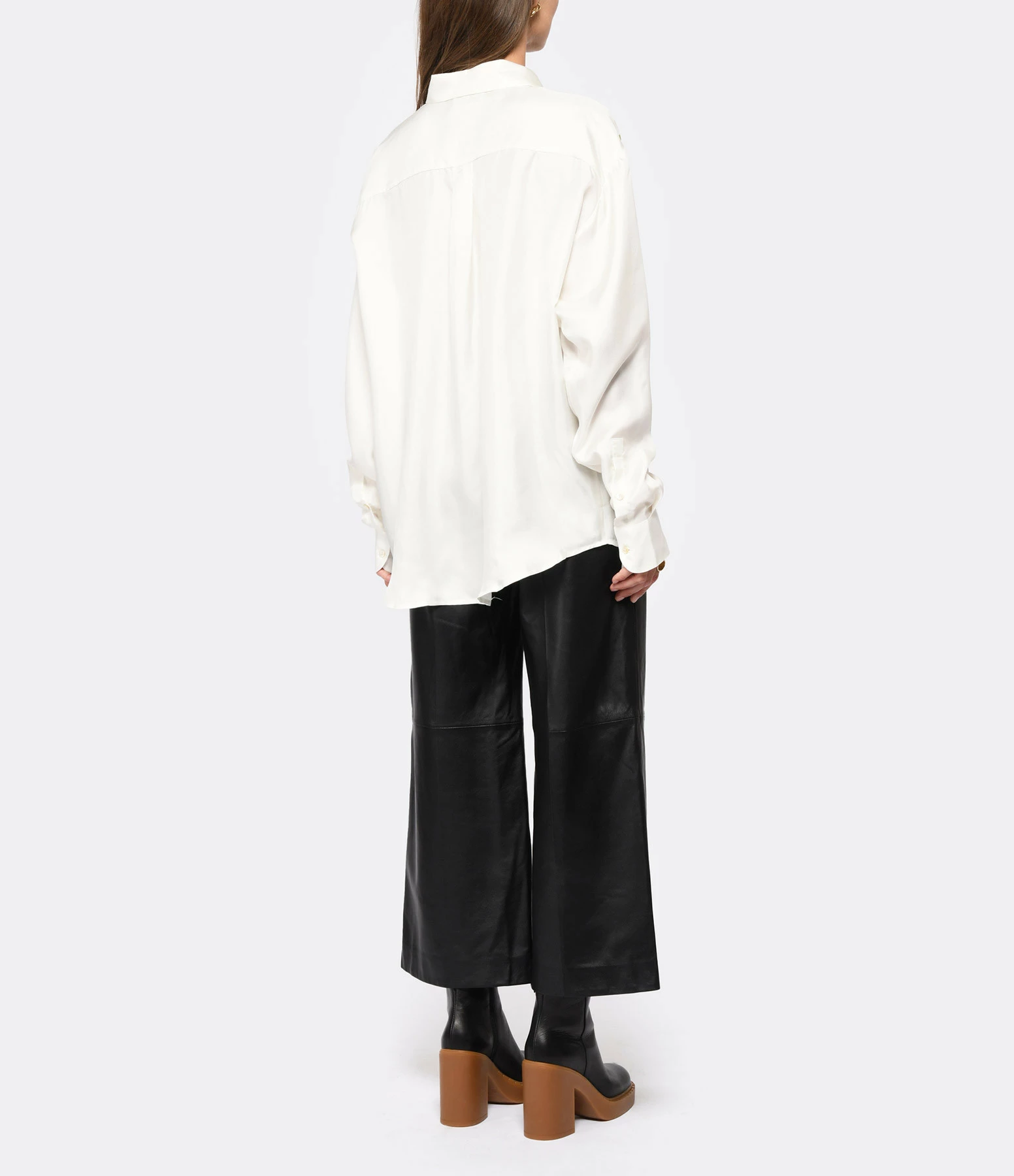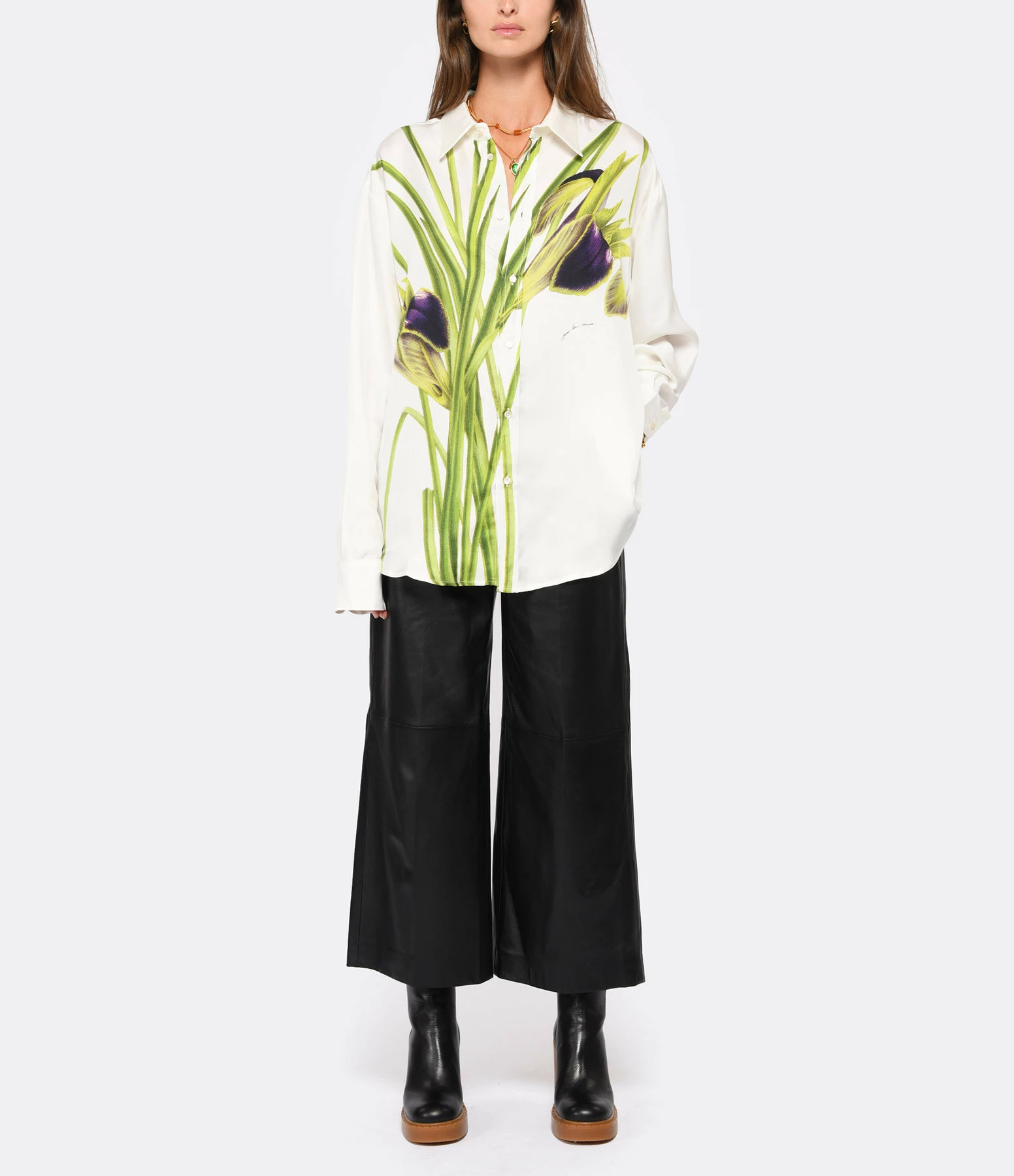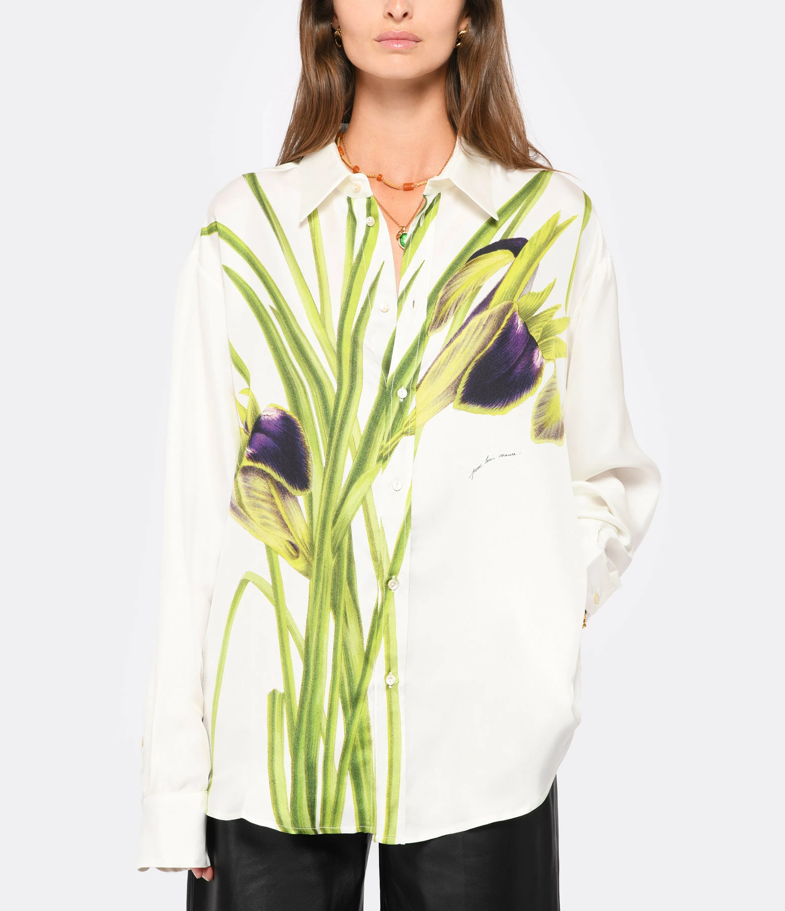 Chemise en soie blanche ornée d’un imprimé floral sur le devant. Col chemise. Manches longues avec fentes et poignets boutonnés. Fermeture boutonnée sur le devant. Petits boutons blancs nacrés. Pli creux dans le dos. Coupe droite. Base arrondie.