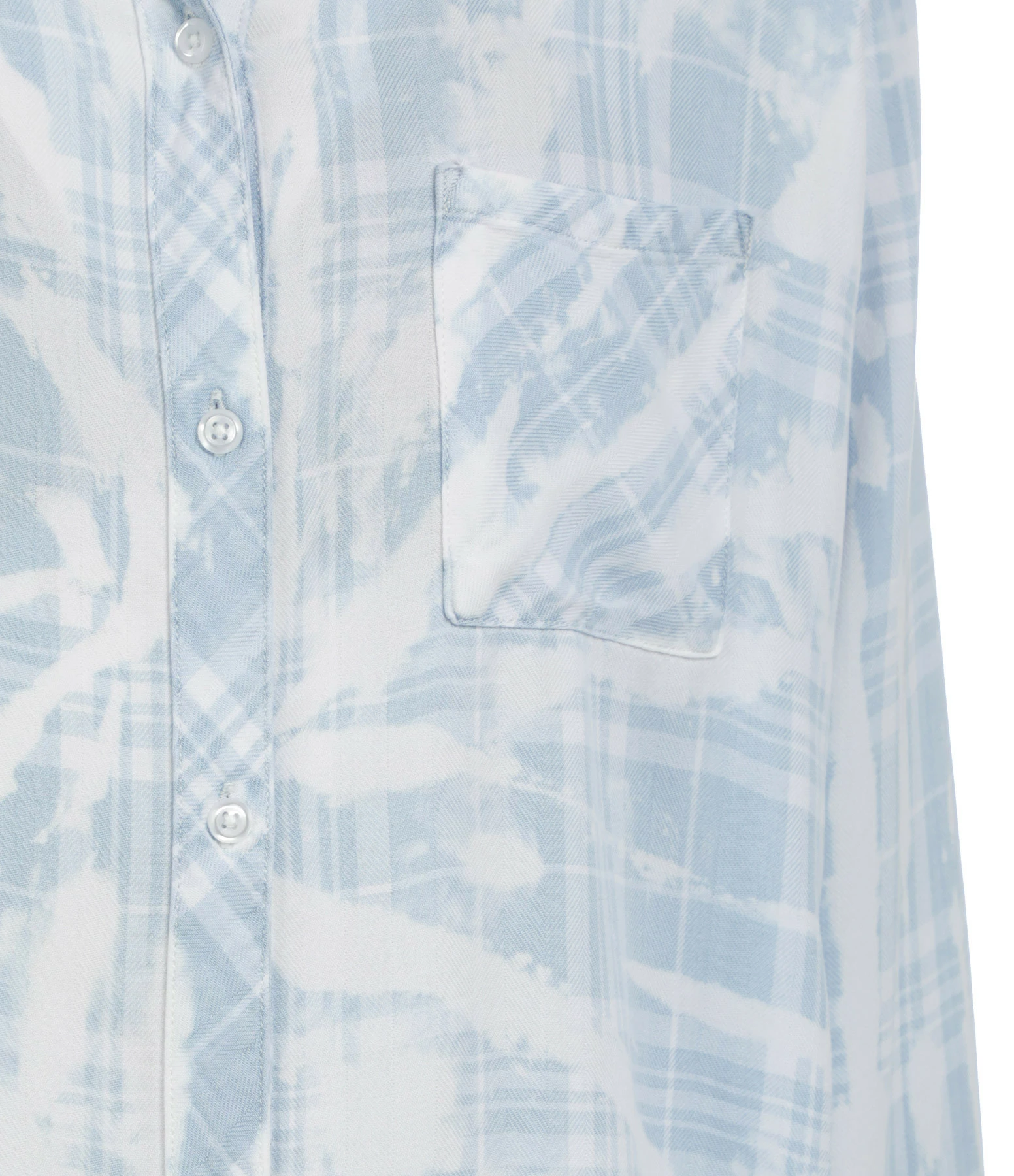 Chemise à imprimé bleu et blanc. Col chemise. Manches longues. Fermeture boutonnée. Une poche plaquée poitrine. Coupe droite. Base arrondie.