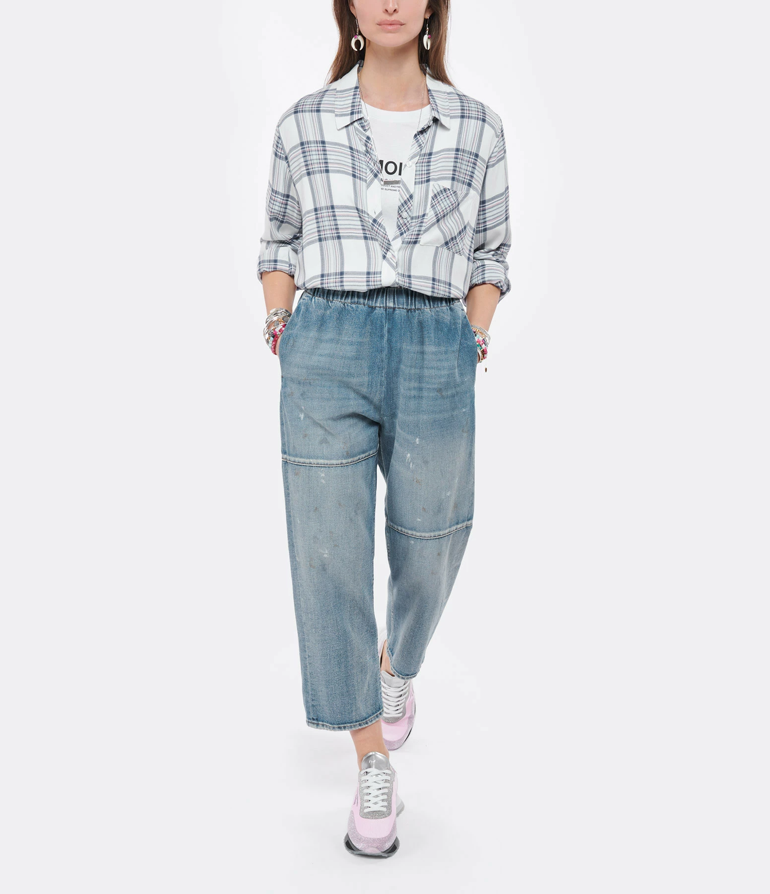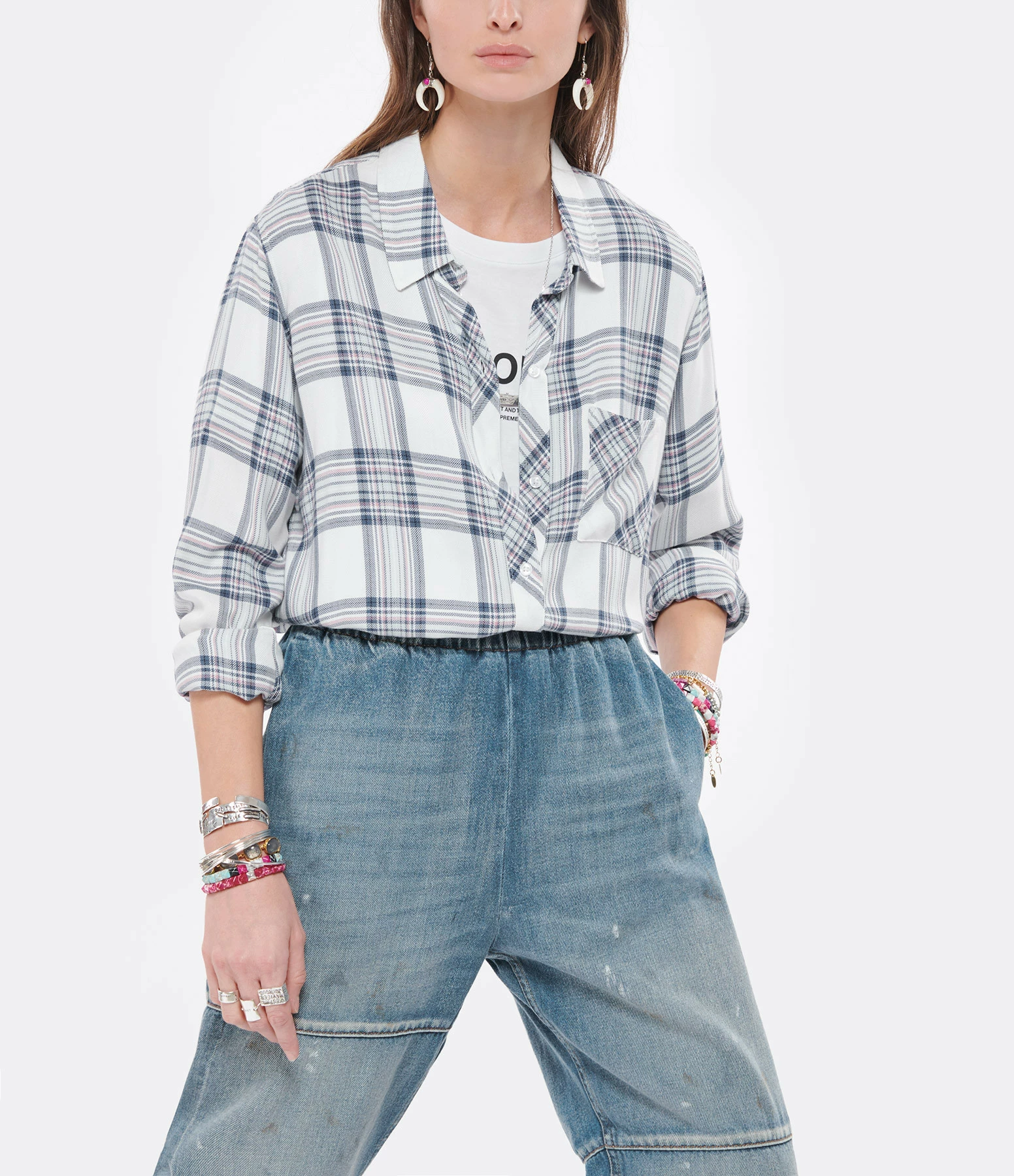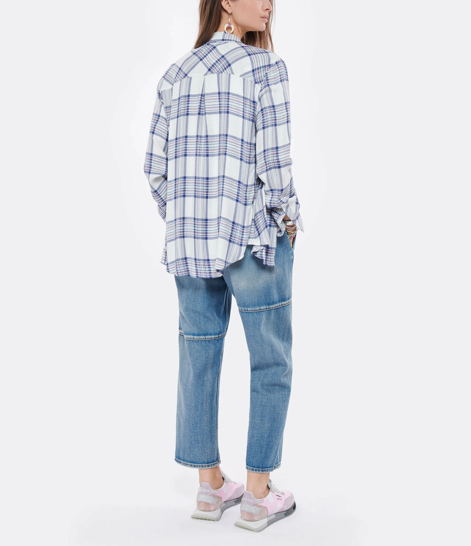 Chemise à carreaux bleus, blancs et roses. Col chemise. Manches longues. Fermeture boutonnée. Une poche plaquée poitrine. Coupe droite. Base arrondie.